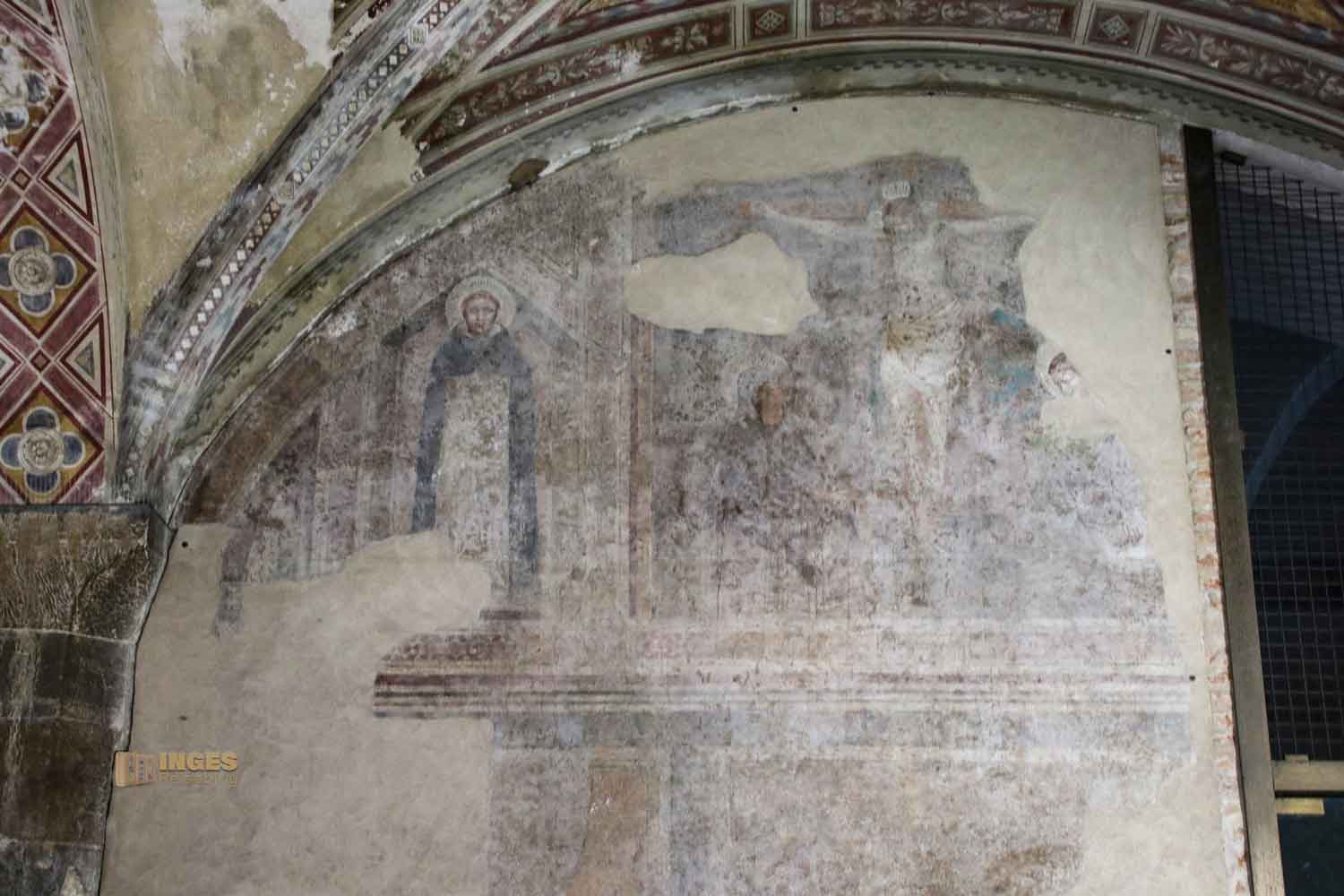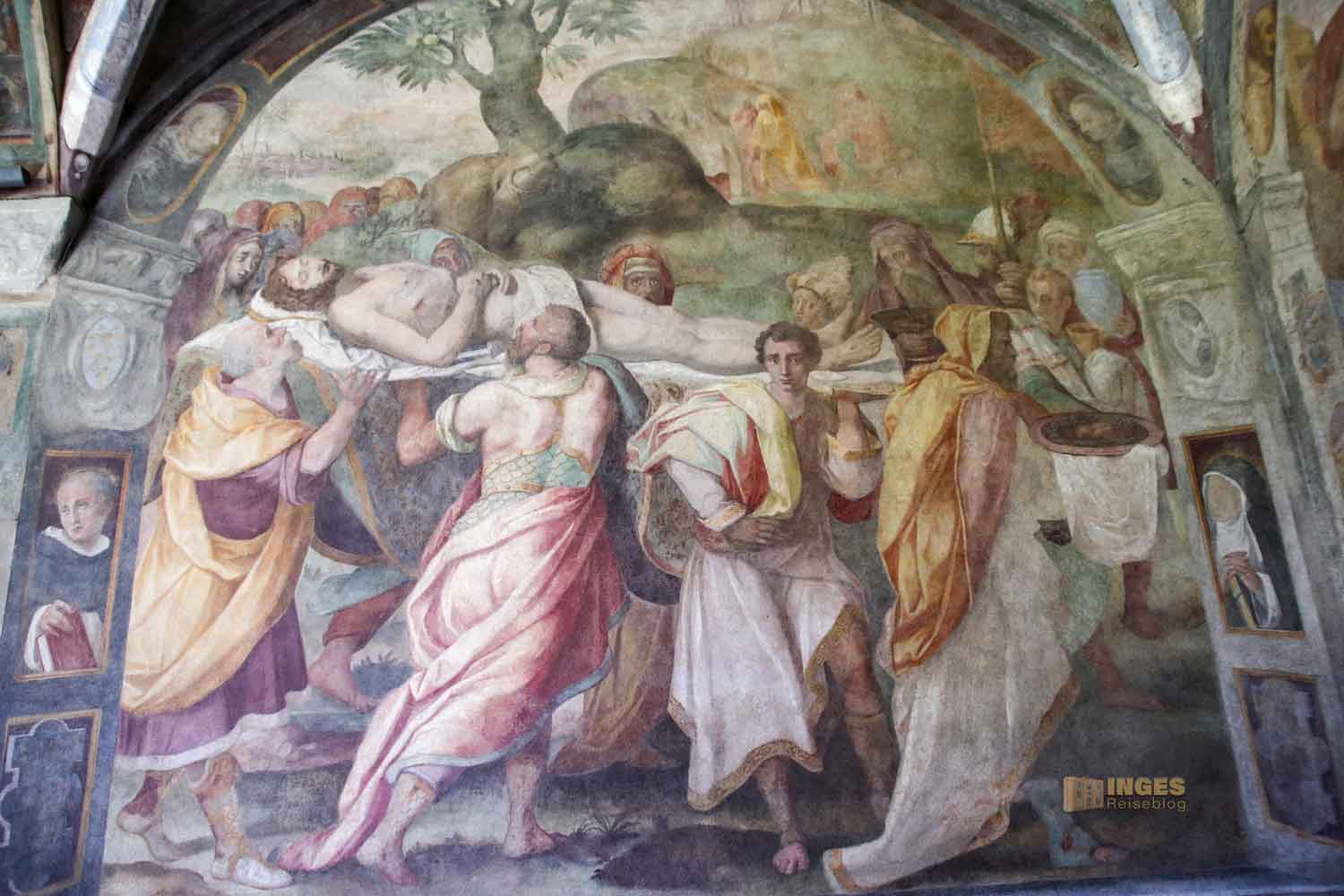erkennt. Zum einen, weil es in diesem 'Ein-Weg-Gang' nur gedämpftes Licht gibt, zum anderen, weil die Fresken teilweise in einem sehr geschädigten Zustand sind. Da hat die große Flut vom 4. November 1966 dann auch noch ihren Teil dazu geleistet. Dieses extreme Hochwasser hat nicht nur die Altstadt von Florenz unter Wasser gesetzt, sondern die gesamten Gebiete um den Arno. In der Folge musste der Kreuzgang jahrelang sogar geschlossen werden.