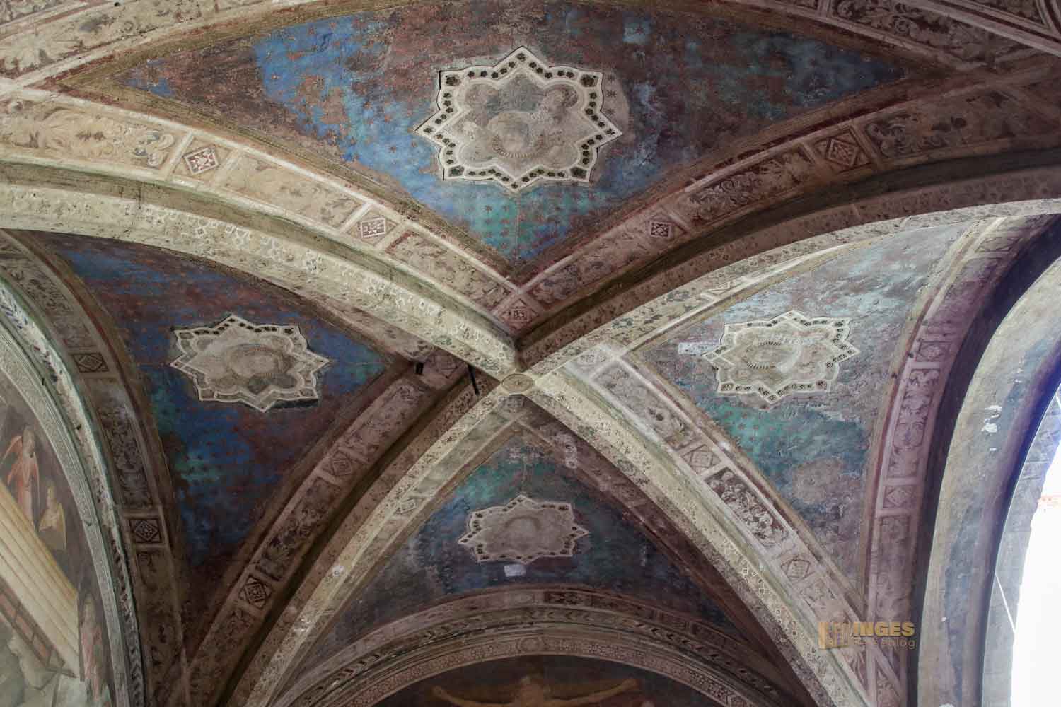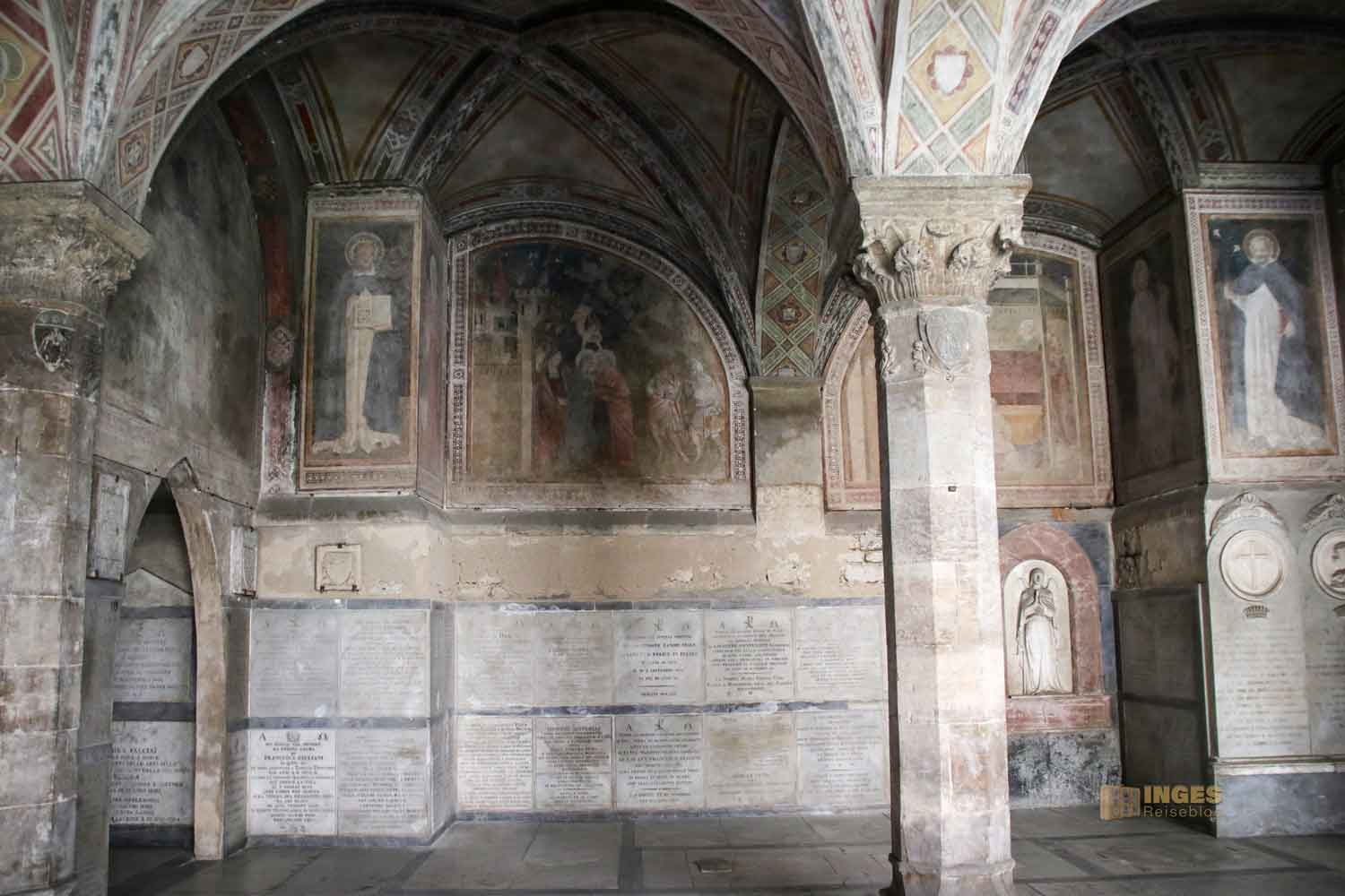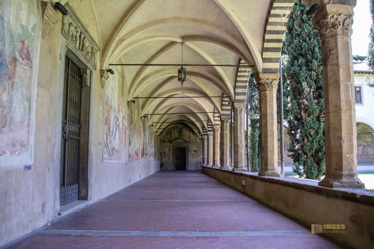 In dieser Zeit, in der nicht wirklich viel vom Kloster bekannt ist, war es noch so üblich, dass um die Kirche ein Friedhof angelegt war. Er soll der älteste Teil des Klosters sein, und der Friedhof lag tiefer als die Kirche. Das entspricht auch der Tatsache, dass man zur Kirche vom Kreuzgang her, eine Treppe hoch muss. Warum und weshalb? Ich kann es euch nicht sage, aber ab 1337 wurde dieser Teil des Kreuzgangs angelegt. Da waren mehrere Florentiner Künstler am Werk, die den Auftrag bekommen haben, die Fresken an Decke und Wänden des Kreuzgangs zu gestalten. Nardo di Cione (einer der Künstler) z.B. begegnet man auch in der Basilika Santa Maria Novella in der wunderschönen Freskenmalerei in der Strozzi-Kapelle.