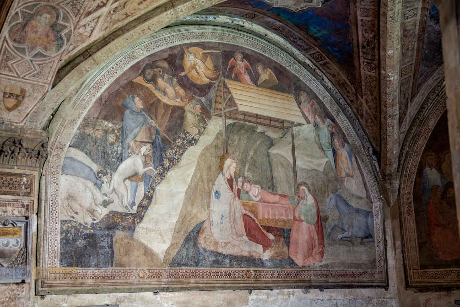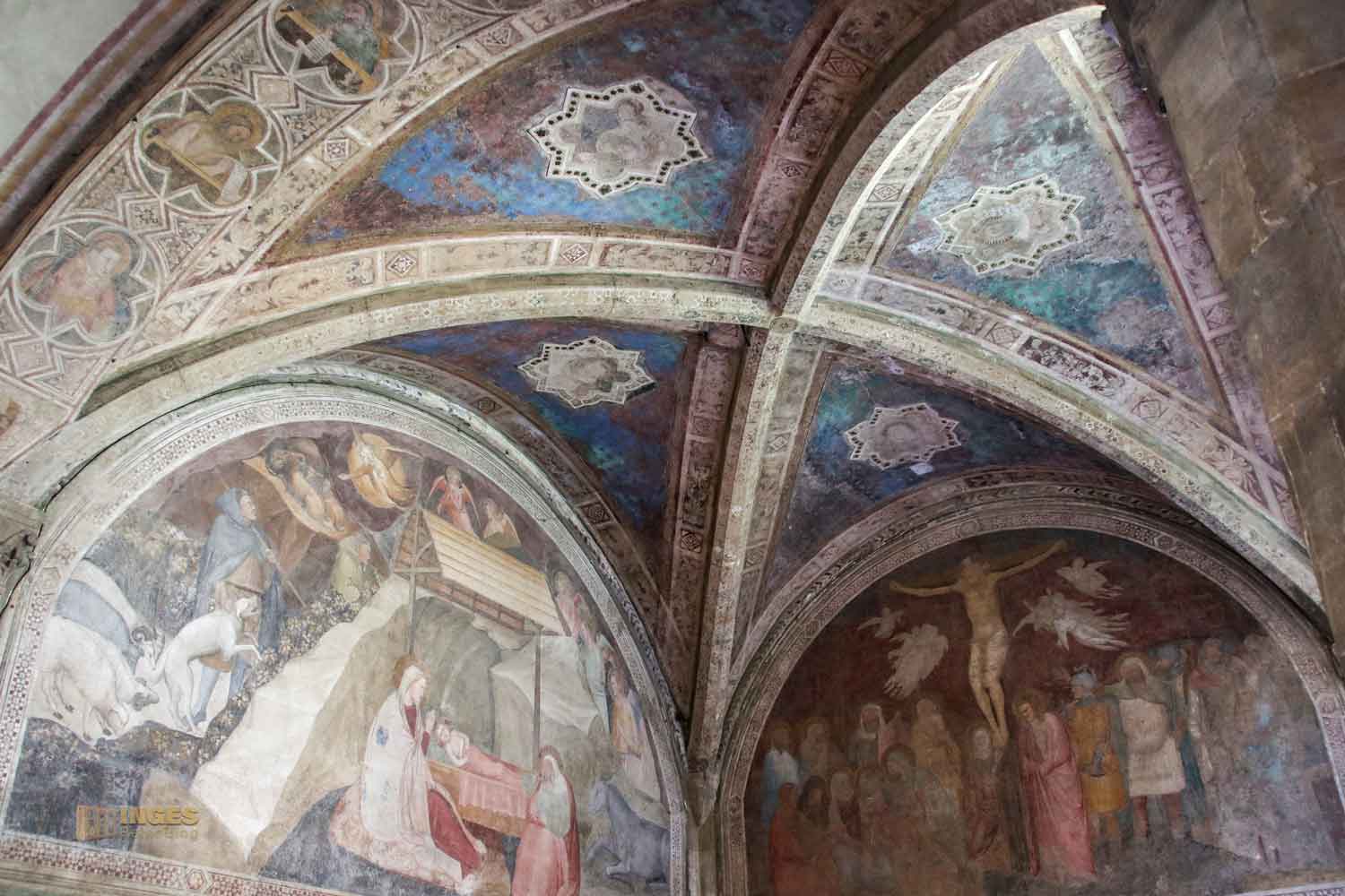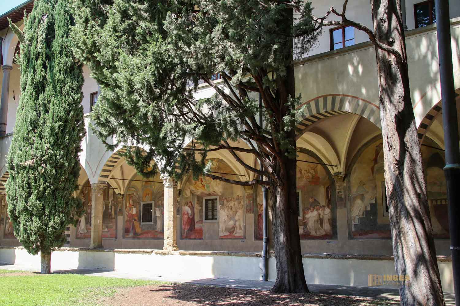 In dieser Zeit, in der nicht wirklich viel vom Kloster bekannt ist, war es noch so üblich, dass um die Kirche ein Friedhof angelegt war. Er soll der älteste Teil des Klosters sein, und der Friedhof lag tiefer als die Kirche. Das entspricht auch der Tatsache, dass man zur Kirche vom Kreuzgang her, eine Treppe hoch muss. Warum und weshalb? Ich kann es euch nicht sage, aber ab 1337 wurde dieser Teil des Kreuzgangs angelegt. Da waren mehrere Florentiner Künstler am Werk, die den Auftrag bekommen haben, die Fresken an Decke und Wänden des Kreuzgangs zu gestalten. Nardo di Cione (einer der Künstler) z.B. begegnet man auch in der Basilika Santa Maria Novella in der wunderschönen Freskenmalerei in der Strozzi-Kapelle.