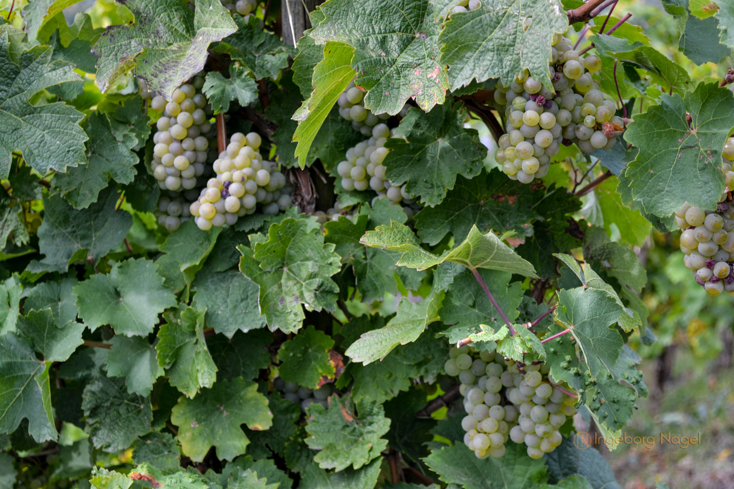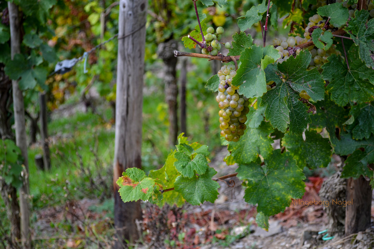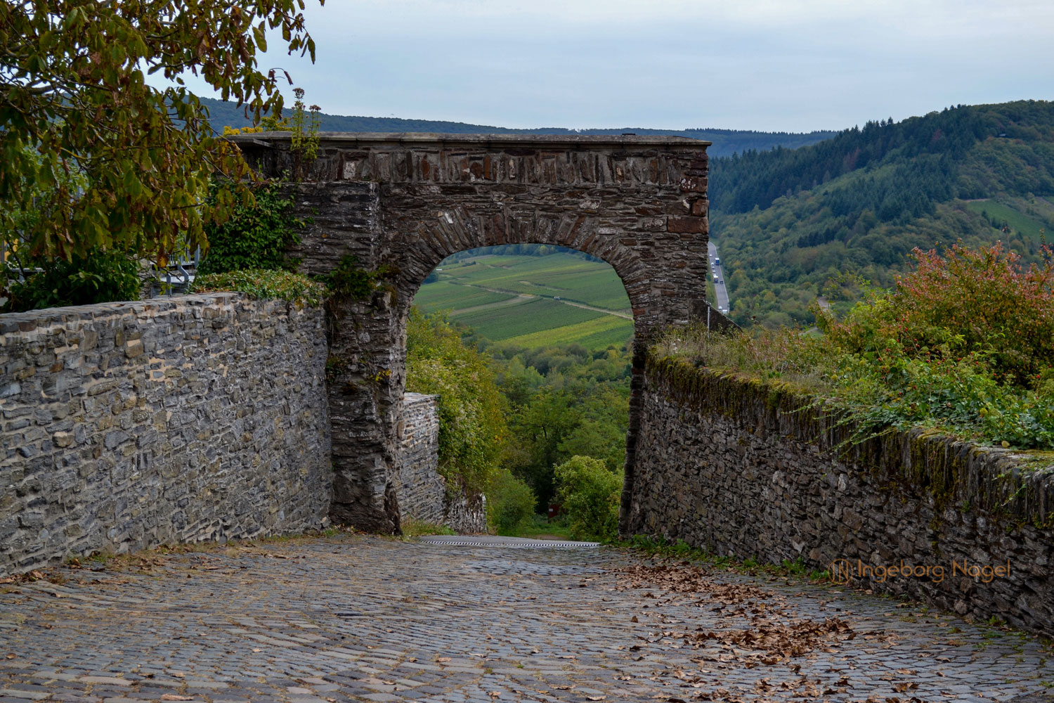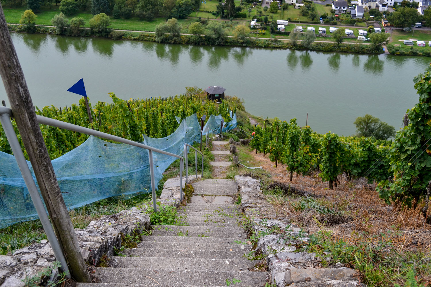 Wunderschön liegt die Marienburg inmitten der Weinberge. Jetzt mitten in der Weinlese hängen die Rebstöcke teilweise noch gut gefüllt, und mit dem Blick nach unten zur Mosel erkennt man, wie steil die Hänge sind. Allerdings hier nicht vergleichbar mit der Calmontregion ganz in der Nähe mit den steilsten Weinhängen Europas.
