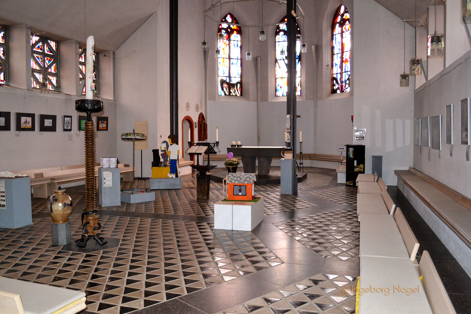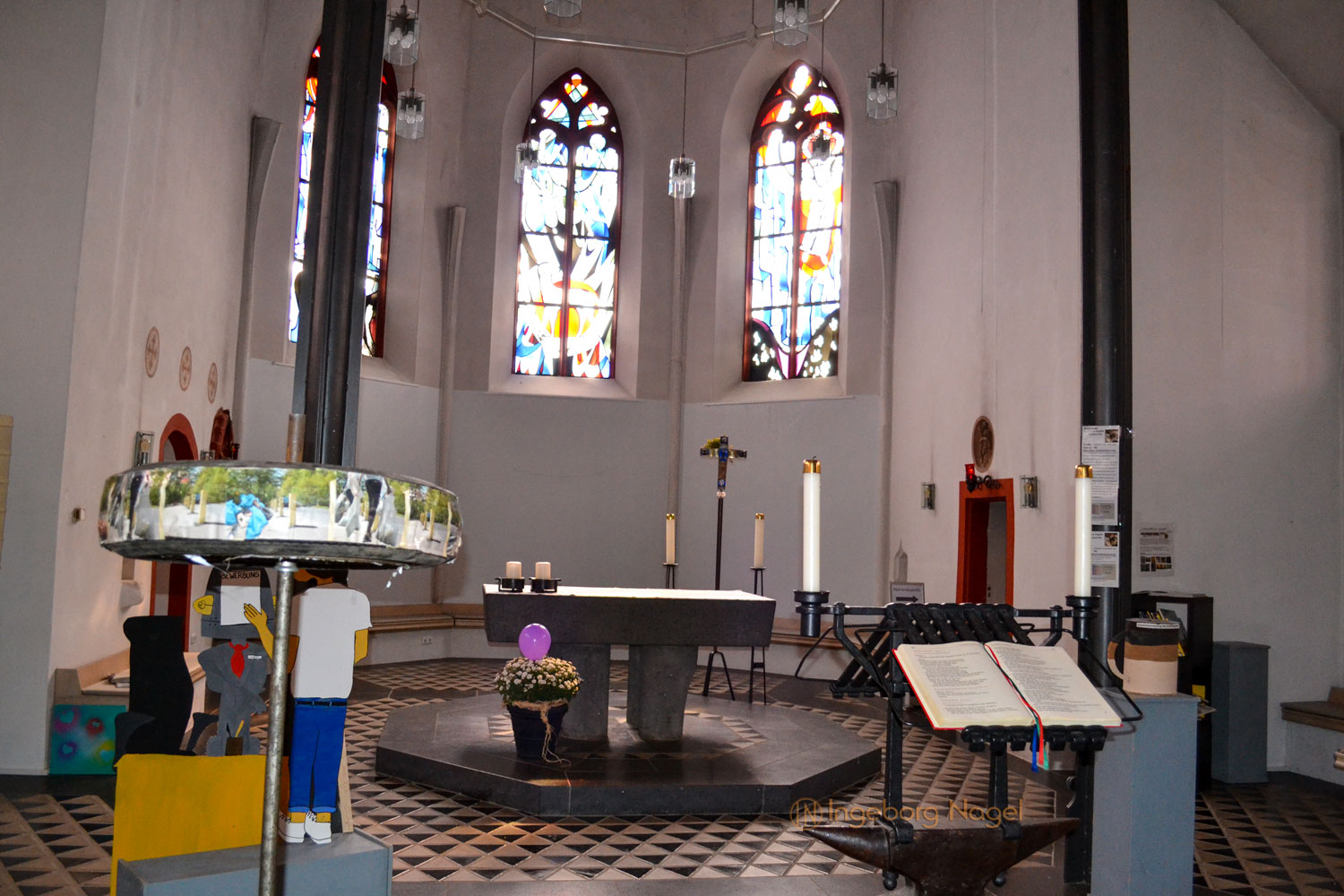 Dass Jugendarbeit hier oben groß geschrieben wird, zeigt auch das Innere der Kirche. Es ist eine Begegnungsstätte und bei meinem Besuch war eine Ausstellung von Jugendprojekten.