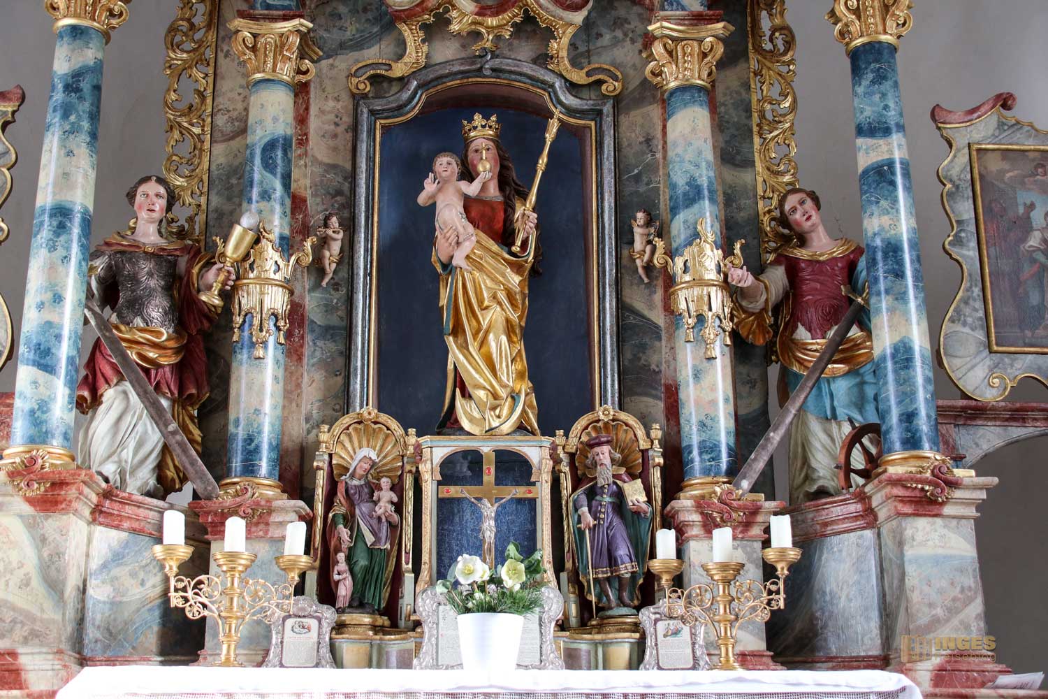 Zwischen viel Gold und den auffallenden Säulen steht links die wohl bekannteste Heilige der Christenheit, die Hl. Barbara. Es gibt viele Legenden aus dem 7. Jahrhundert, wie sie zum christlichen Glauben gefunden hat. Wie grausam haben Väter zu diesen Zeiten agiert (bei vielen anderen Heiligen auch) um ihre Kinder vom christlichen Glauben wieder abzubringen. Aber egal, wie grausam er bei Barbara auch vorging, sie wich nicht von ihrem Glauben ab. Nachdem er selber seine Tochter durch sein Urteil enthaupten ließ, traf ihn der Blitz und er verbrannte.