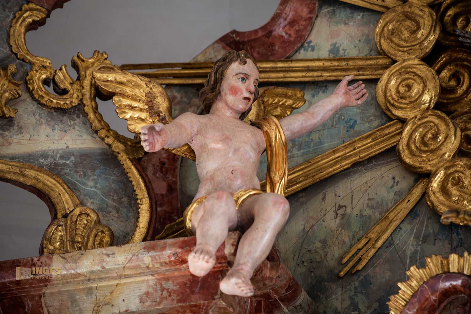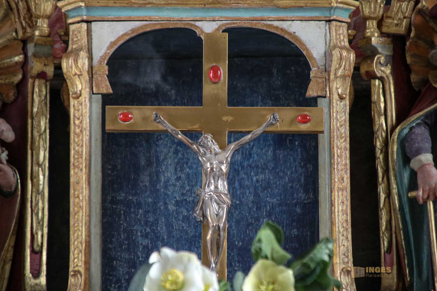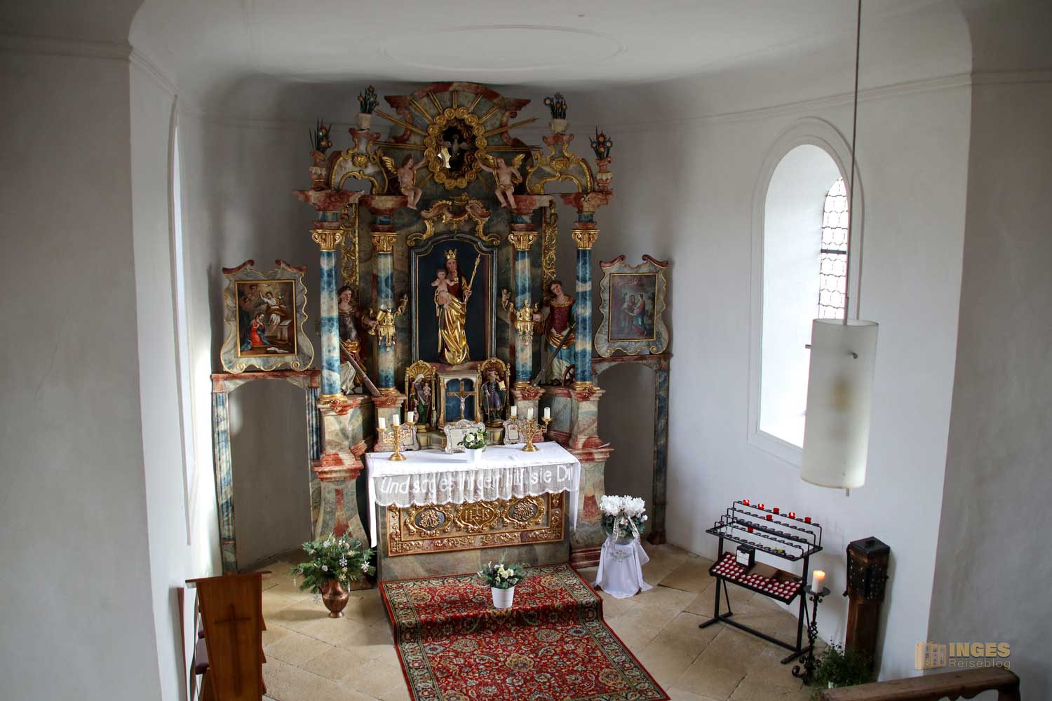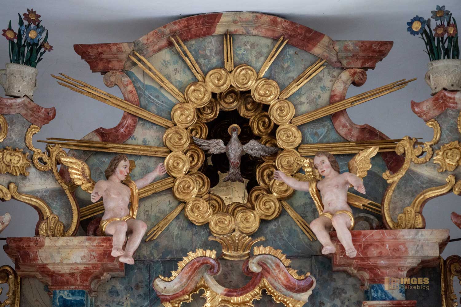 Nicht fehlen dürfen die Engelchen, die sich verteilt am Altar befinden. Vielleicht war es zu dieser Zeit so üblich, in meinem Bericht zur Wallfahrtskirche auf dem Hohenrechberg habe ich schon schmunzelnd geschrieben, man könnte fast mit einem Körbchen in die Kirche. Sooooo viele Früchte und Blumen wurden bei der Gestaltung in der Wallfahrtskirche verteilt. Hier in der Marienkapelle ist es eindeutig weniger, aber trotzdem dürfen auch hier Blumentöpfe auf dem Altaraufbau nicht fehlen.