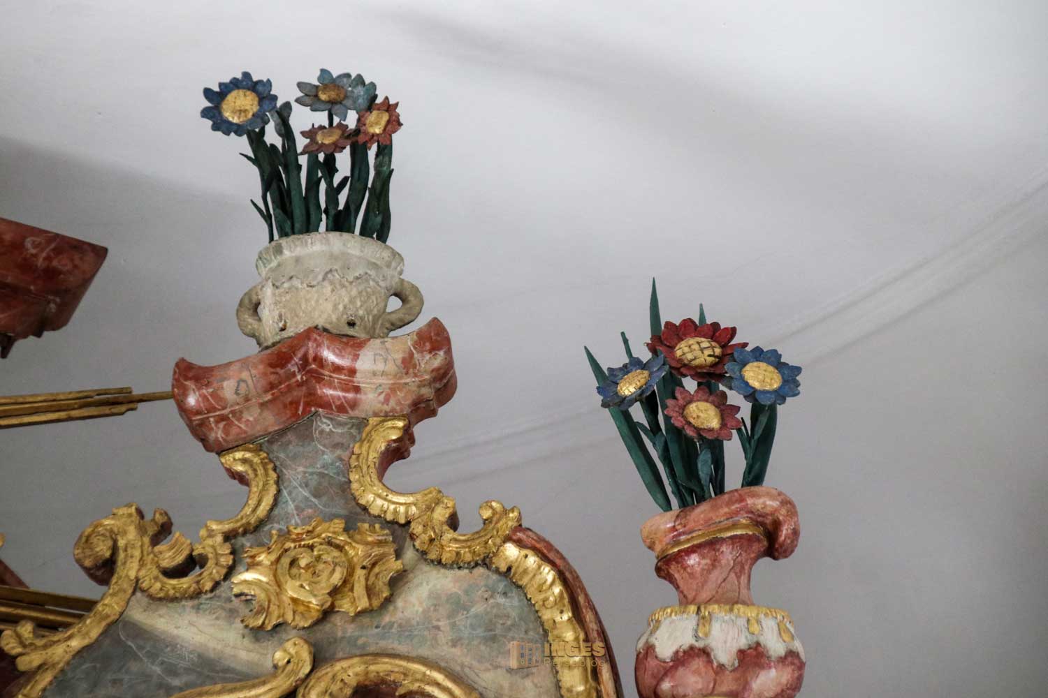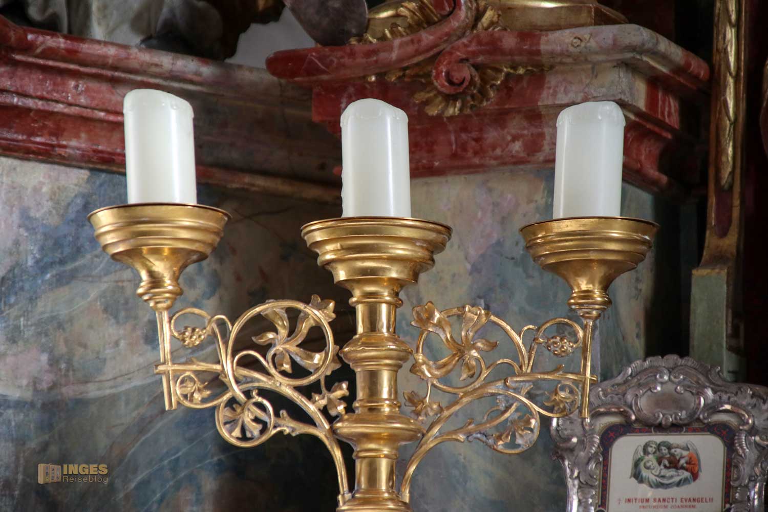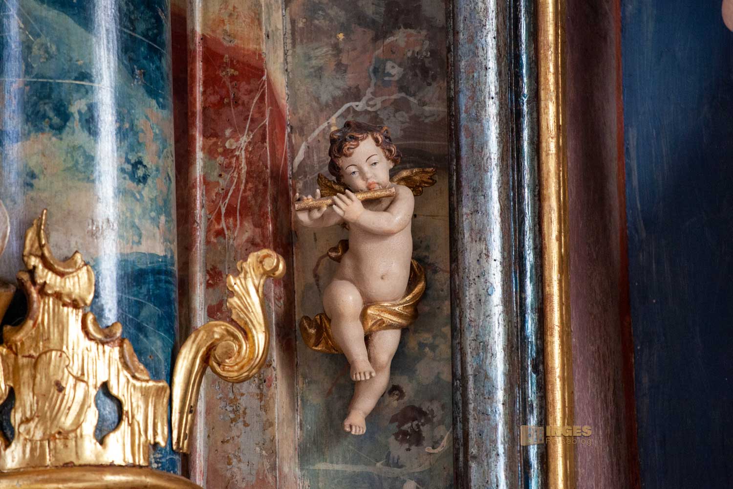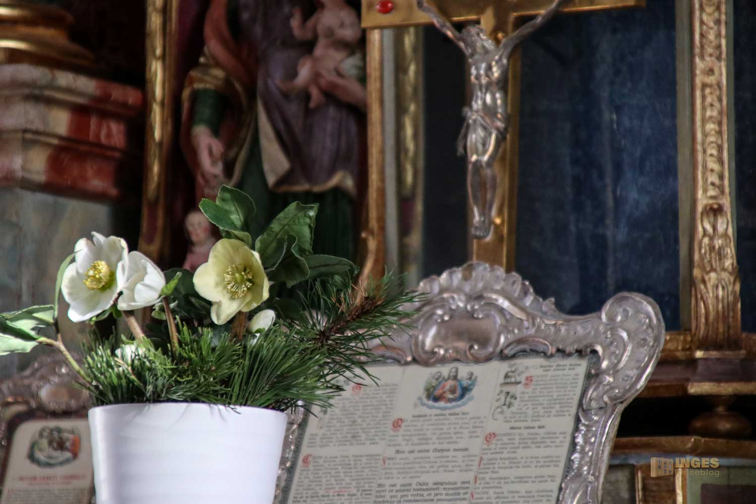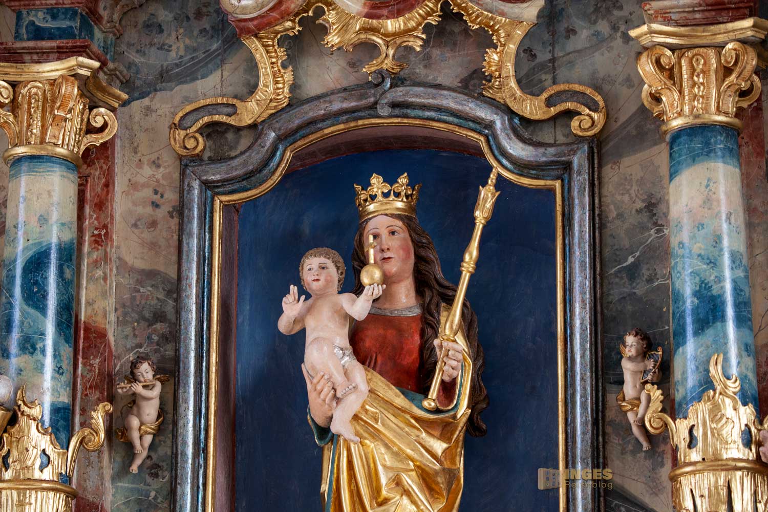 Nicht fehlen dürfen die Engelchen, die sich verteilt am Altar befinden. Vielleicht war es zu dieser Zeit so üblich, in meinem Bericht zur Wallfahrtskirche auf dem Hohenrechberg habe ich schon schmunzelnd geschrieben, man könnte fast mit einem Körbchen in die Kirche. Sooooo viele Früchte und Blumen wurden bei der Gestaltung in der Wallfahrtskirche verteilt. Hier in der Marienkapelle ist es eindeutig weniger, aber trotzdem dürfen auch hier Blumentöpfe auf dem Altaraufbau nicht fehlen.