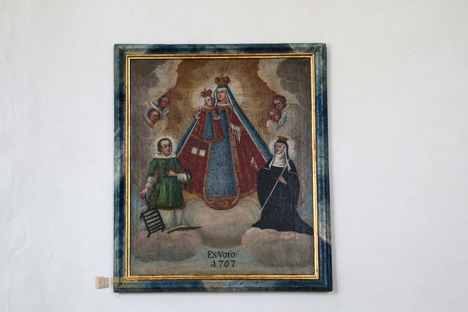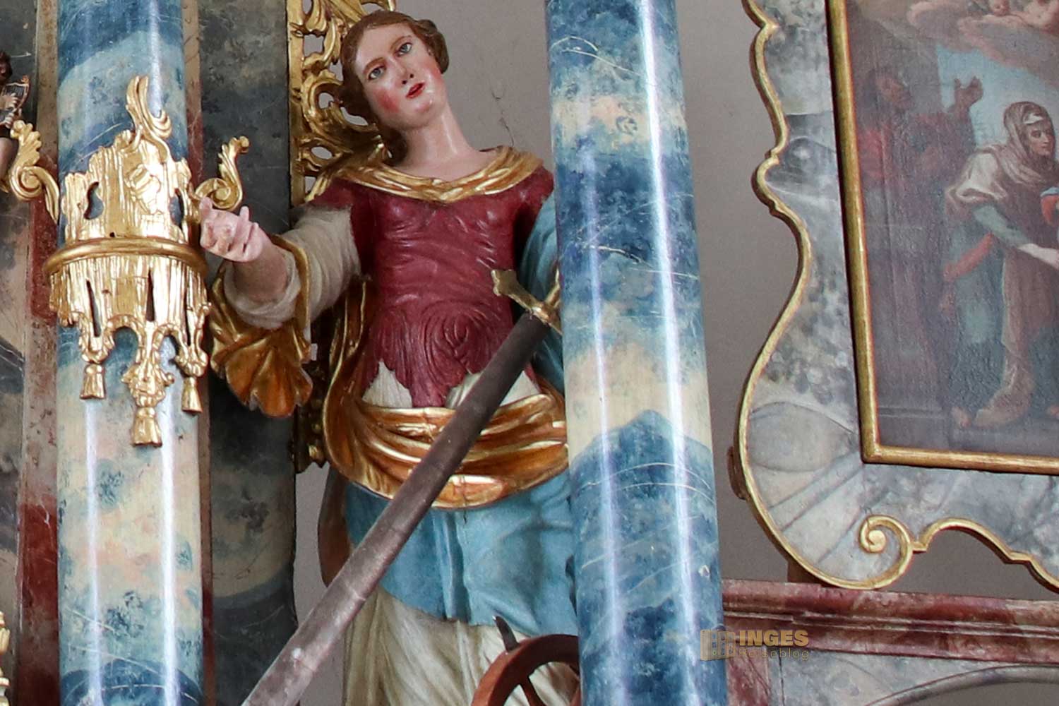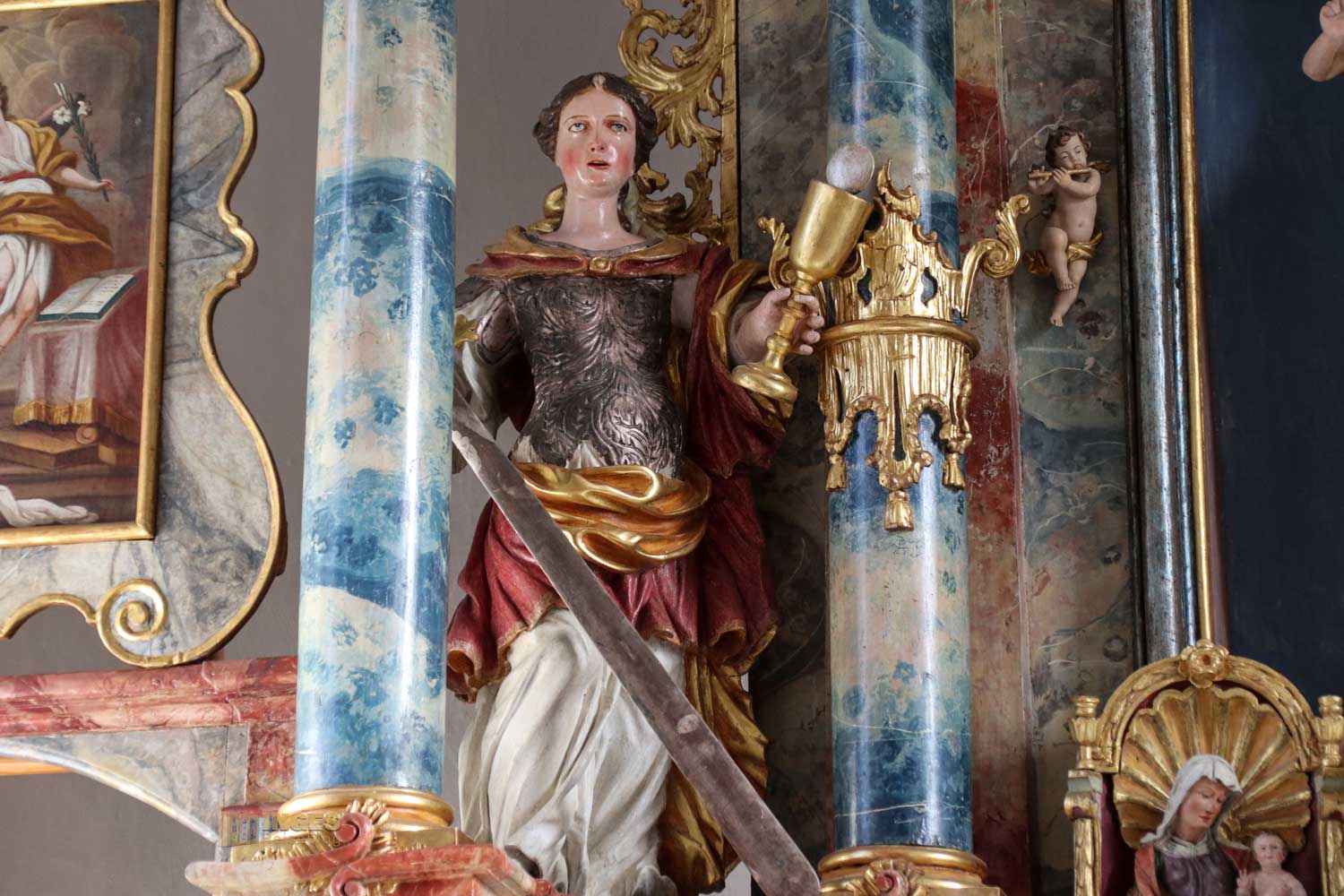 Rechts vom Altar steht die Hl. Katharina, die ebenfalls zu einer der bekanntesten Heiligen zählt. Auch um sie ranken sich zahlreiche Legenden. Als Tochter des Königs von Zypern war sie von den Männern hochbegehrt, aber egal wer die schöne Frau heiraten wollte, keiner passte ihr. Bis sie von einem Einsiedler auf Jesus Christus als ihren auserwählten Bräutigam hingewiesen wurde. In einer Vision erlebte sie bei ihrer Taufe, wie ihr das Jesuskind einen Verlobungsring an den Finger steckte. Selbst unter Folter schaffte es nichtmal der römische Kaiser sie zu seiner Ehefrau zu bekommen. Sie wird in der Kirche mit oft mit einem Schwert dargestellt und wenn ihr auch über sie mehr lesen wollt, dann bekommt ihr HIER viele interessante Infos.
