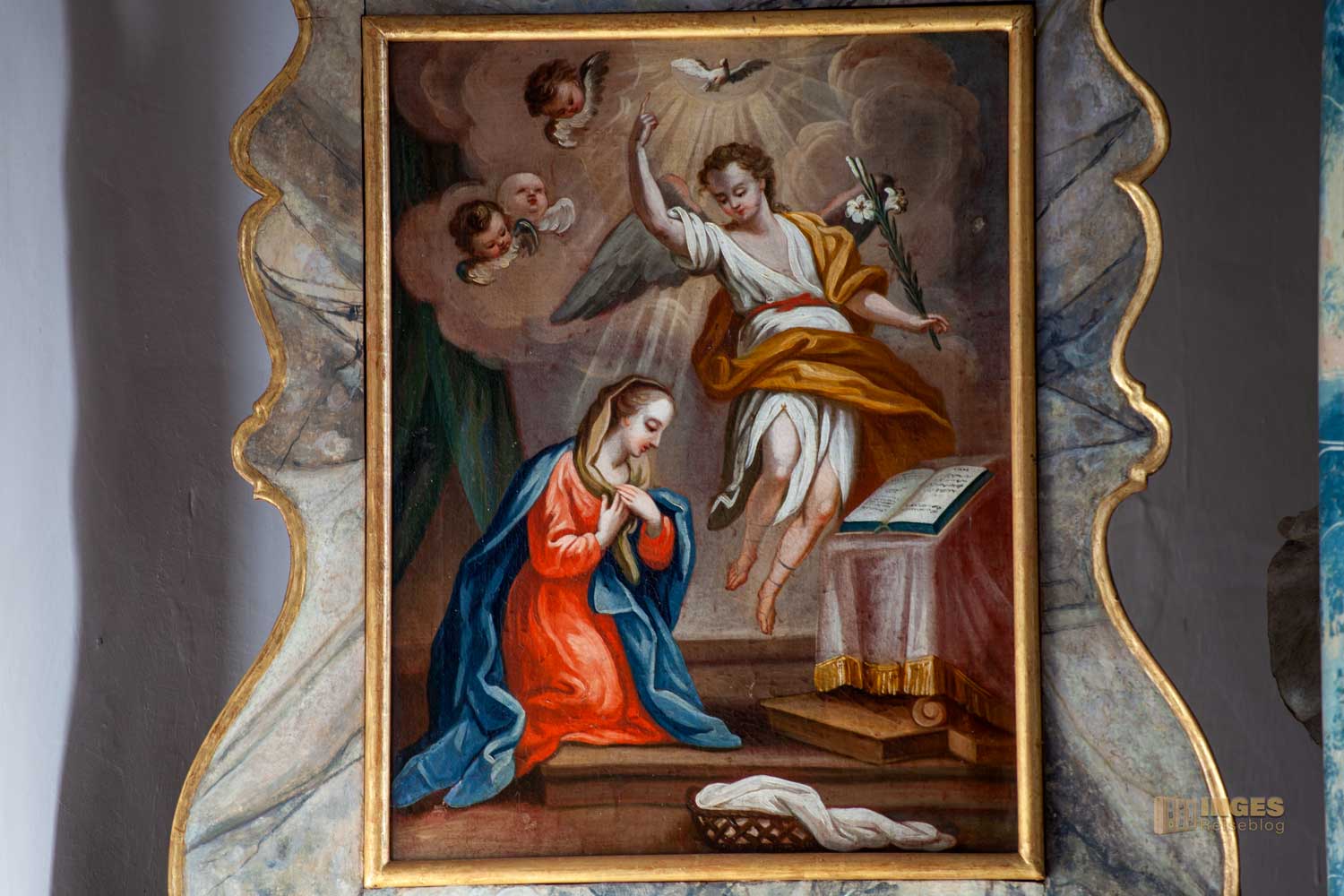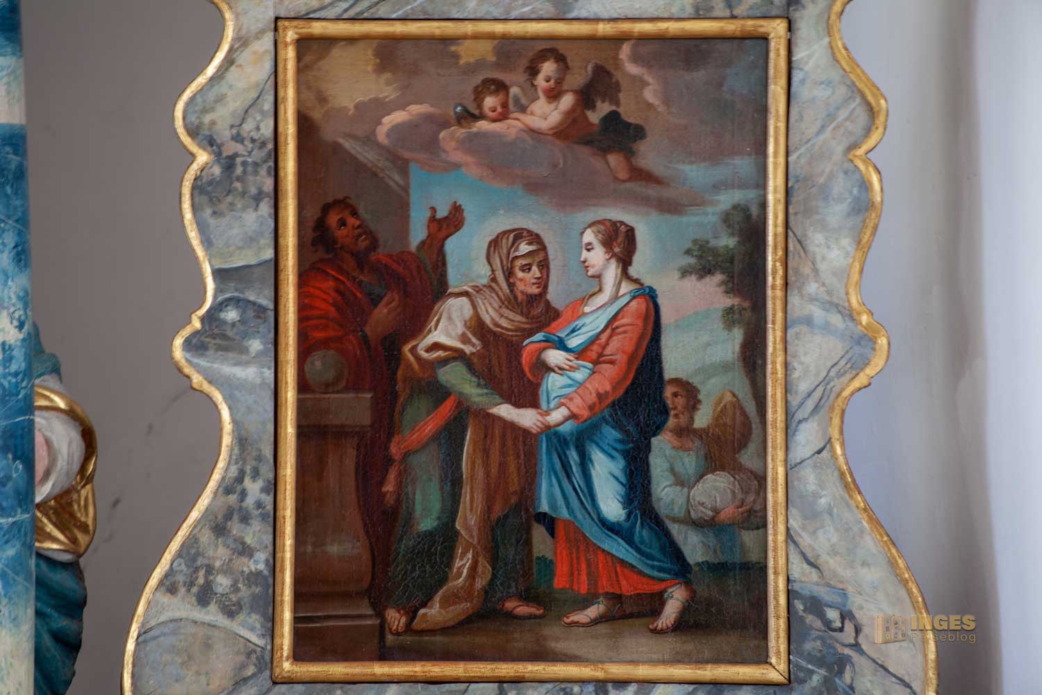 Links wird die Szene "Mariä Verkündigung" dargestellt - der Erzengel Gabriel überbringt ihr die Botschaft der Geburt ihres Sohnes Jesus. Rechts wird der Besuch der hochschwangeren Maria bei ihrer Verwandschaft gezeigt. Das sind aber nicht die einzigen Bilder - es gibt noch mehr
