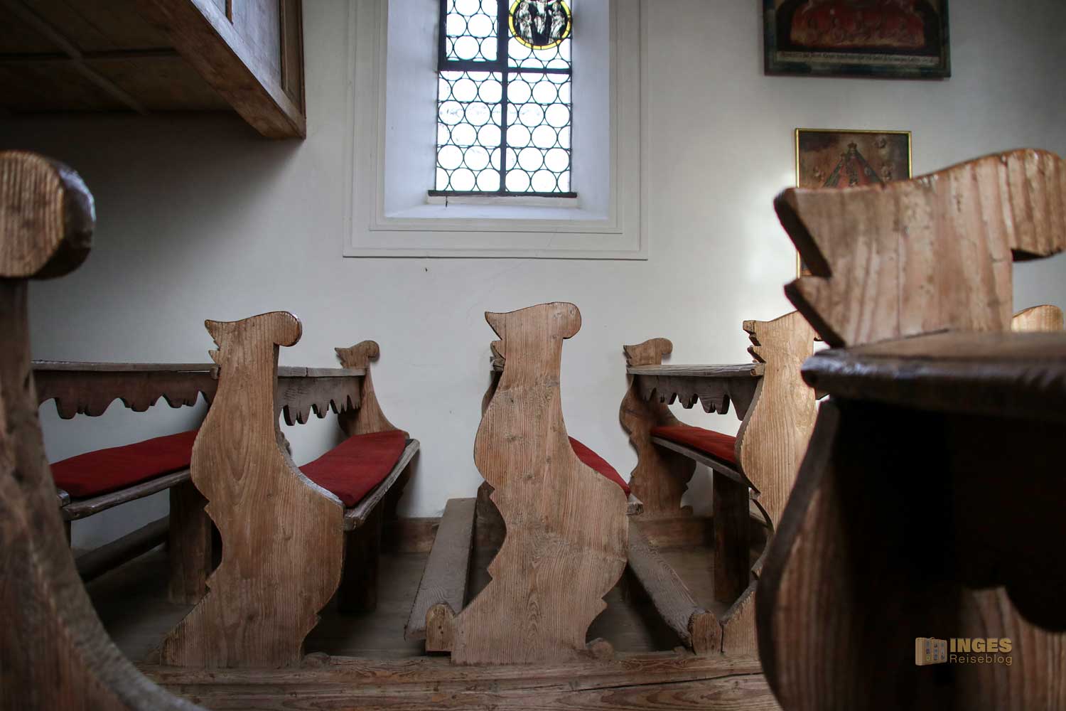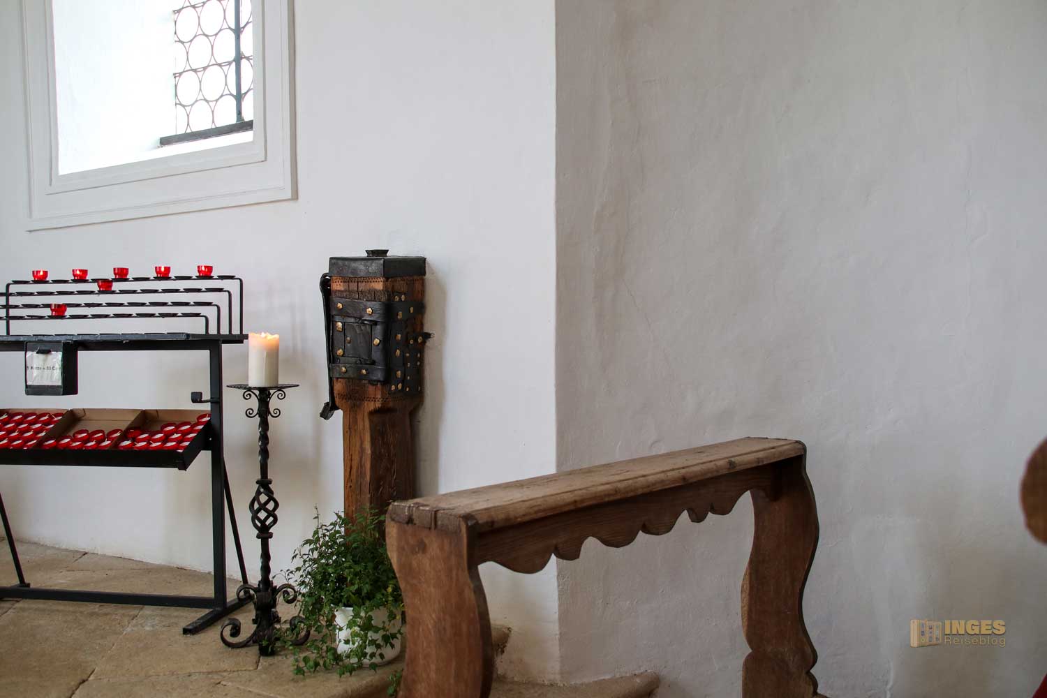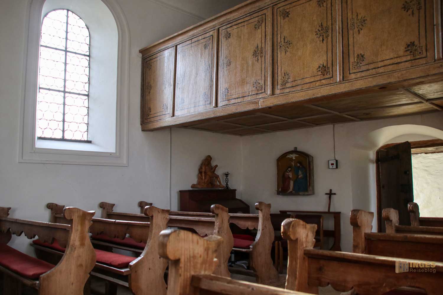Noch von der ersten Kapelle stammt der Opferstock. Auch die Holzbänke in der kleinen Kapelle können über die vielen Jahre bestimmt viele Geschichten über ihre Besucher erzählen, genauso wie die alte Holztreppe die hinauf auf die Empore führt.