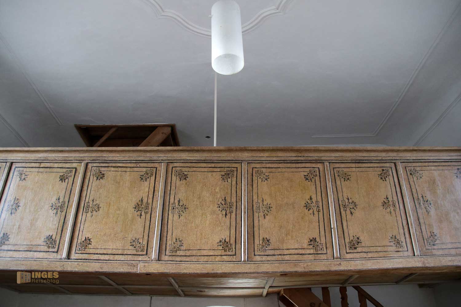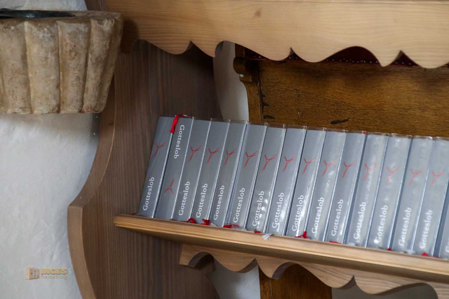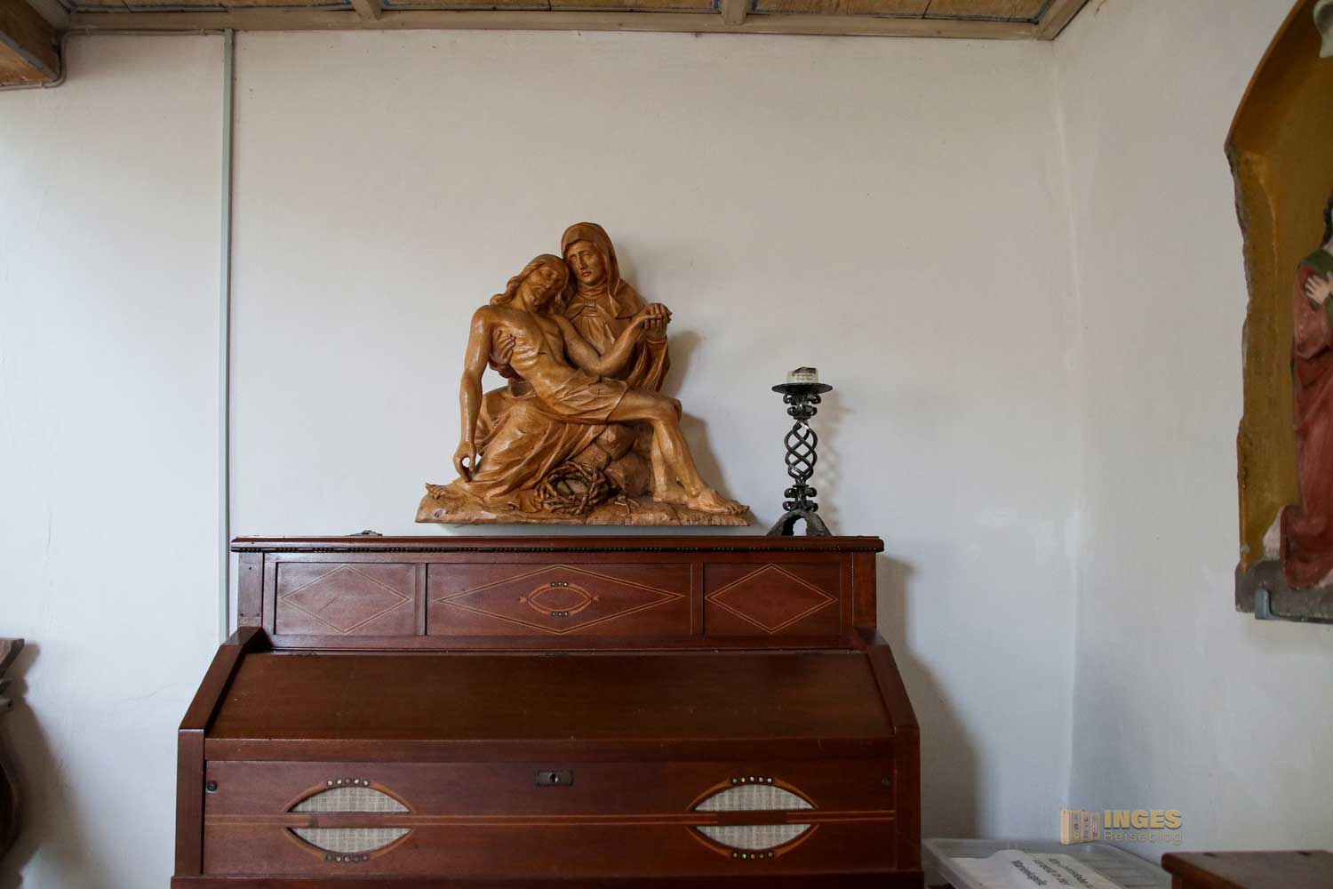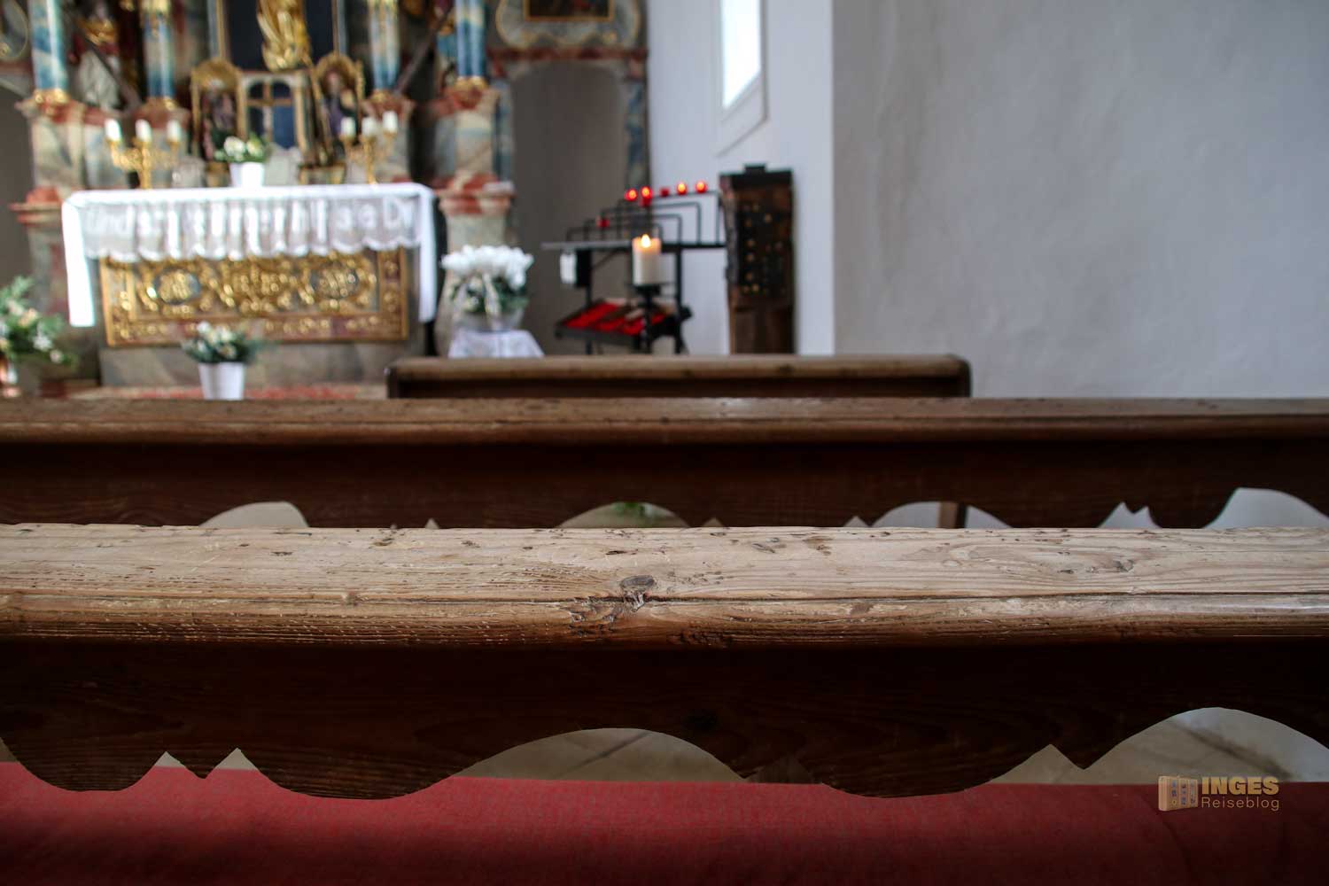 Noch von der ersten Kapelle stammt der Opferstock. Auch die Holzbänke in der kleinen Kapelle können über die vielen Jahre bestimmt viele Geschichten über ihre Besucher erzählen, genauso wie die alte Holztreppe die hinauf auf die Empore führt.
