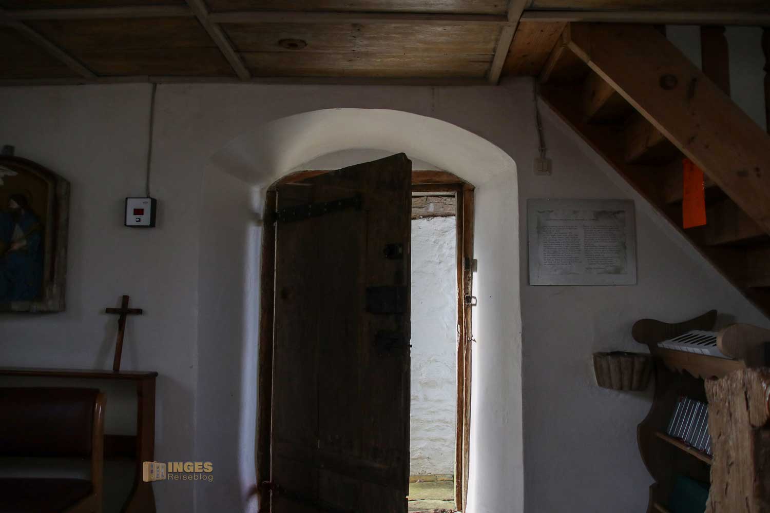 An den Sonntagen (zumindest so über die Wintermonate) ist sie für Besucher am Nachmittag geöffnet. Man sieht es ihr bereits am Eingang an, dass sie alt ist - und wer für ihren Bau verantwortlich ist. Denn dem Erbauer wurde über der Türe ein Denkmal gesetzt.