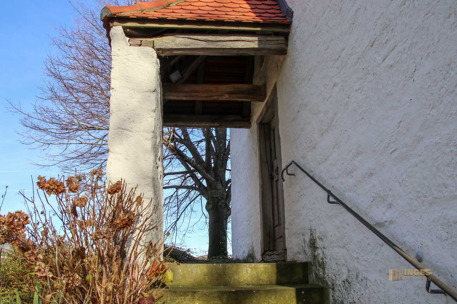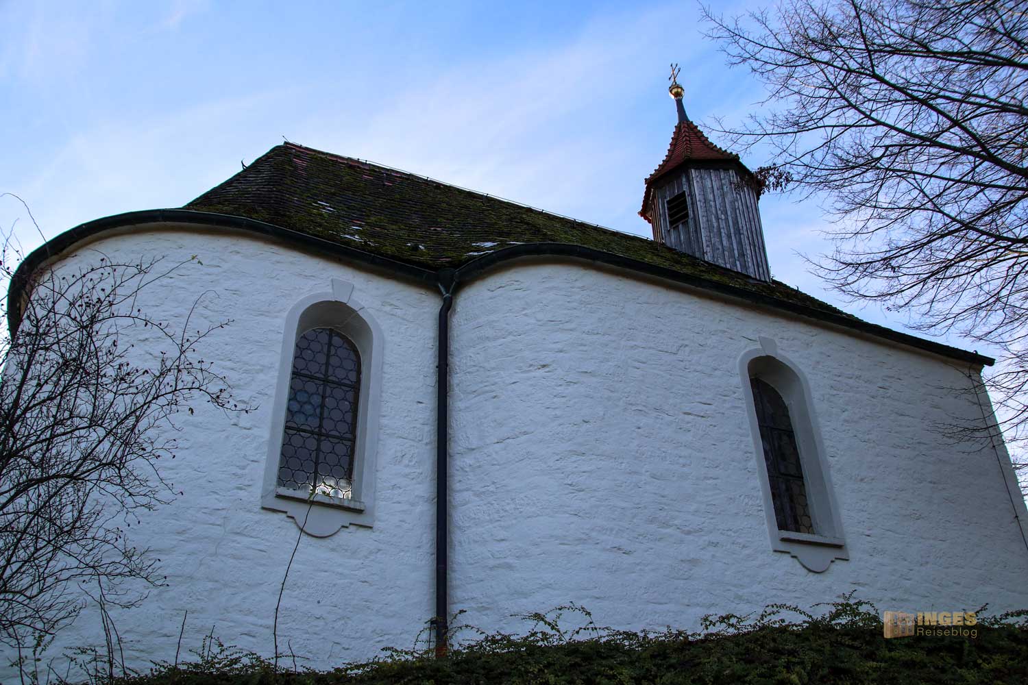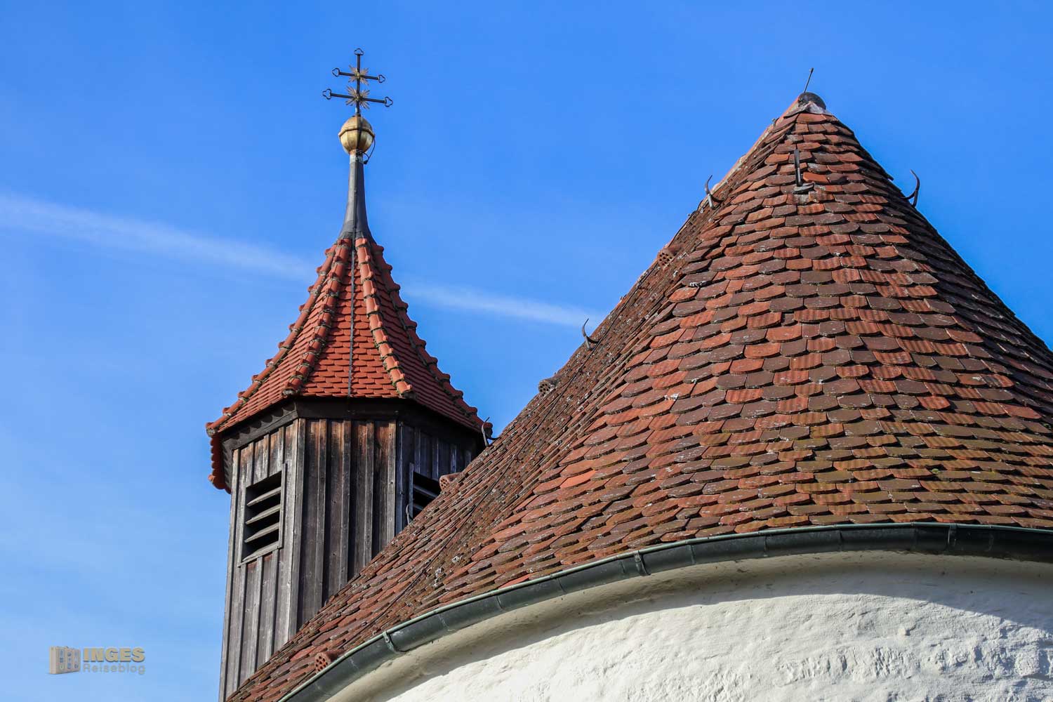 Übrigens, wenn euch das Kreuz auf der Marienkapelle von einem anderen Kirchenbericht in meinem Blog bekannt vorkommt, liegt ihr richtig. Nur wenig entfernt auf der Wallfahrtskirche auf dem Hohenrechberg findet sich auch ein Doppelkreuz auf der Kirche. Warum hier auf der Kapelle kann ich nur vermuten, ob ich damit richtig liege? Wenn es jemand von euch weiß, bitte gebt mir Bescheid.