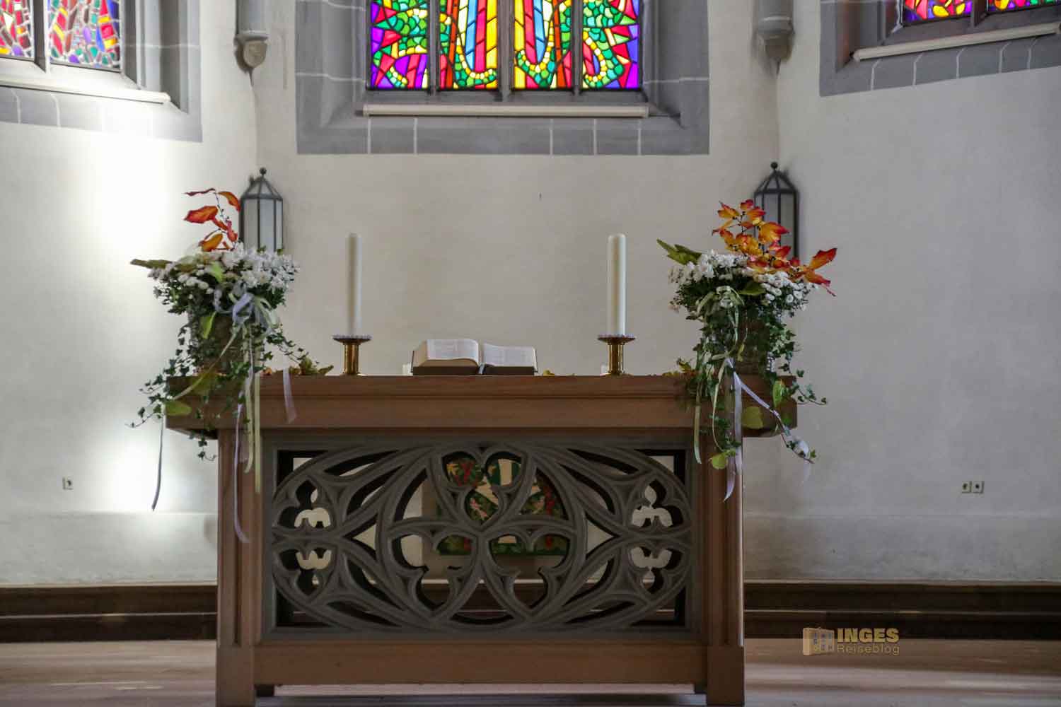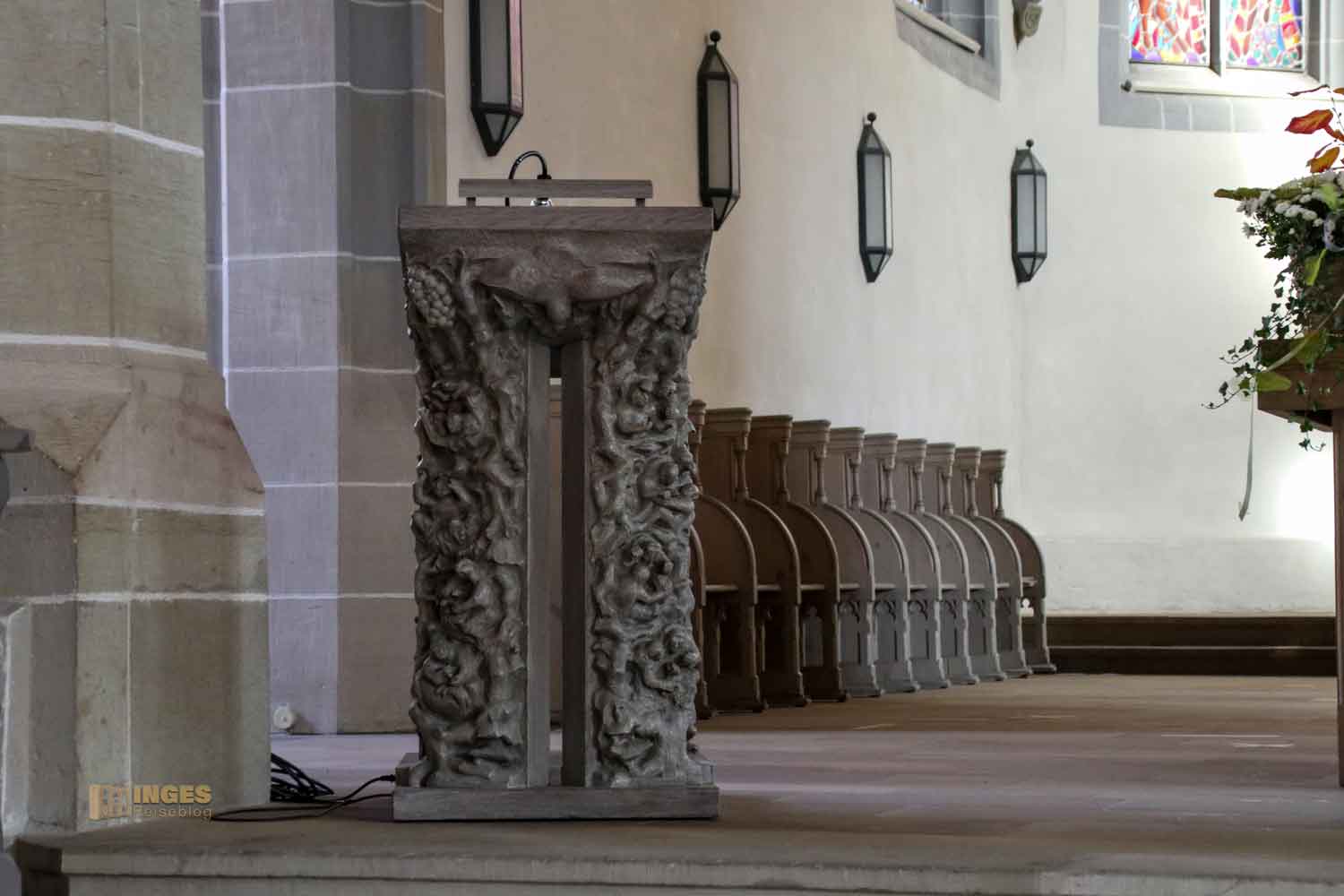 Aber nur scheinbar schlicht, denn der Blick liegt mal wieder im Detail. Man sieht dem Altar sein neueres Herstellungsdatum an. Ebenso wie das Lesepult, welches 1990 hergestellt wurde und damit 10 Jährchen älter als der Altar ist. In der Darstellung wird vortrefflich der Zweck des Pults symbolisiert - links werden Motive aus dem Alten Testament gezeigt, rechts aus dem Neuen. Alles unter dem Zeichen der Friedenstaube.