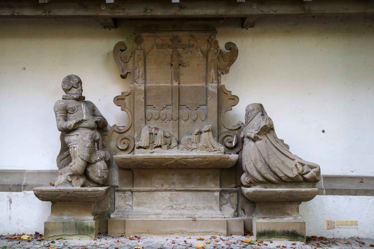 haben zumeist ihren Platz im Inneren gefunden. An der Nordseite fällt euch bestimmt aber ein großes Grabmal auf, das der Familie Grimmeisen. Da hat ganz schön der Zahn der Zeit dran genagt. Trotzdem sieht man ihn noch, den kaiserlichen Ritter, kniend mit seiner Frau und in der Mitte deren acht Kinder.