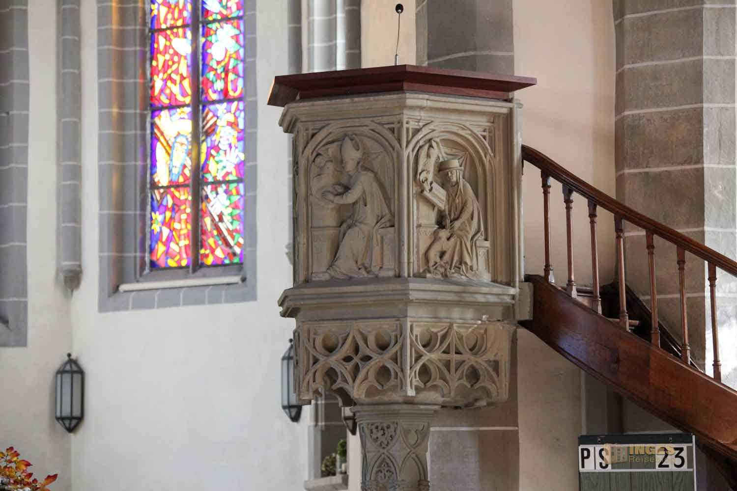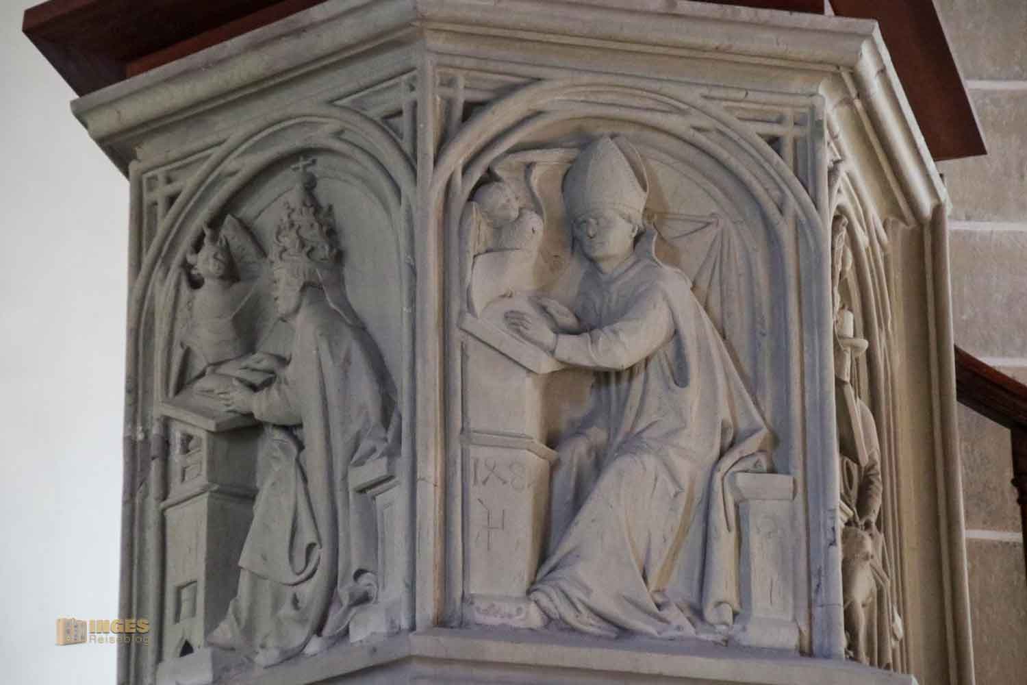 zieht mich, wie es in jeder anderen Kirche die Kanzeln auch tun, in den Bann. 1866 kam sie an ihren heutigen Platz, wurde aber bereits 1484 von Peter von Lan erstellt. Er hat in der ganzen Kirche seine 'Abdrücke' der Fertigstellungen mit Jahreszahlen hinterlassen, was ich in dieser Form noch in keiner meiner besichtigten Kirchen gesehen habe. Hier an der Kanzel seht ihr die Jahreszahl eingeritzt, mitsamt seinem Meisterzeichen. Die vier Kanzelkorbseiten hat er den vier Evangelisten zugeordnet. Aber nicht als Evangelist wie z.B. in der Wallfahrtskirche Schönenberg bei Ellwangen, sondern er symbolisiert die Evangelisten mit vier lateinischen Kirchenvätern. Im Mittelalter wurden Kanzeln gerne mit diesen Motiven dargestellt, aber immer auch mit den jeweiligen Symbolen, die den Evangelisten zugeordnet sind. Engel, Stier, Löwe und Adler.