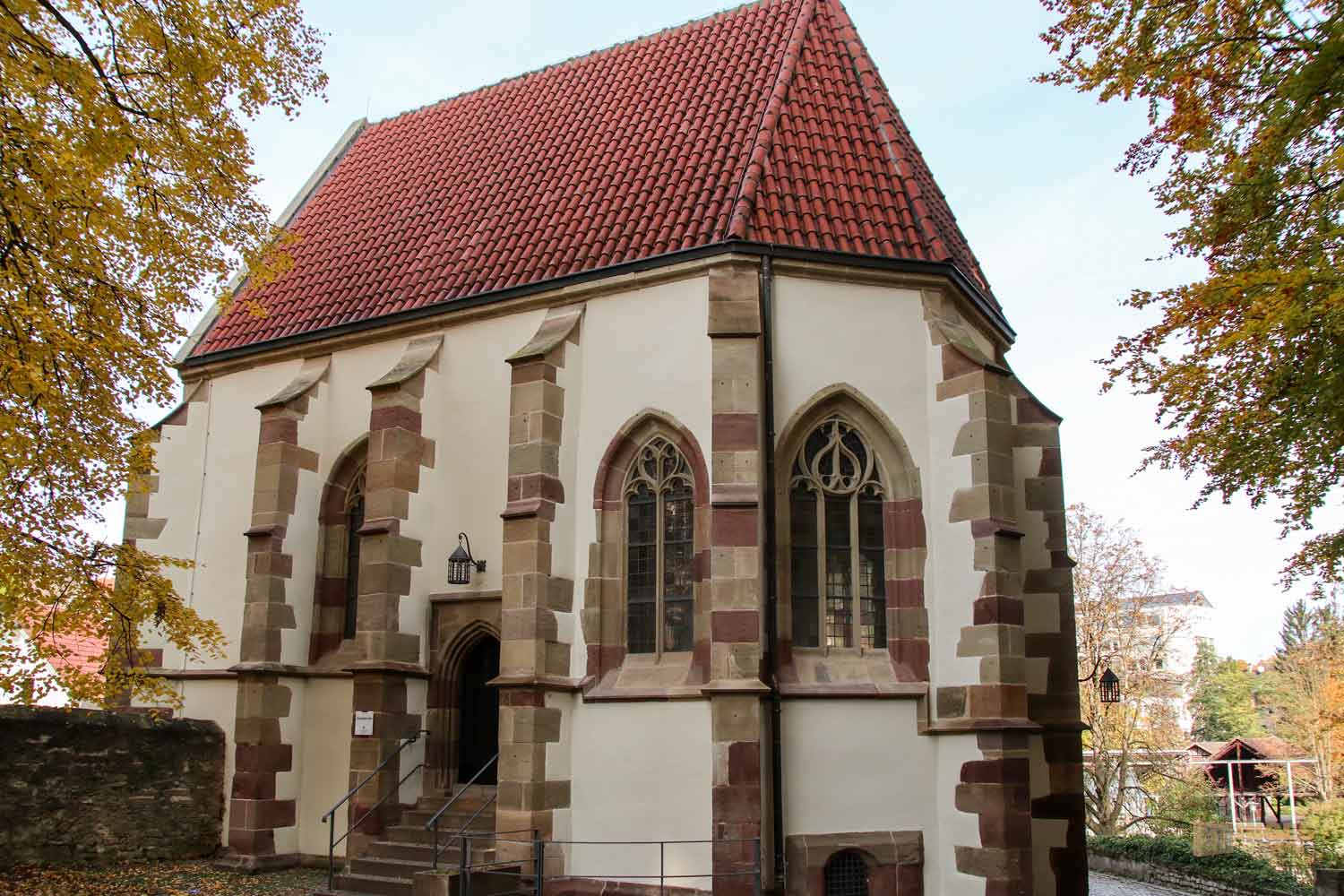Leider konnten wir dieses Kleinod nur von außen besichtigen. Wie wir es schon oft erlebt haben, war die Türe verschlossen. Im spätgotischen Stil wurde das kleine Kirchle ab 1496 erbaut und soll eines der schönsten Bauwerke in Waiblingen sein. Auch hier in der Kirche sollen diese wunderschönen Schluss-Steine zu sehen sein.