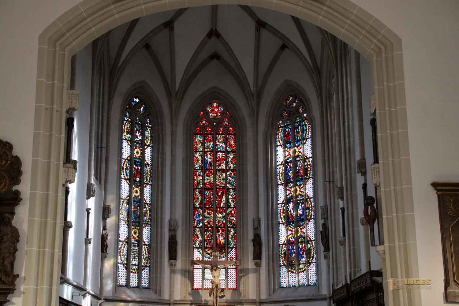 gemeinsam mit dem Holzkruzifix über dem Altar ist eine Verbindung von Alt und Neu. Etwa um die Zeit von 1510 stammt das Holzkreuz, das Chorgestühl wird der Spätgotik zugeordnet.