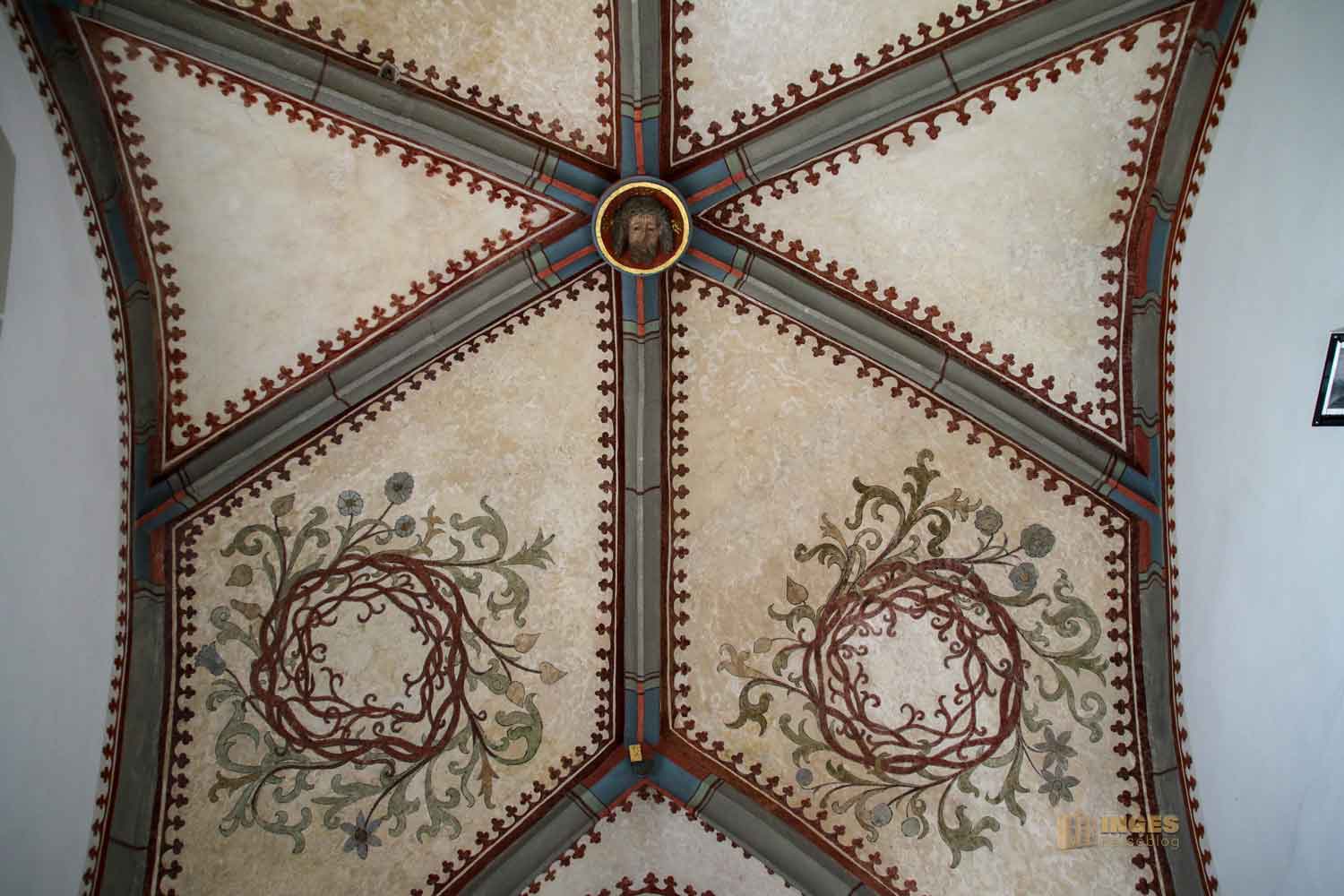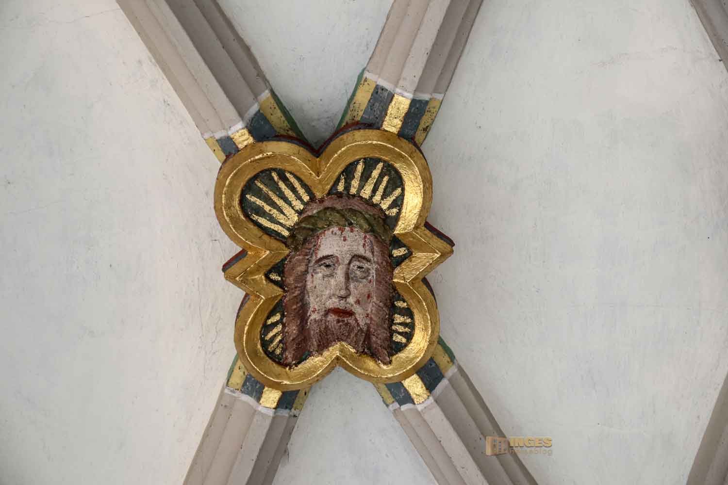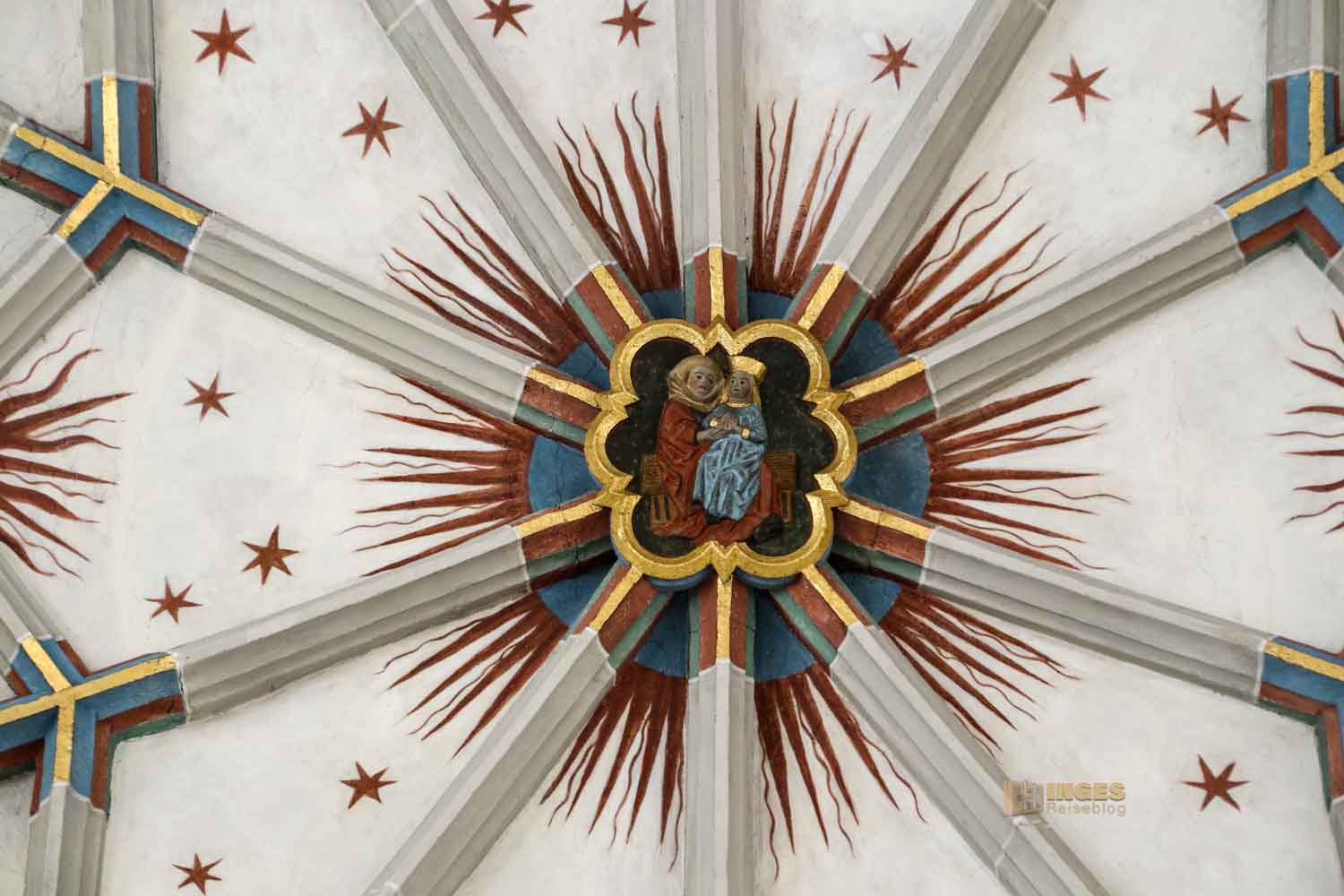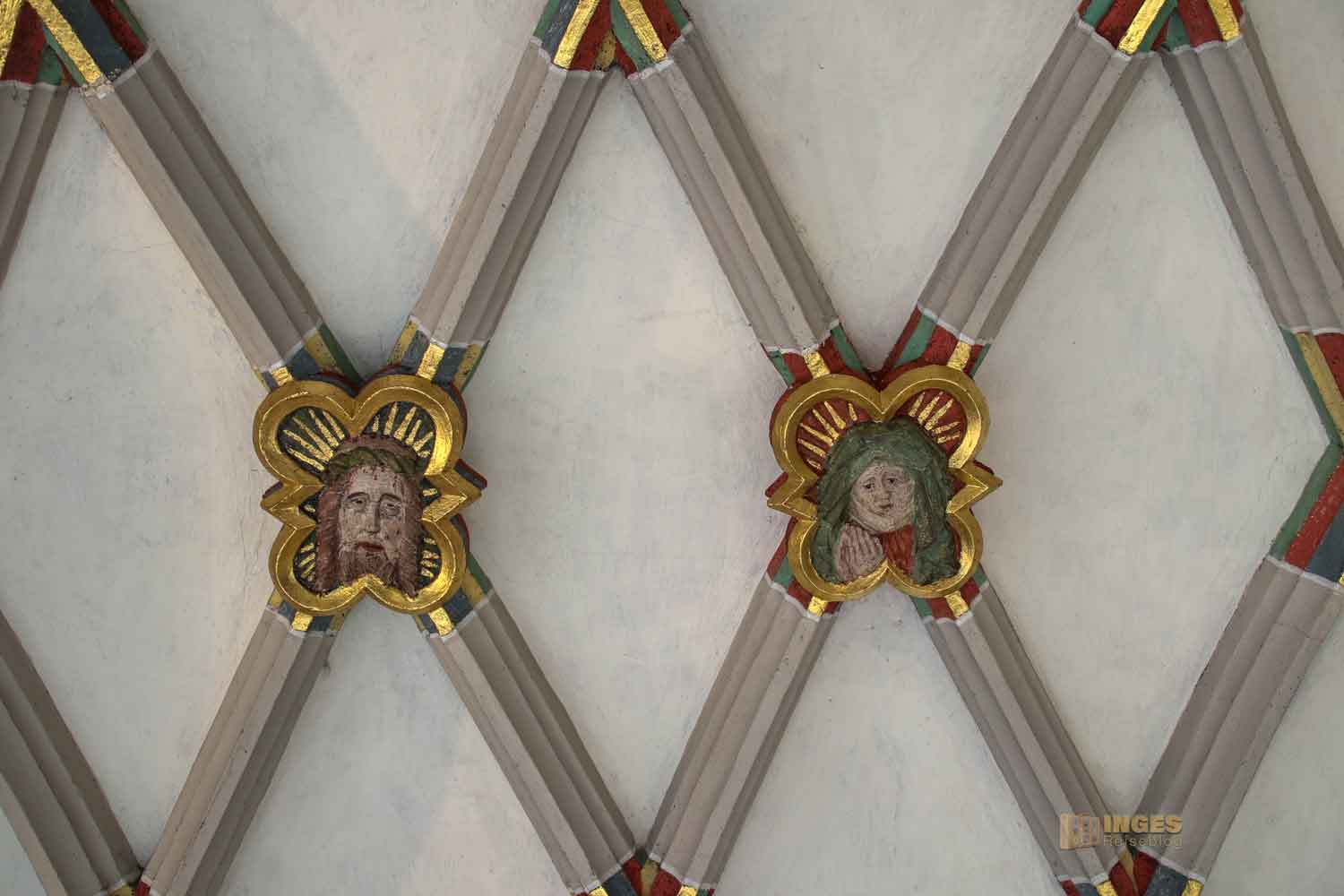 Werft auch noch einen Blick zur Decke in dem kleinen Eingangsbereich. Da würde eine Stuckdecke wirklich nicht zu dem Fresko passen, gell. Ich liebe diese Rippengewölbe, denn bei den Zusammenschlüssen finden sich immer herrlich gestaltete Schlusssteine. Da es früher eine Marienkirche war, hier Jesus und Maria. Übrigens habe ich noch nie soooo viele Schlusssteine in einer Kirche gefunden wie in der Michaelskirche in Waiblingen, 28 Stück.