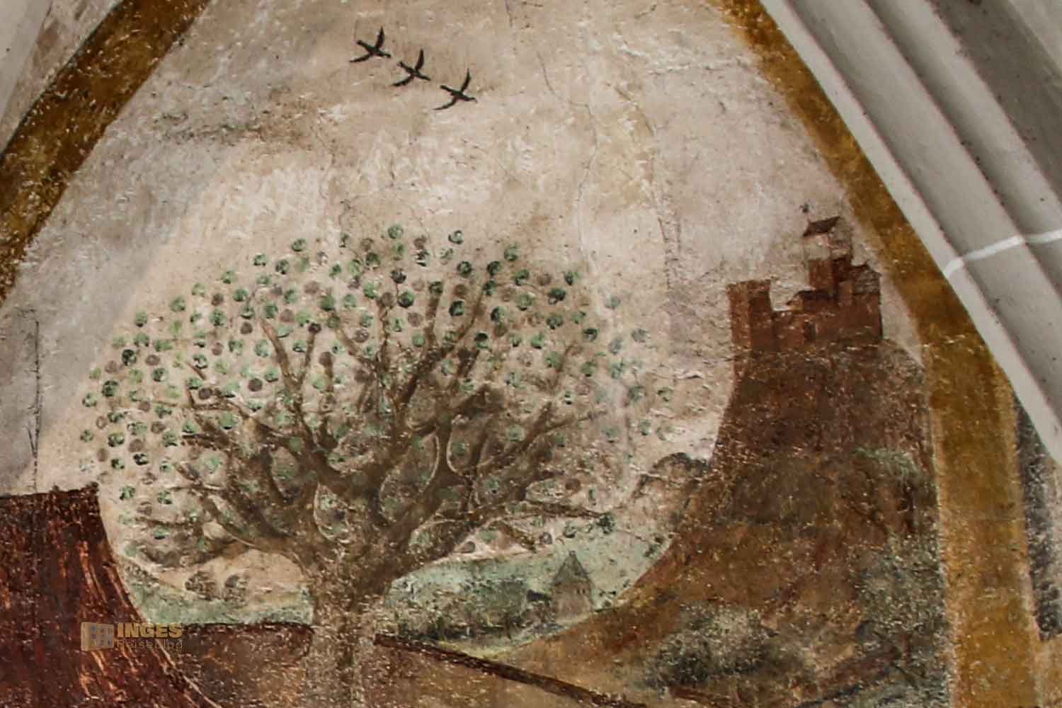 Wenn ihr euch jetzt fragt, und, was hat das mit dem Hohenstaufen zu tun, der Stammburg der Staufer? Rechts oben sieht man die Burg auf dem Hohenstaufen. Und das ist eine Besonderheit, denn die Darstellung auf dem Fresko ist die einzige bekannte Darstellung der gesamten Burg, bevor sie im Bauernkrieg 1525 zerstört und nie mehr aufgebaut wurde.