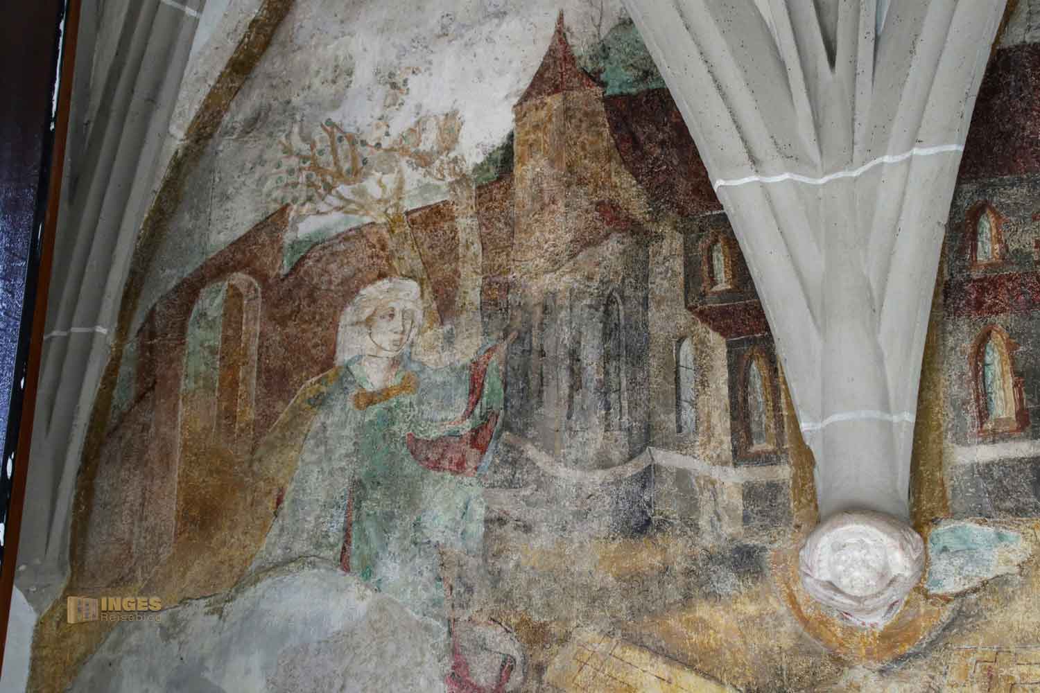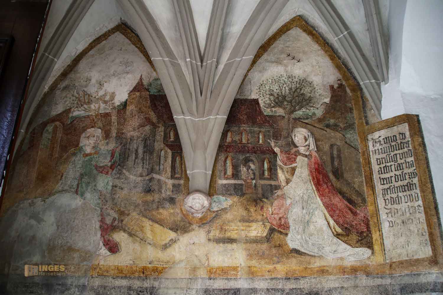 1938 wurde bei Renovierungsarbeiten ein Wandfresko entdeckt, das vermutlich von 1490 stammt. In anderen Infos habe ich aber auch die Jahreszahl 1438 gefunden. Auf jeden Fall ist es alt, sehr alt und wunderschön. Da gibt es viel zu entdecken auf dem Fresko, denn es soll die Gründungssage der Kirche zeigen. Zwei edle Damen sollen die Stifterinnen gewesen sein, die hier ein romanisches Kirchenmodell zeigen. Schaut mal ganz genau auf den Fotos, oder wenn ihr in der Kirche seid, ob ihr den Chorherren findet. Er war der älteste Brillenträger von dem man in der Stadt weiß.