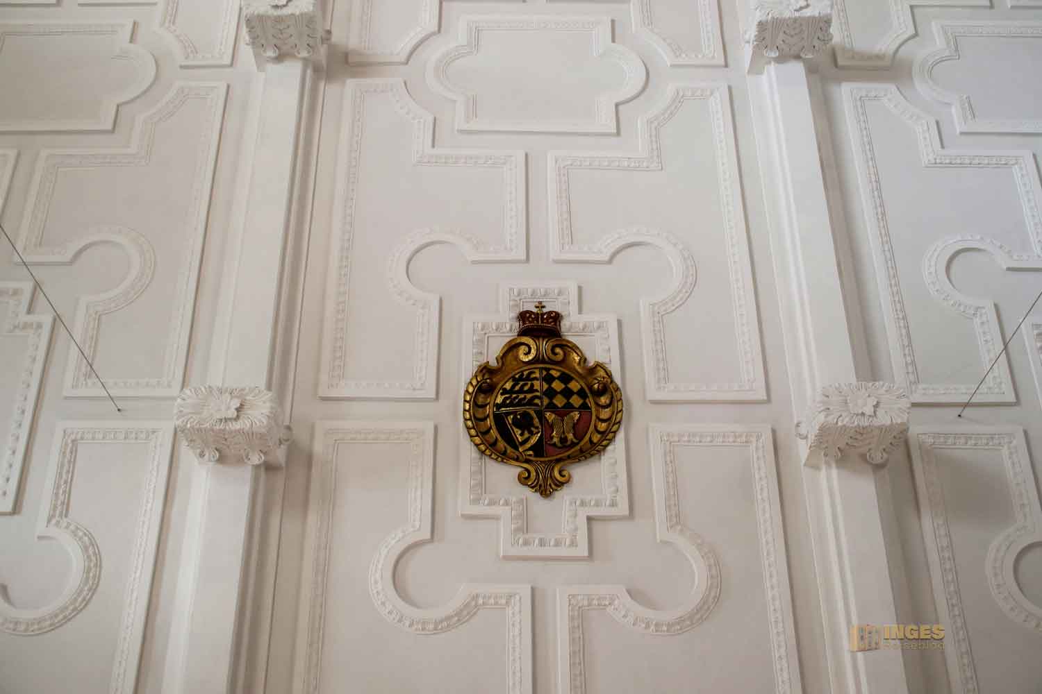 Seht ihr die Decke? Ich finde, diese Stuckdecke nimmt einer alten Kirche etwas den Charme. Aber so war es eben nach der Renovierung 1686 so.. Was sich in vielen Kirchen in Württemberg findet, ist das herzogliche Wappen. Denn der Herzog war ja zugleich auch der obererste Kirchenherr, und das musste man ja schon auch symbolisieren. Herzöge wurden die Grafen von Württemberg ja im Juli 1495. Als Symbol für die Württemberger finden sich immer die Hirschstangen im Wappen. Und natürlich kam auch noch das angeheirate Wappen mit dazu.