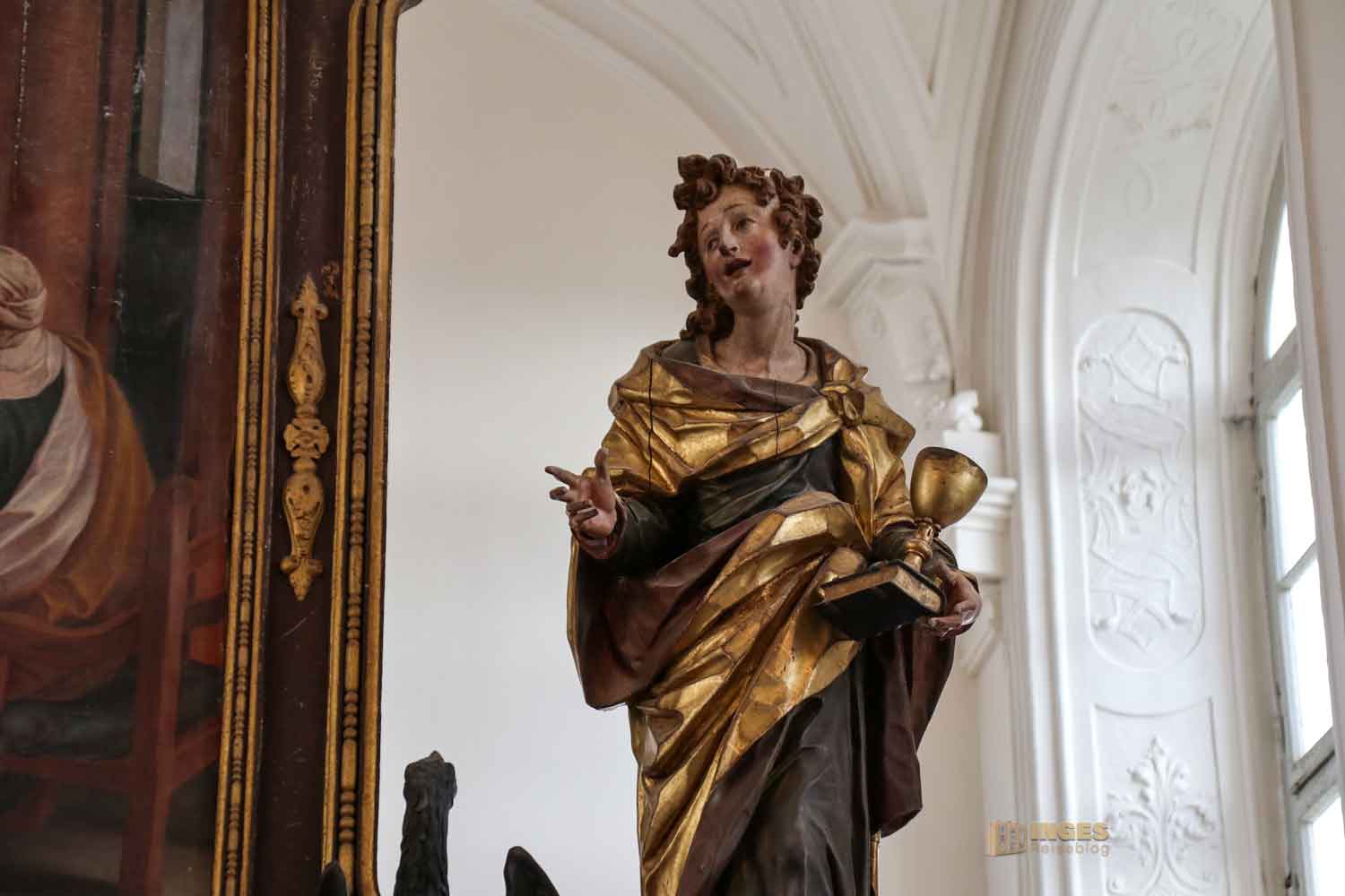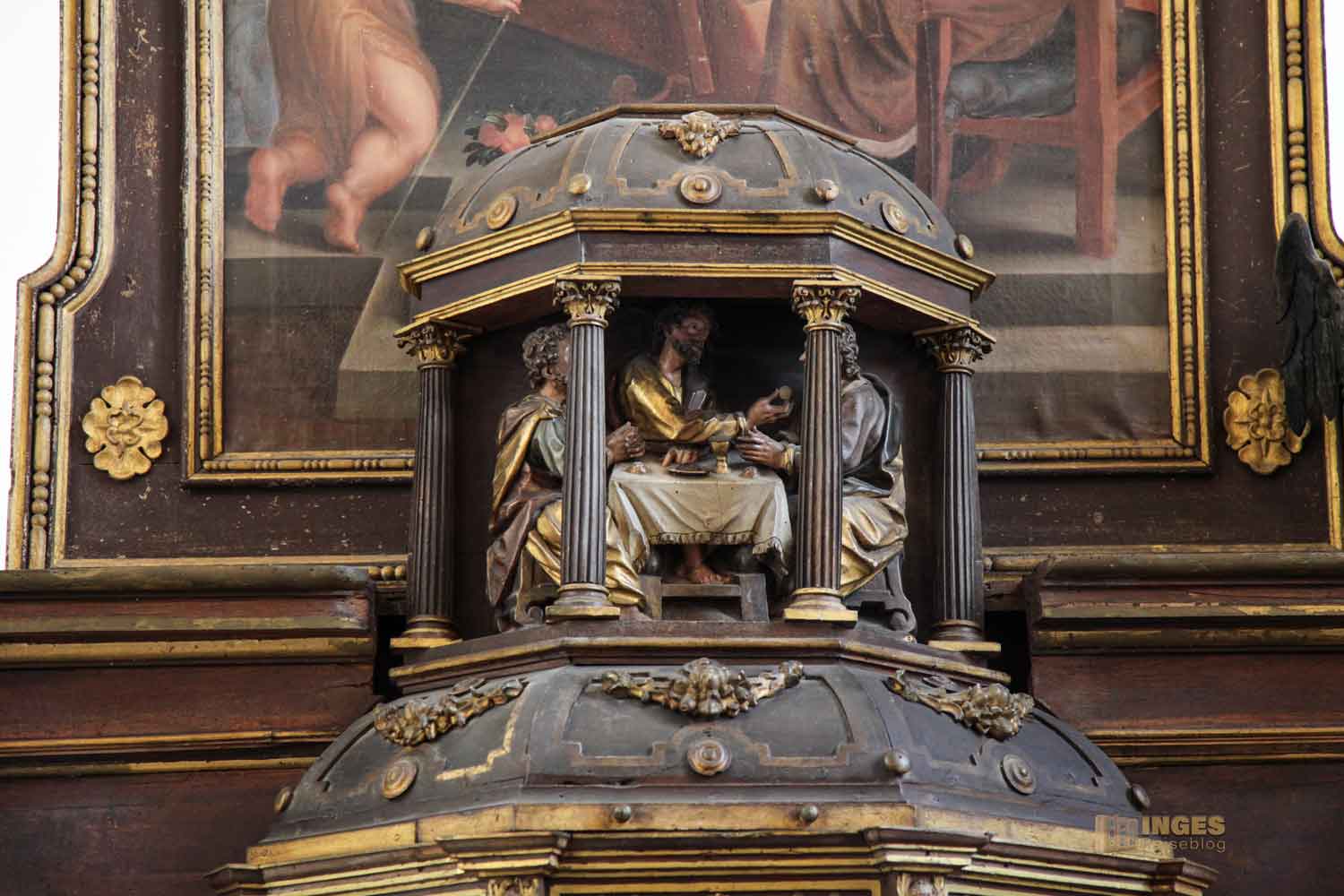 Ihr wisst es ja aus meinen Berichten bestimmt schon - ich liebe das Detail. Und da bietet mir der Hauptaltar einiges an Motiven. Angefangen bei der Emmaus-Szene über dem Tabernakel bis hin zu den Figuren die das Altarbild säumen. Links Johannes der Täufer, rechts Johannes der Evangelist. Damit ist mit den beiden Johannes das alte und neue Testament symbolisiert.