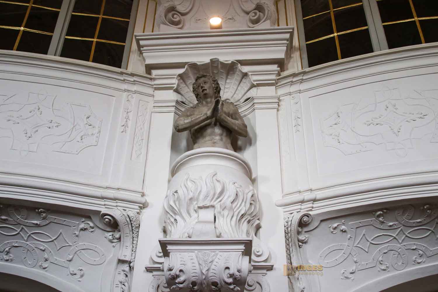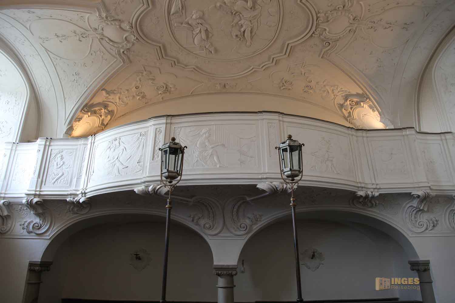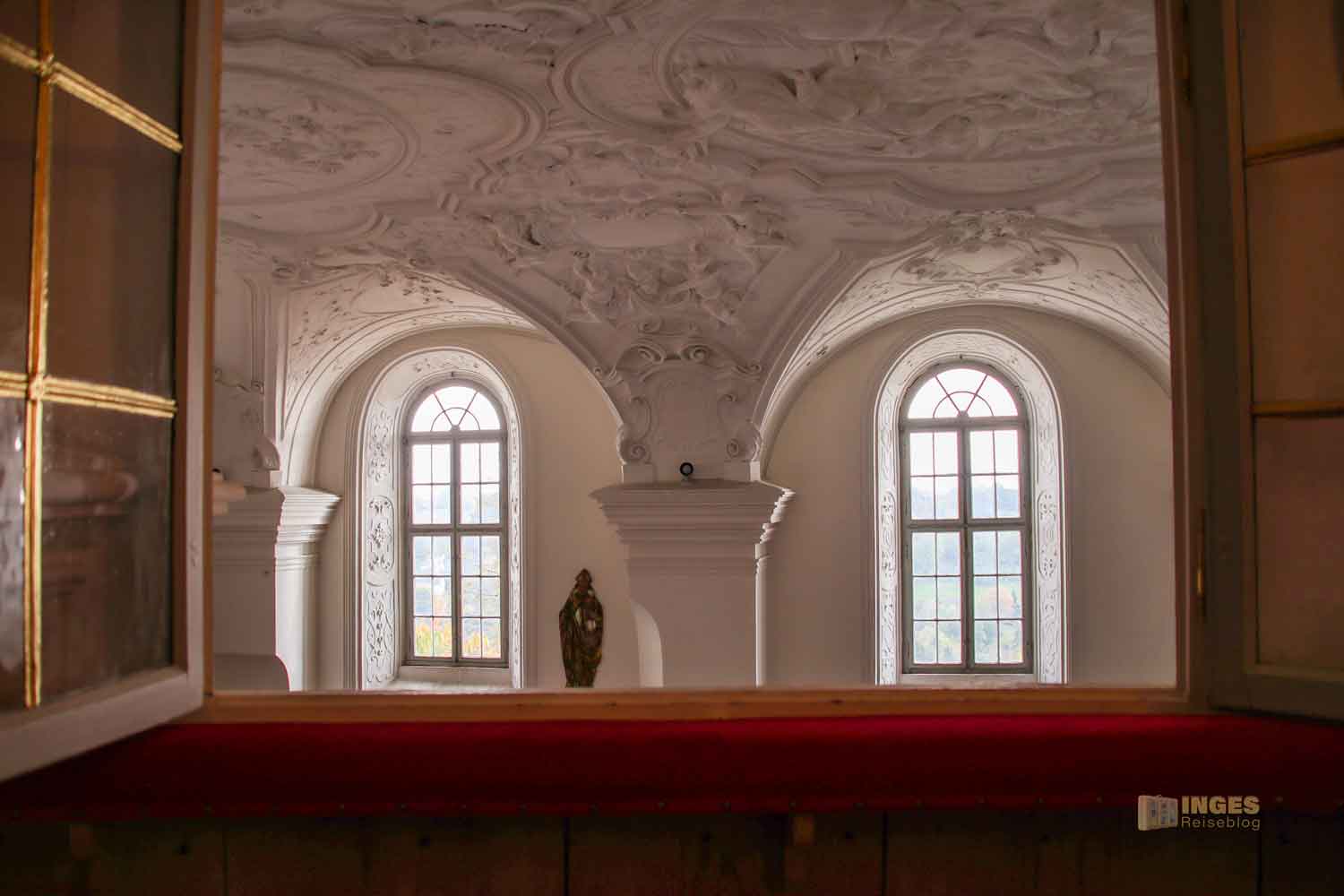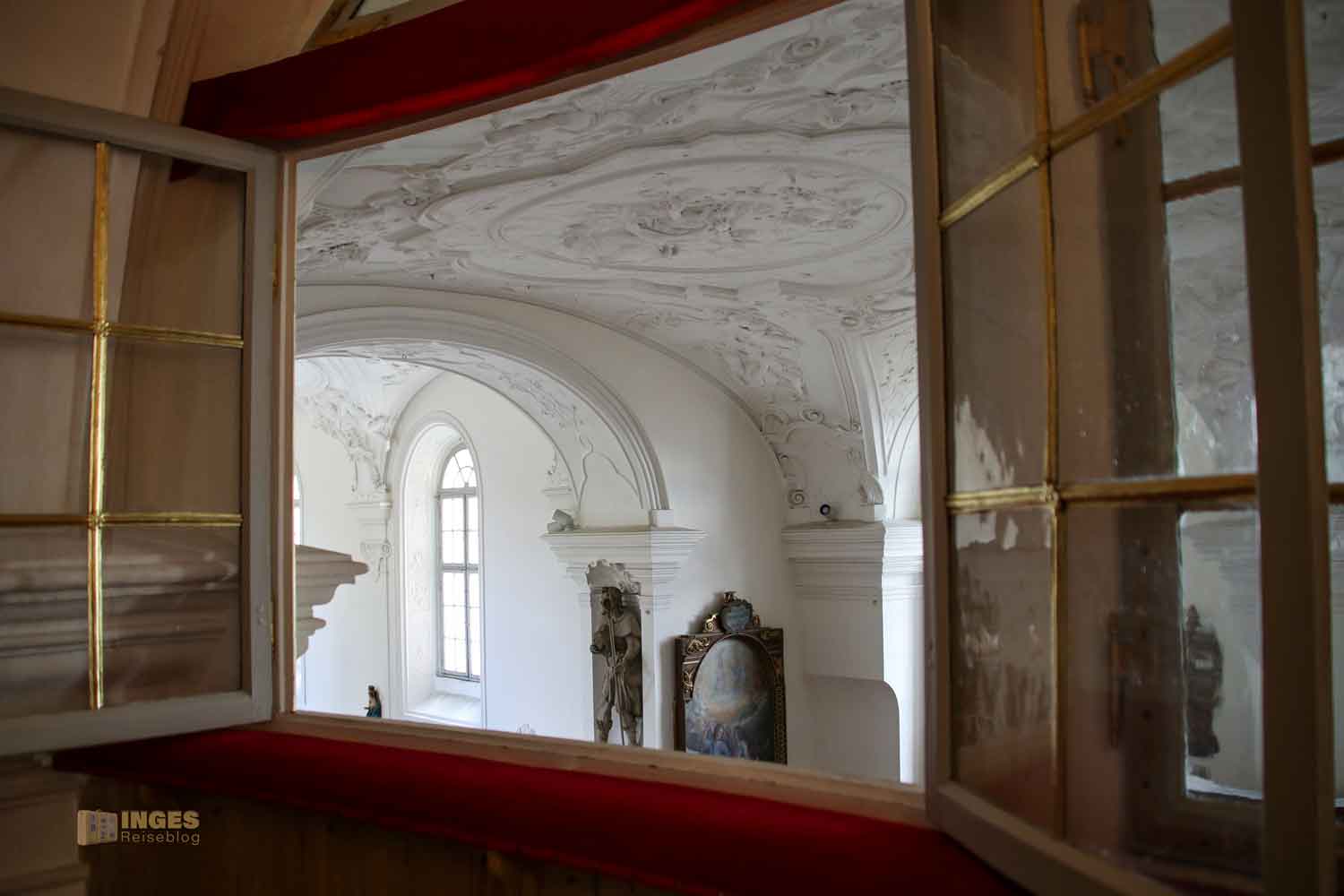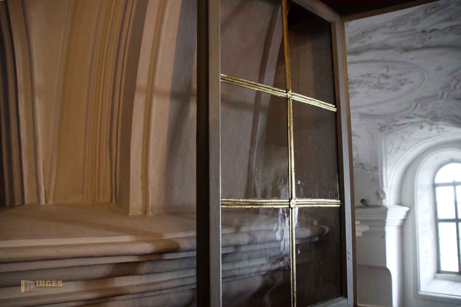 Nun glaubt ja nicht, dass sich so ein Fürstpropst mit dem 'Volk' in die Kirche gesetzt hat. Das gemeine Volk durfte ja sowieso nicht in dieser Kapelle Gottesdienst feiern. Aber wie bei Königs und Kaisers in fast allen Schlosskirchen hatten die ihre eigene Loge. Und im Rahmen der Führung, kann man sich für kurze Momente wie ein Herrscher fühlen, der auf sein 'Volk' schaut. Kommt mit in die