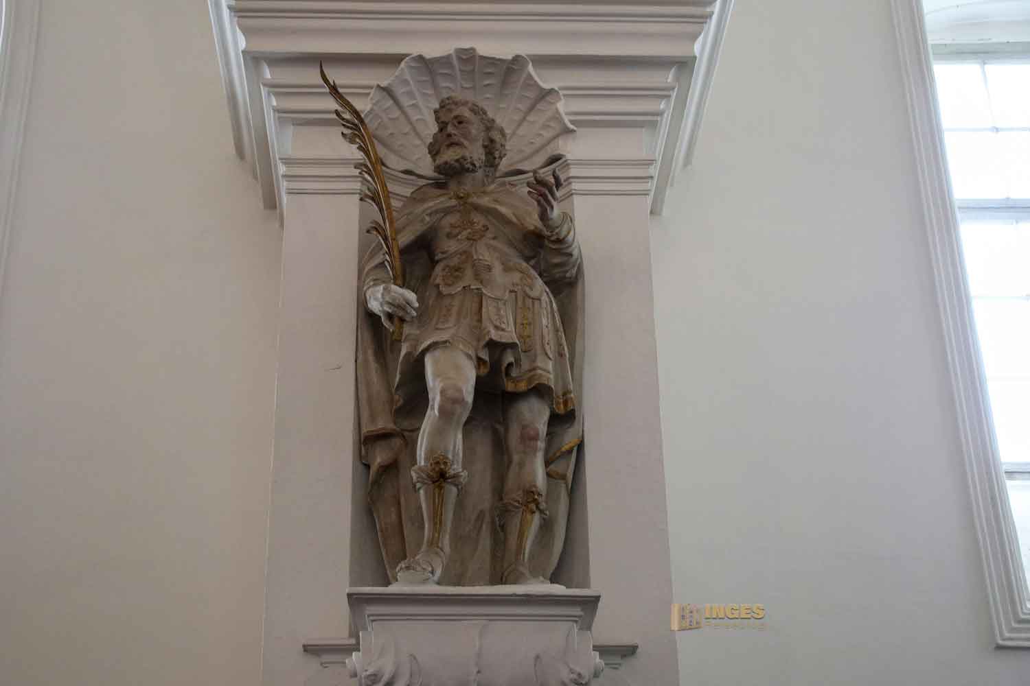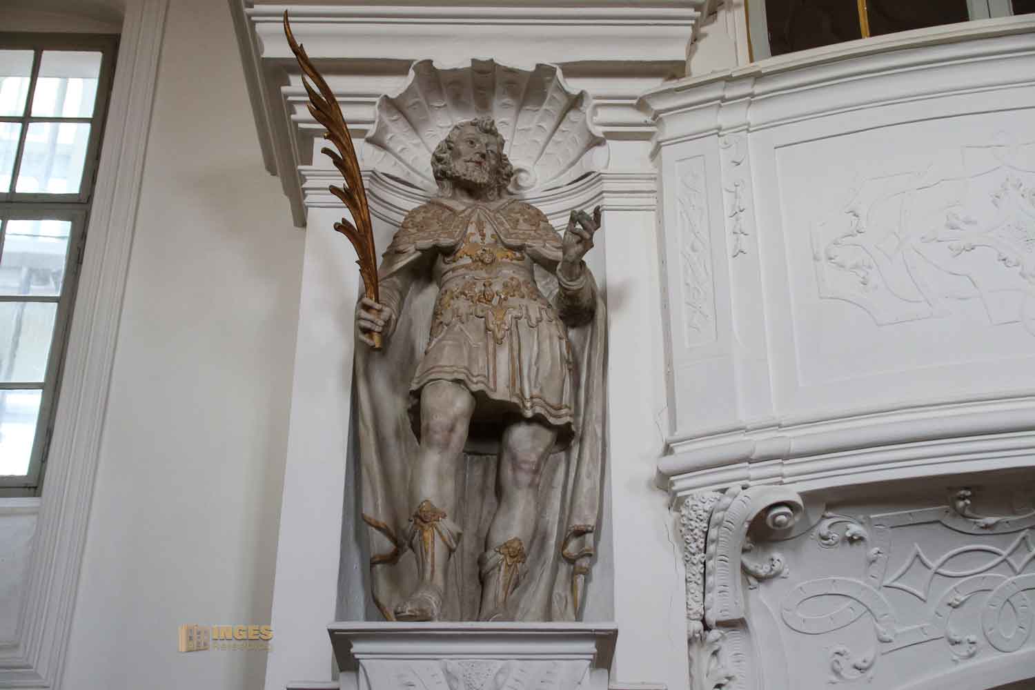 Der hl. Wendelin gilt als der Schutzpatron der Hirten und wird zumeist mit einem Hirtenstab oder einem Tier dargestellt.Ganz klar, dass der Namenspatron der Schlosskapelle in einer Pfeilernische nicht fehlen darf.