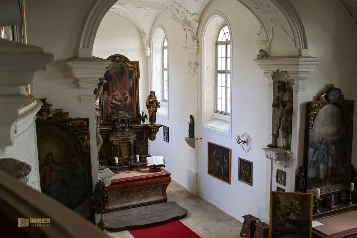in der kleinen Kirche nicht fehlen. Die wird übrigens nicht mehr als Kirche genützt, seitdem sie von Soldaten zur Lagerung von Munition zweckentfremdet wurde. Das passierte ja bei mehreren Kirchen so, u.a. auch in der St. Salvator Kirche in Nördlingen. Diese wurde aber, anders als hier in der Schlosskapelle, wieder geweiht.