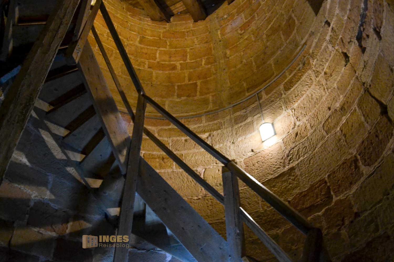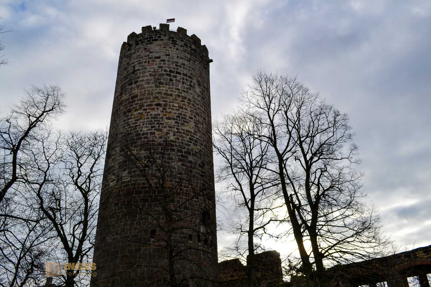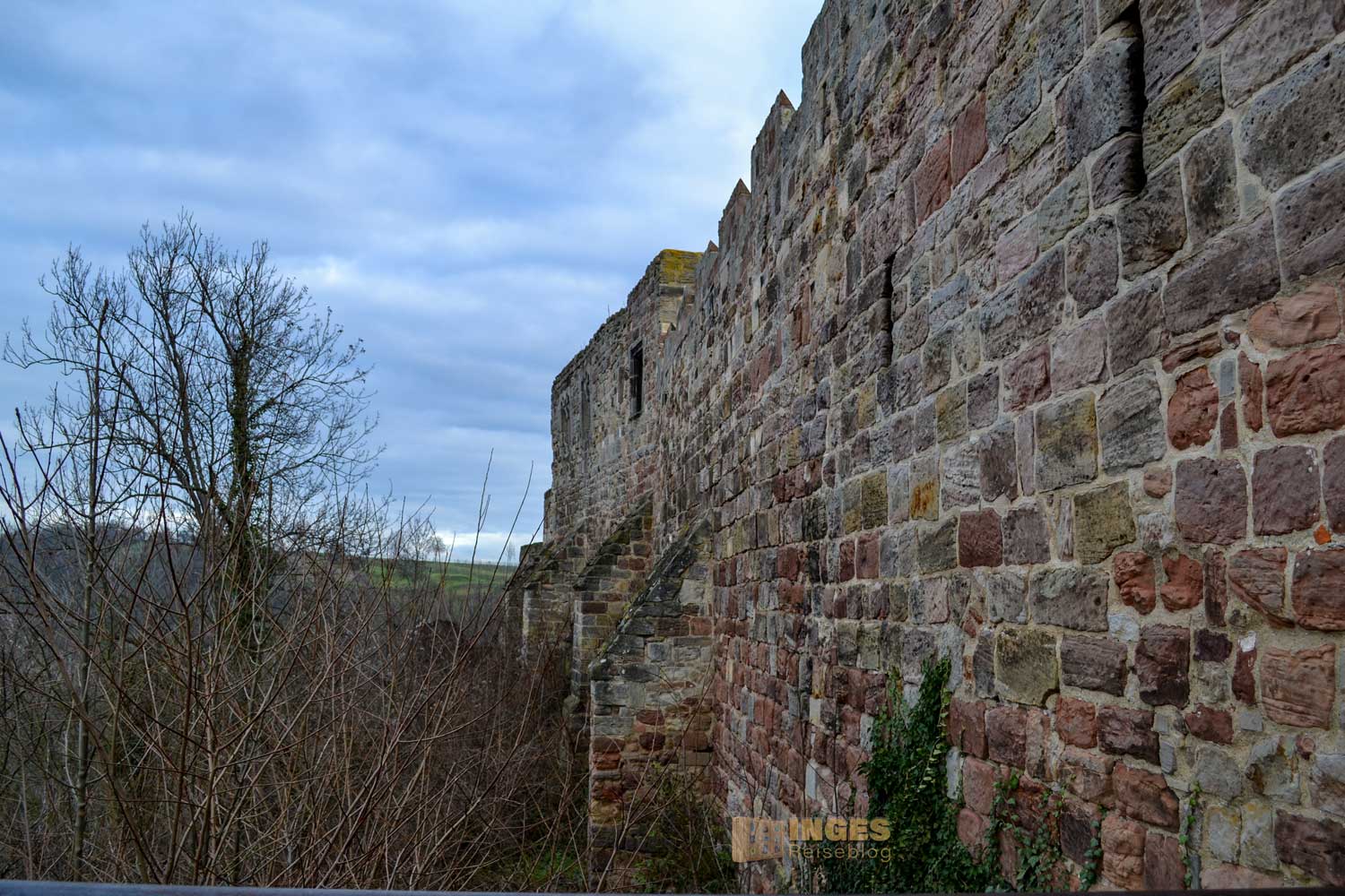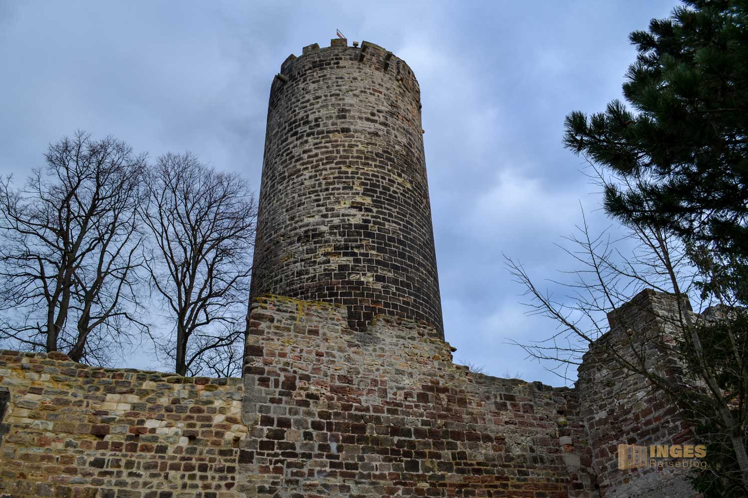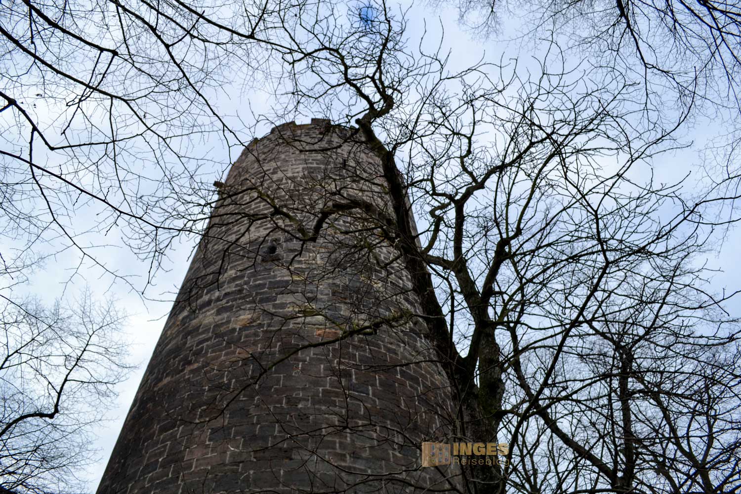 Aus der Zeit um 1230 stammt der wuchtige Bergfried. 32 Meter ragt er in die Höhe und hat eine Mauerstärke von 3,60 Meter. Den ursprünglichen Hocheingang in 8 Meter Höhe gibt es heute nicht mehr. Wäre vielleicht bei der Begehung des Turms ein bisschen umständlich. Man kann den Bergfried nämlich begehen, hinauf ins Turmgemach und der Wachstube. Ich habe mich aber lieber an der Außenansicht erfreut und auf eine Begehung nach dem ersten Eindruck verzichtet. Nicht, dass es mir nicht sicher erschien, aber ihr kennt ja mein Problem mit 'nicht schwindelfrei'. Spontan fiel mir dann aber bei der Außenansicht das Märchen der Gebrüder Grimm ein "Rapunzel, Rapunzel, lass dein Haar herunter".