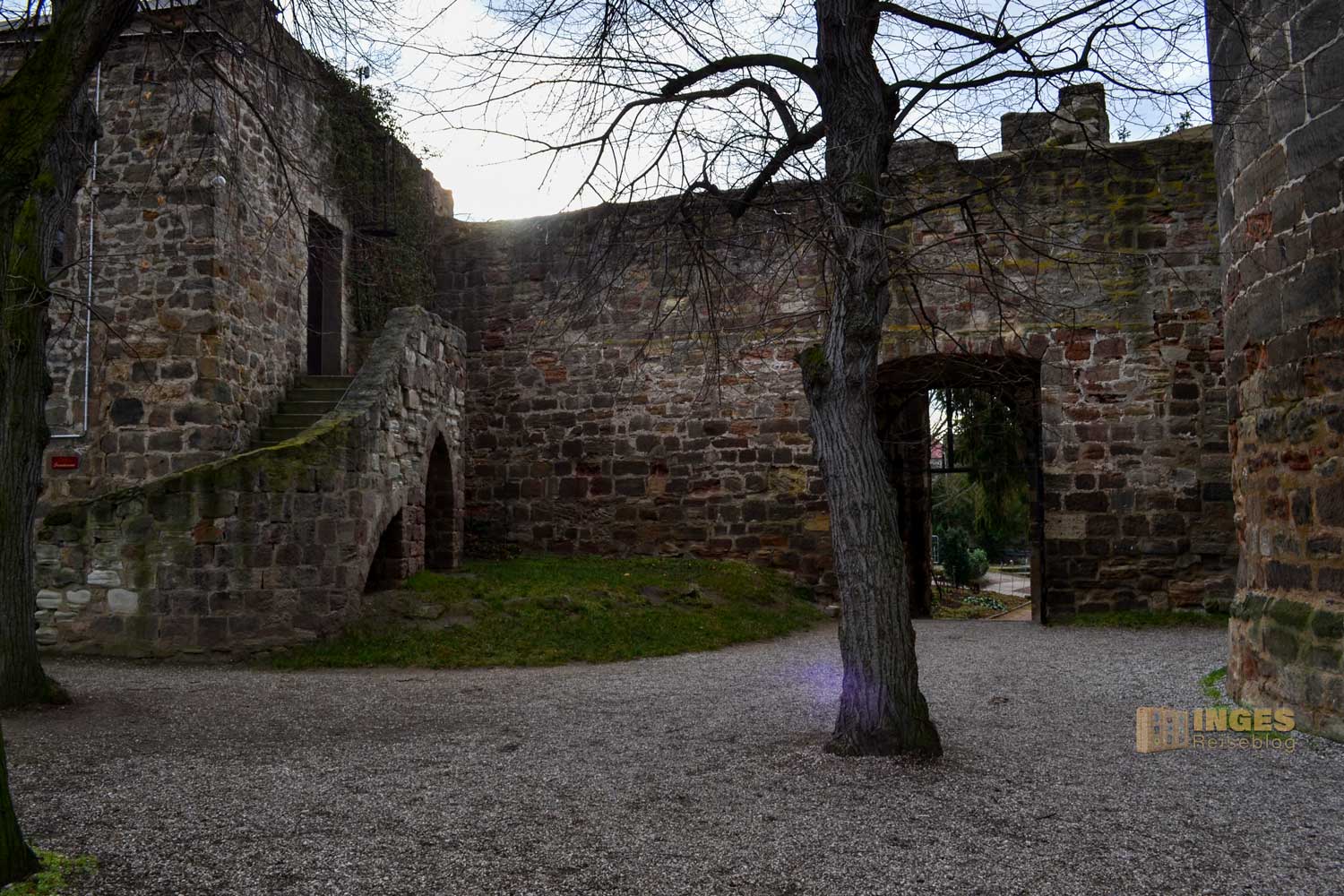 In die Kernburg gelangt man durch ein Kammertor mit romanischen Kantensäulen. Bei mittelalterlichen Burgen, und auch bei Stadtbefestigungen aus dieser Zeit, liegen oft zwei hintereinander angeordnete Tore, durch Mauern miteinander verbunden - das sogenannte Kammertor. So entsteht eine gut zu überwachende Passage, die sich gut in die bestehende Bebauung integrieren lässt.