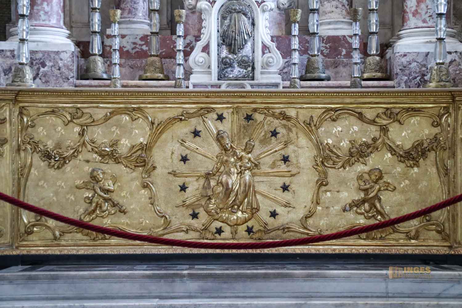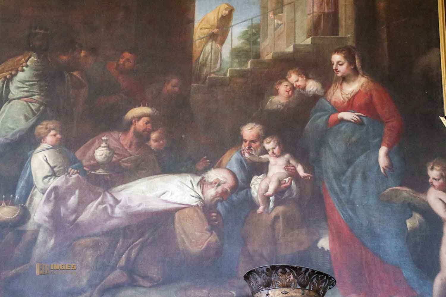 Das Hauptgemälde in der Mitte zeigt die Jungfrau Maria, wie sie dem Seligen Simeon Stock erscheint und ihm das Skapulier übergibt. Ich habe euch weiter vorne in meinem Bericht über diese Erscheinung geschrieben. 5,33 Meter ist es lang und 3,42 Meter breit. Engelbilder umrahmen das Hauptgemälde. Ein Eckgemälde symbolisiert die drei göttlichen Tugenden Glaube, Hoffnung und Liebe. Ein weiteres die Buße, die Demut und die Wahrheit. In einem weiteren Eckgemälde werden die Besonnenheit, die Reinheit und die Bedachtsamkeit dargestellt und im vierten die Stärke und die Gerechtigkeit.