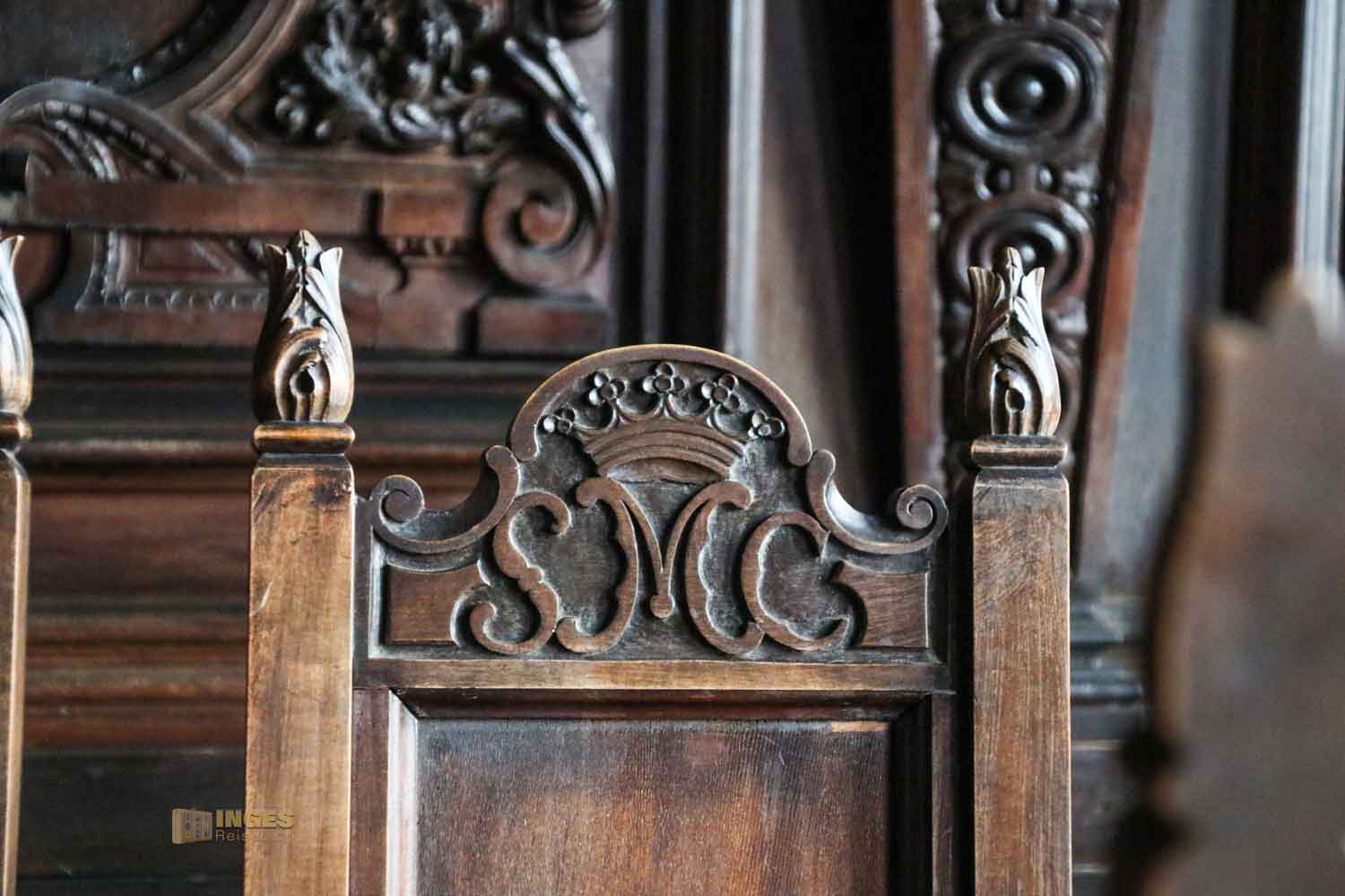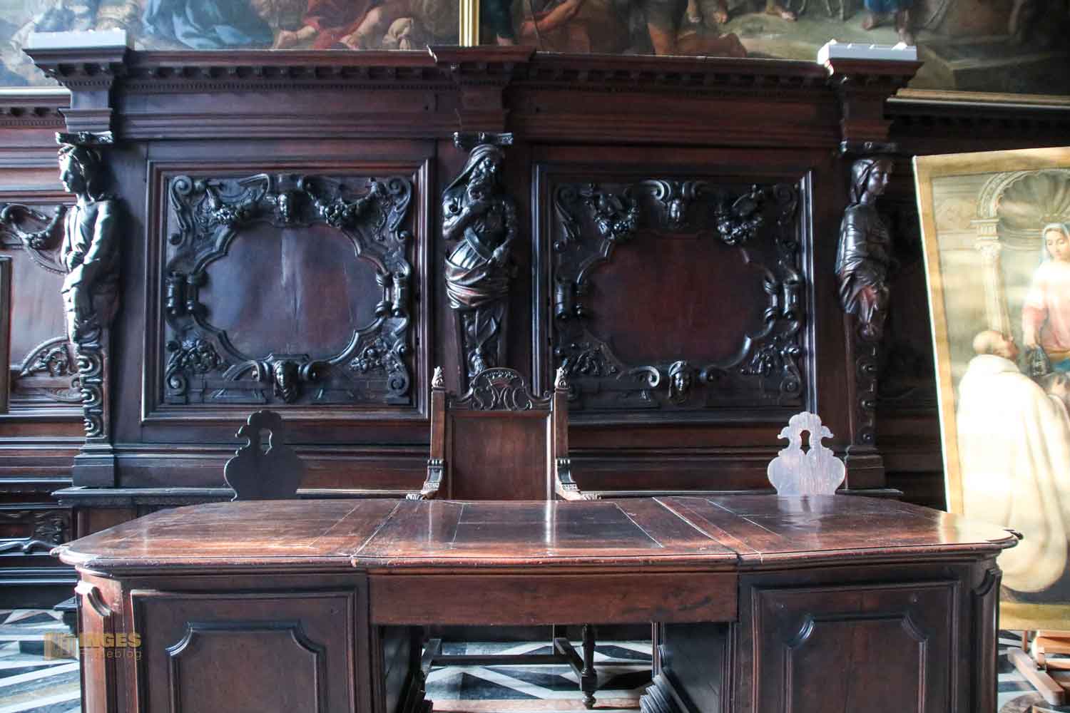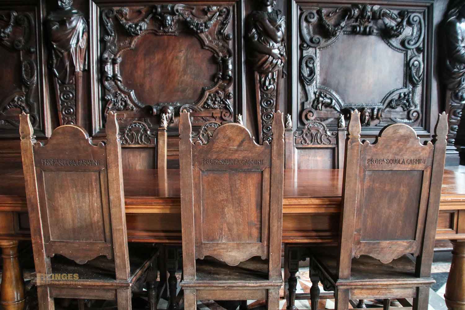 Ein letzter Blick durch den Raum. Die Sitzgelegenheiten wurden mit dem Namen der Scuola versehen, gleiches sieht man auch in der Kirche der Bruderschaft.