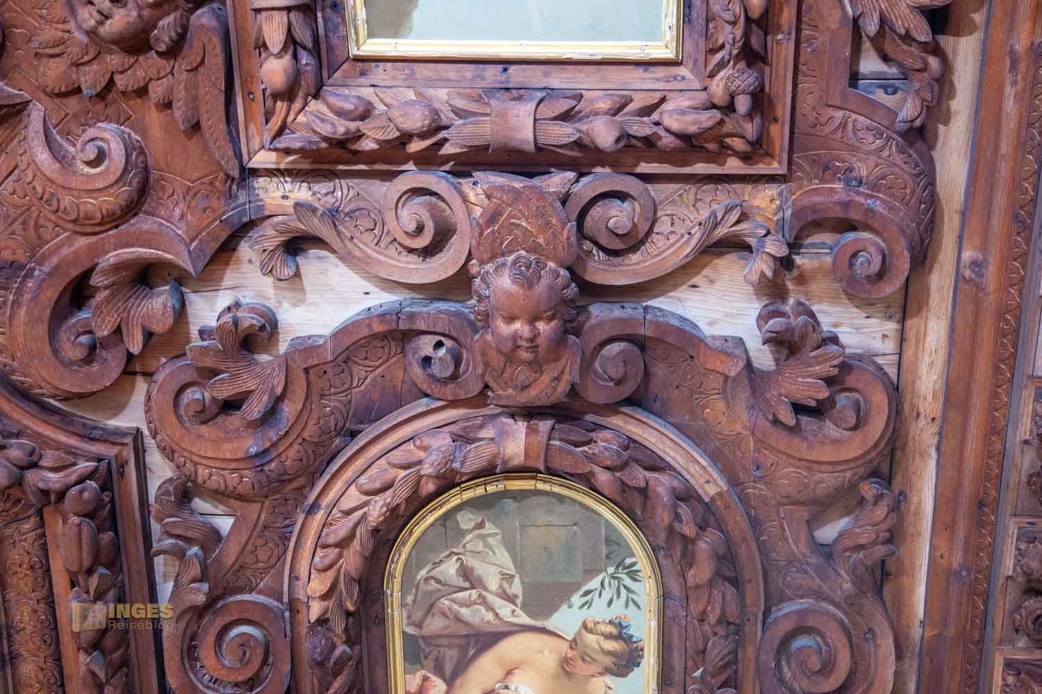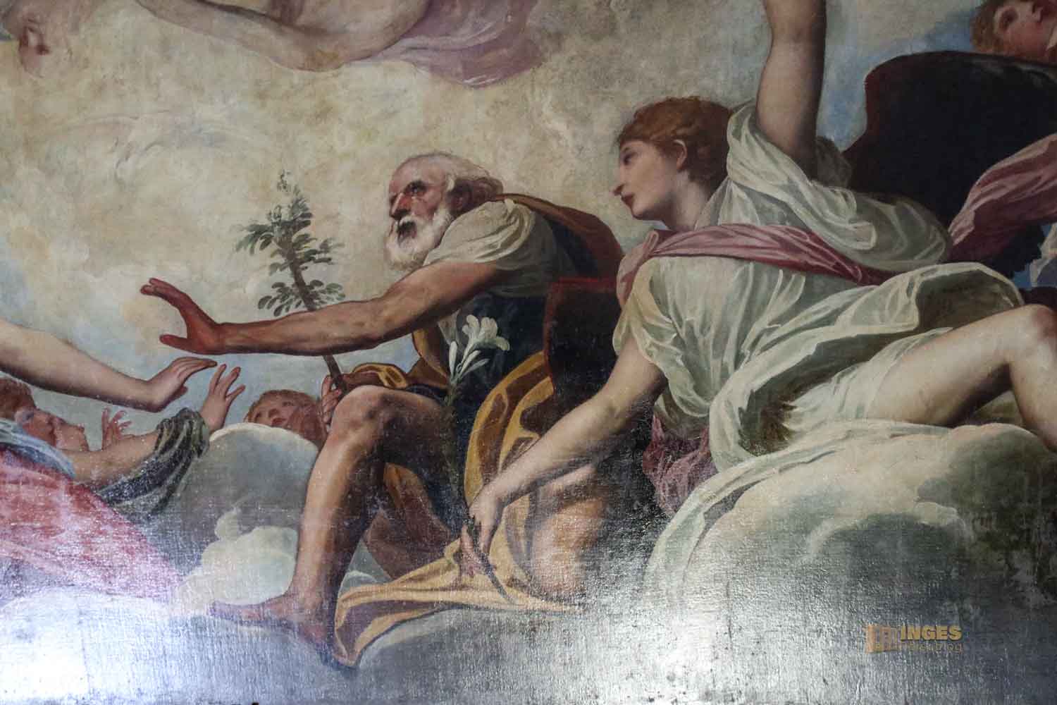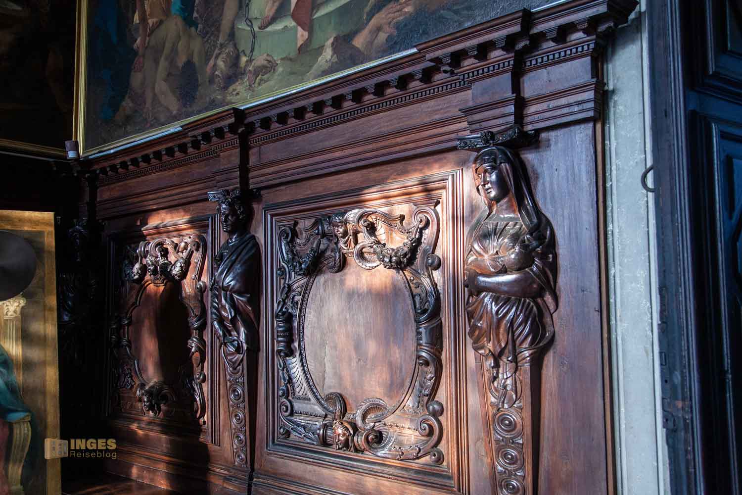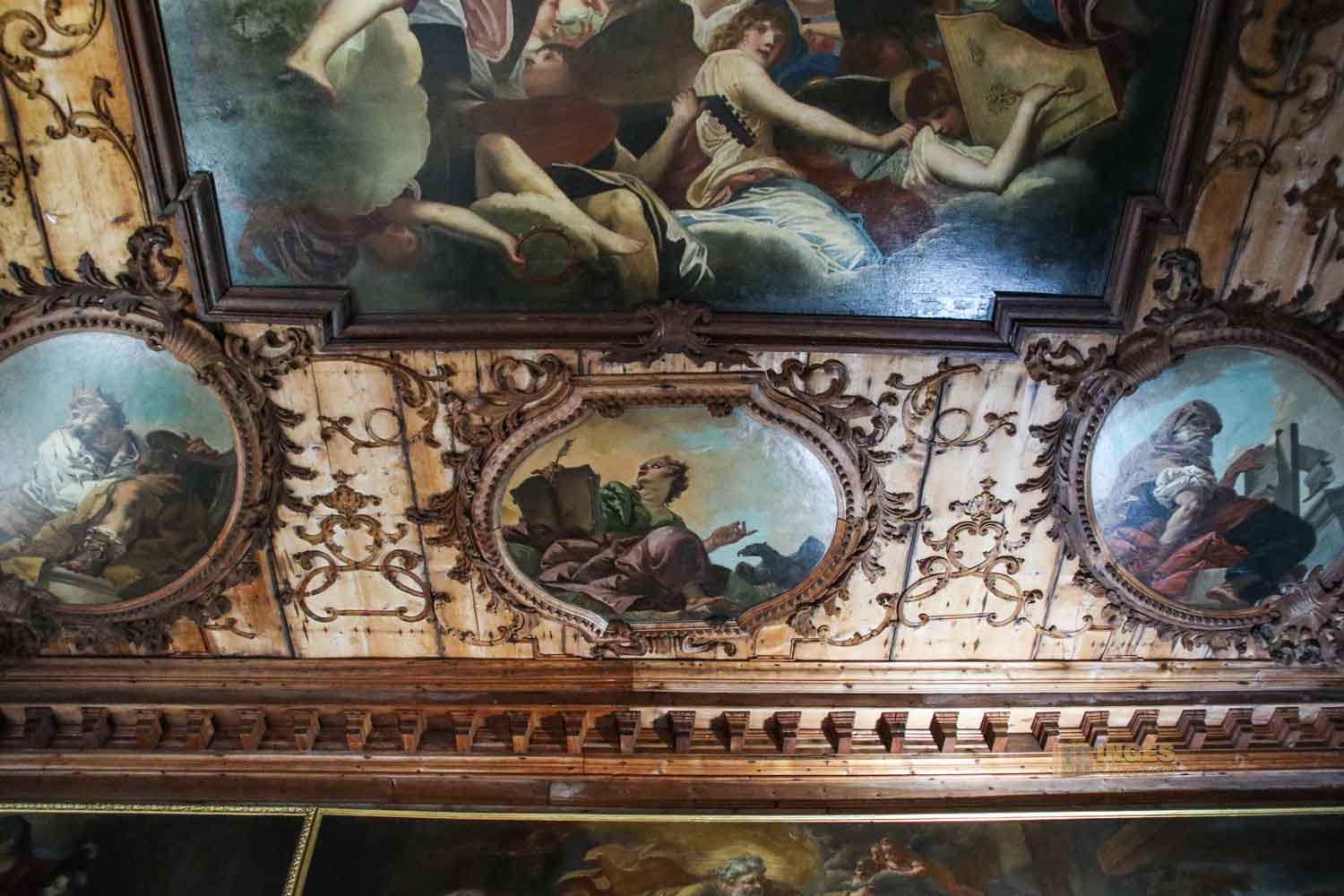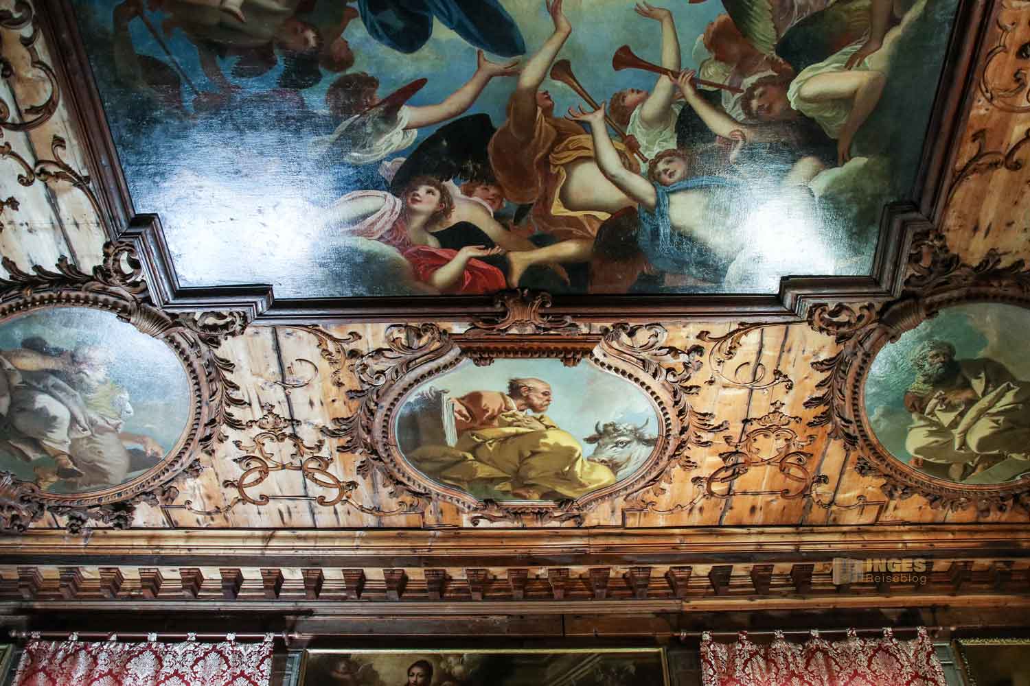 Der Stil des 16. Jahrhunderts wurde hier nachgestellt, die Holzarbeiten aus Nußbaumholz schreibt man Giacomo Piazzetta zu. Die Kasetten hat Giustino Menescardi mit Gemälden ausgeschmückt. Von Tiepolo zunächst beeinflusst fand er seinen eigenen Stil und war in Venedig in mehreren Objekten beschäftigt, u.a. auch im Dogenpalast. Viele Jahre war er in der Malerbruderschaft Venedigs eingetragen - und wenn ihr noch mehr über ihn erfahren möchtet, dann klickt HIER.