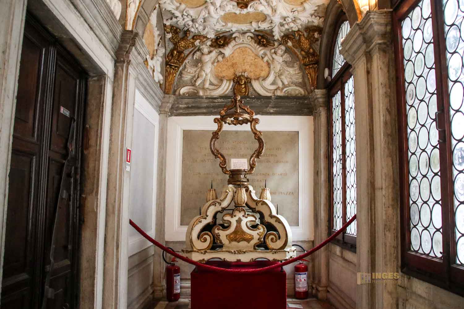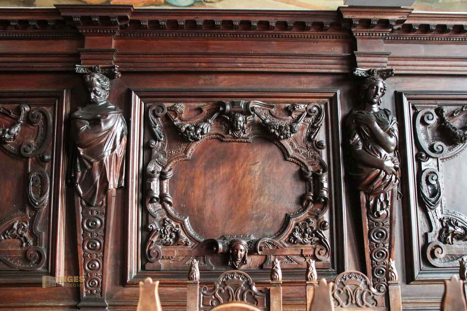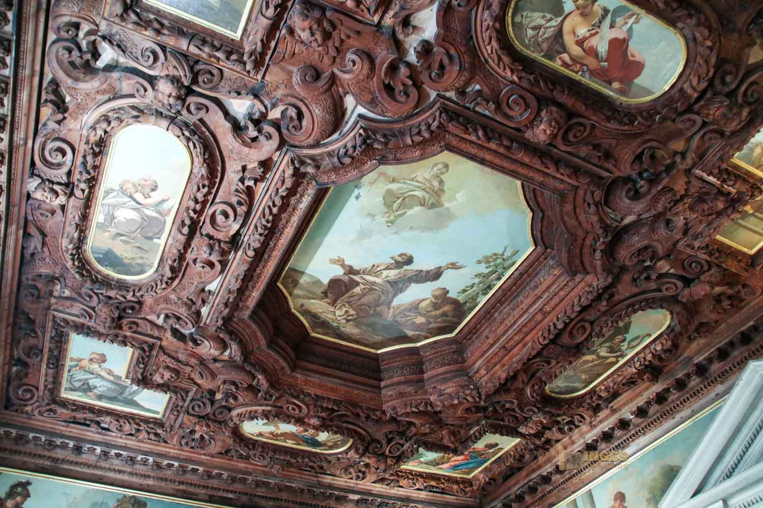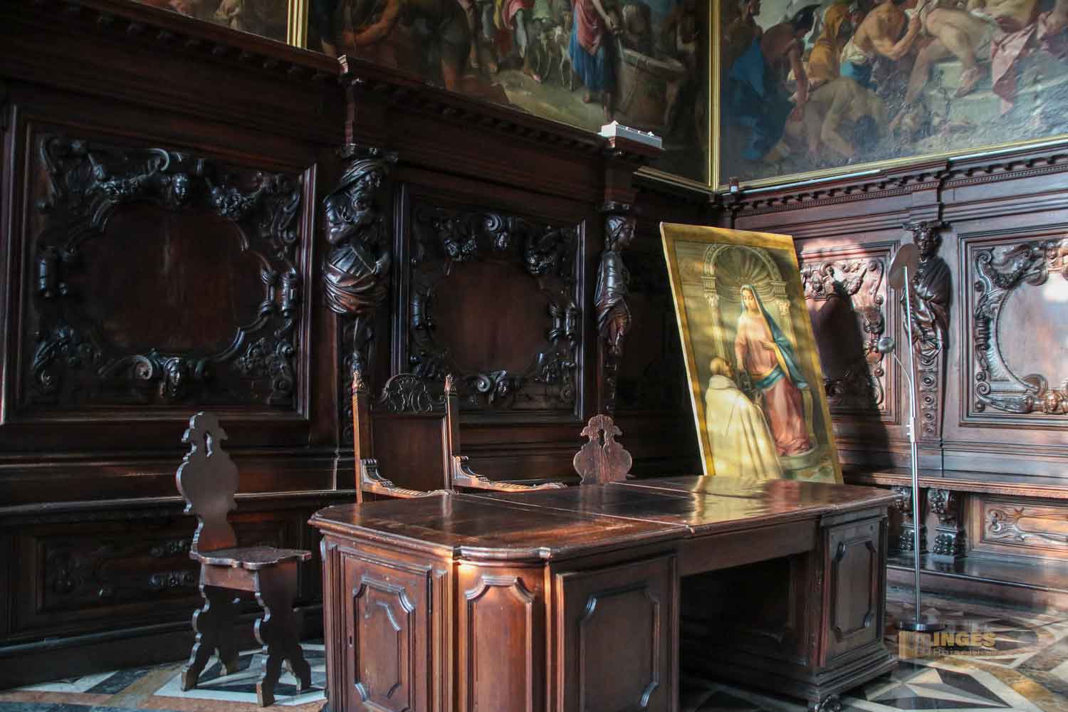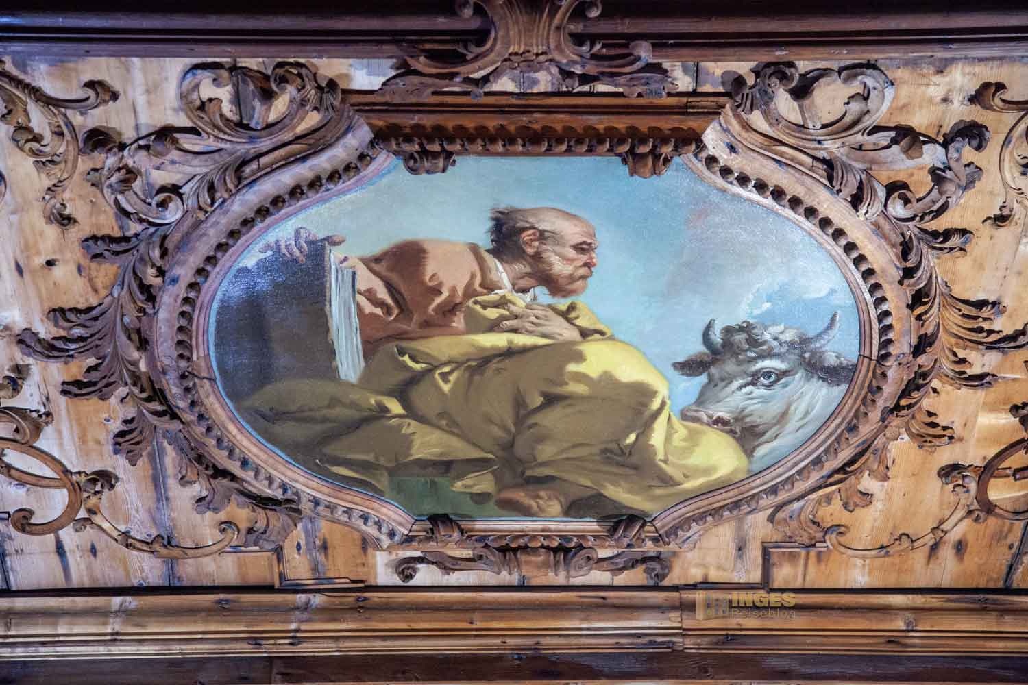 Der Stil des 16. Jahrhunderts wurde hier nachgestellt, die Holzarbeiten aus Nußbaumholz schreibt man Giacomo Piazzetta zu. Die Kasetten hat Giustino Menescardi mit Gemälden ausgeschmückt. Von Tiepolo zunächst beeinflusst fand er seinen eigenen Stil und war in Venedig in mehreren Objekten beschäftigt, u.a. auch im Dogenpalast. Viele Jahre war er in der Malerbruderschaft Venedigs eingetragen - und wenn ihr noch mehr über ihn erfahren möchtet, dann klickt HIER.
