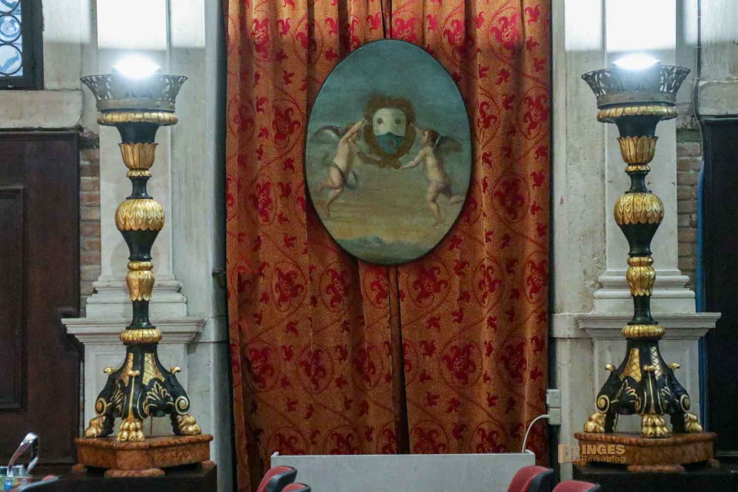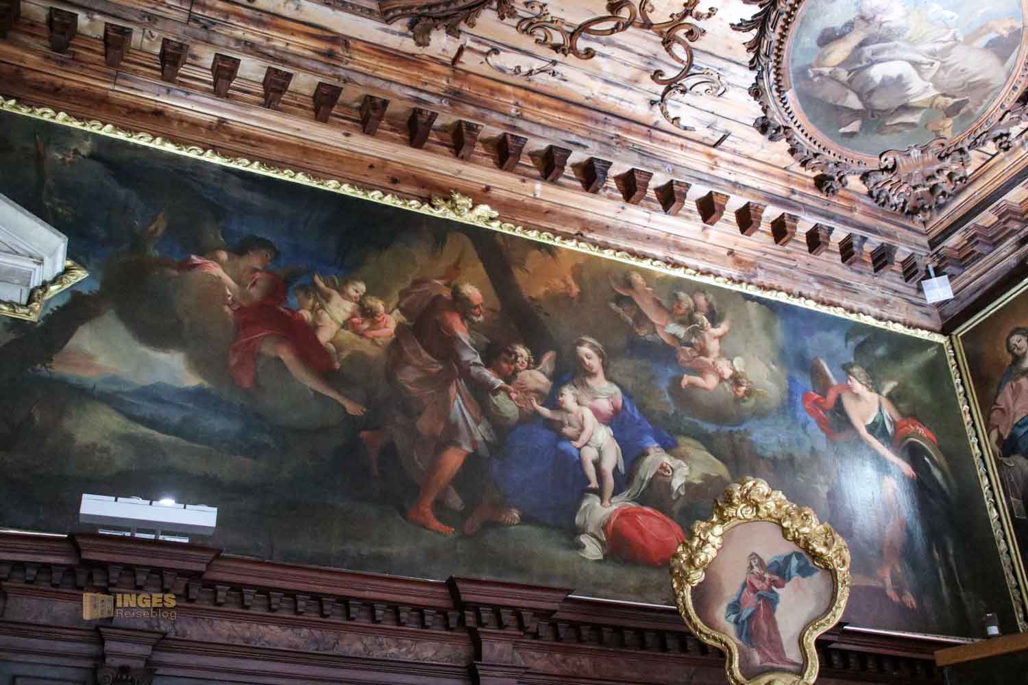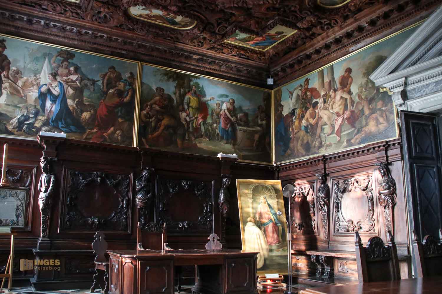 Wie ein roter Faden zieht sich die Verehrung um die Mutter Gottes durch die ganze Scuola. Dieser Saal nicht ausgenommen. In ihm haben sich die Brüder der Vereinigung versammelt, um die Vertreter der Scuola zu wählen und wichtige Entscheidungen zu treffen. Ich muss den Saal in den Erklärungen etwas aufdröseln, mein Blick geht zuerst zum