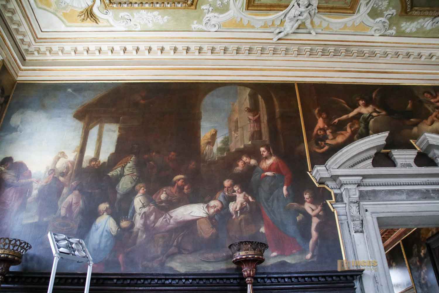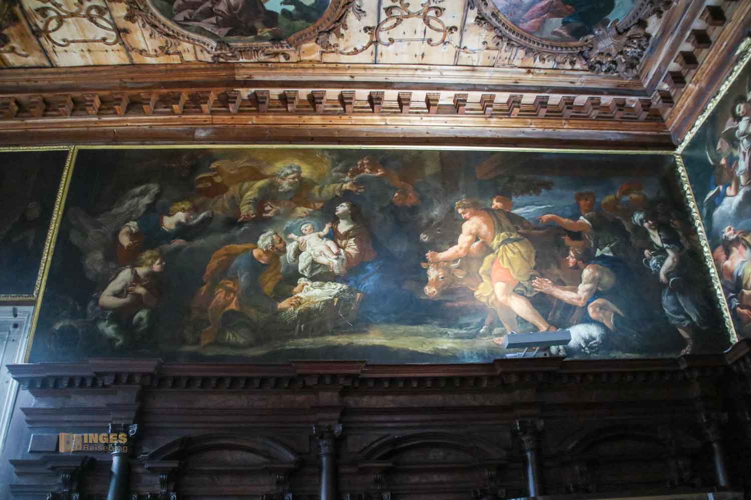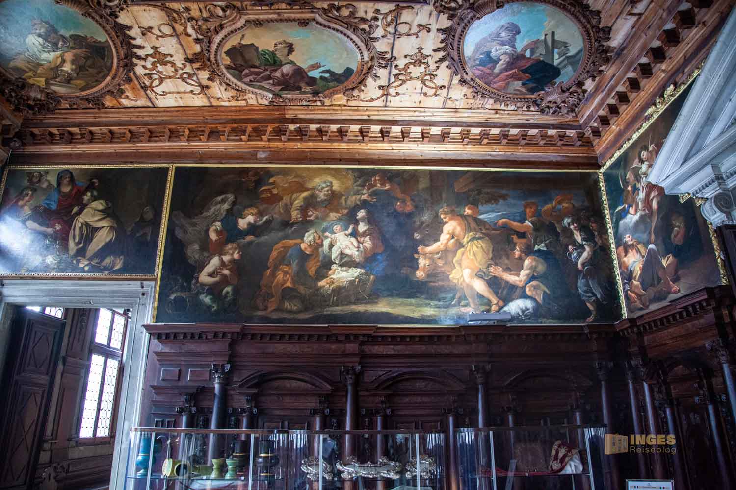 Wie ein roter Faden zieht sich die Verehrung um die Mutter Gottes durch die ganze Scuola. Dieser Saal nicht ausgenommen. In ihm haben sich die Brüder der Vereinigung versammelt, um die Vertreter der Scuola zu wählen und wichtige Entscheidungen zu treffen. Ich muss den Saal in den Erklärungen etwas aufdröseln, mein Blick geht zuerst zum