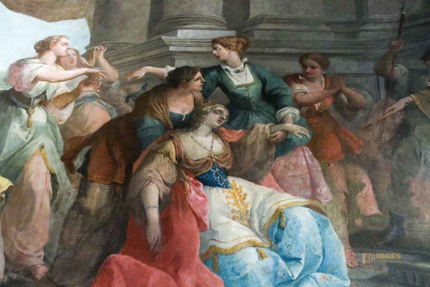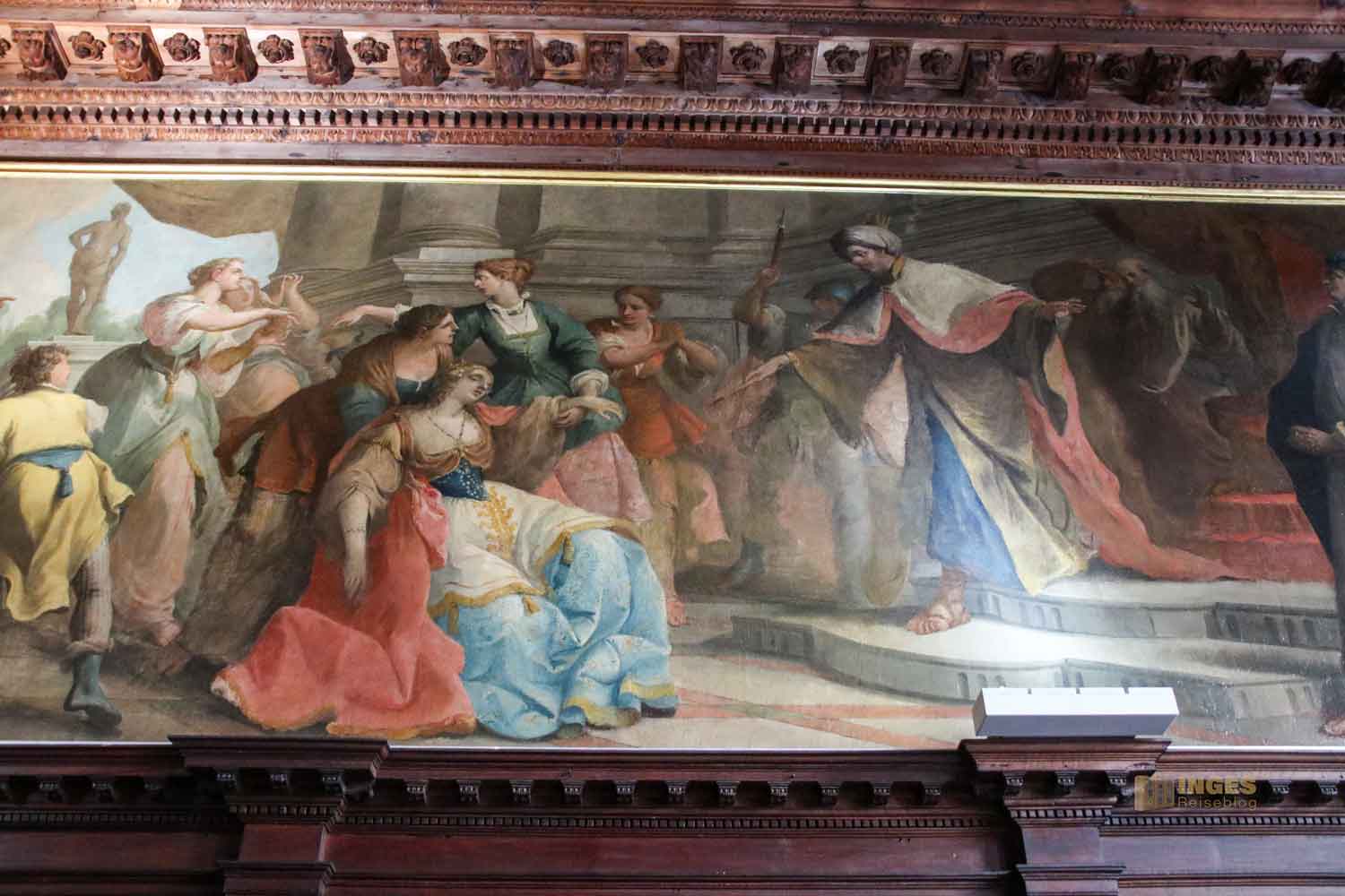 wurden von verschiedenen Künstlern geschaffen. Sind es an der Decke Sibyllen, so wurden an den Wänden die Propheten verewigt. Ein Gemälde fällt mir dann genauer auf - dieses Thema hatte ich doch am heutigen Tag schon. Aus dem Buch Ester sind in der Kirche San Sebastiano in verschiedenen Szenen die Deckengemälde. Hier im Archivsaal fällt Ester vor dem König Ahasveros in Ohnmacht. Vielleicht deshalb, weil er sie gerade zu seiner nächsten Frau erwählt hat?