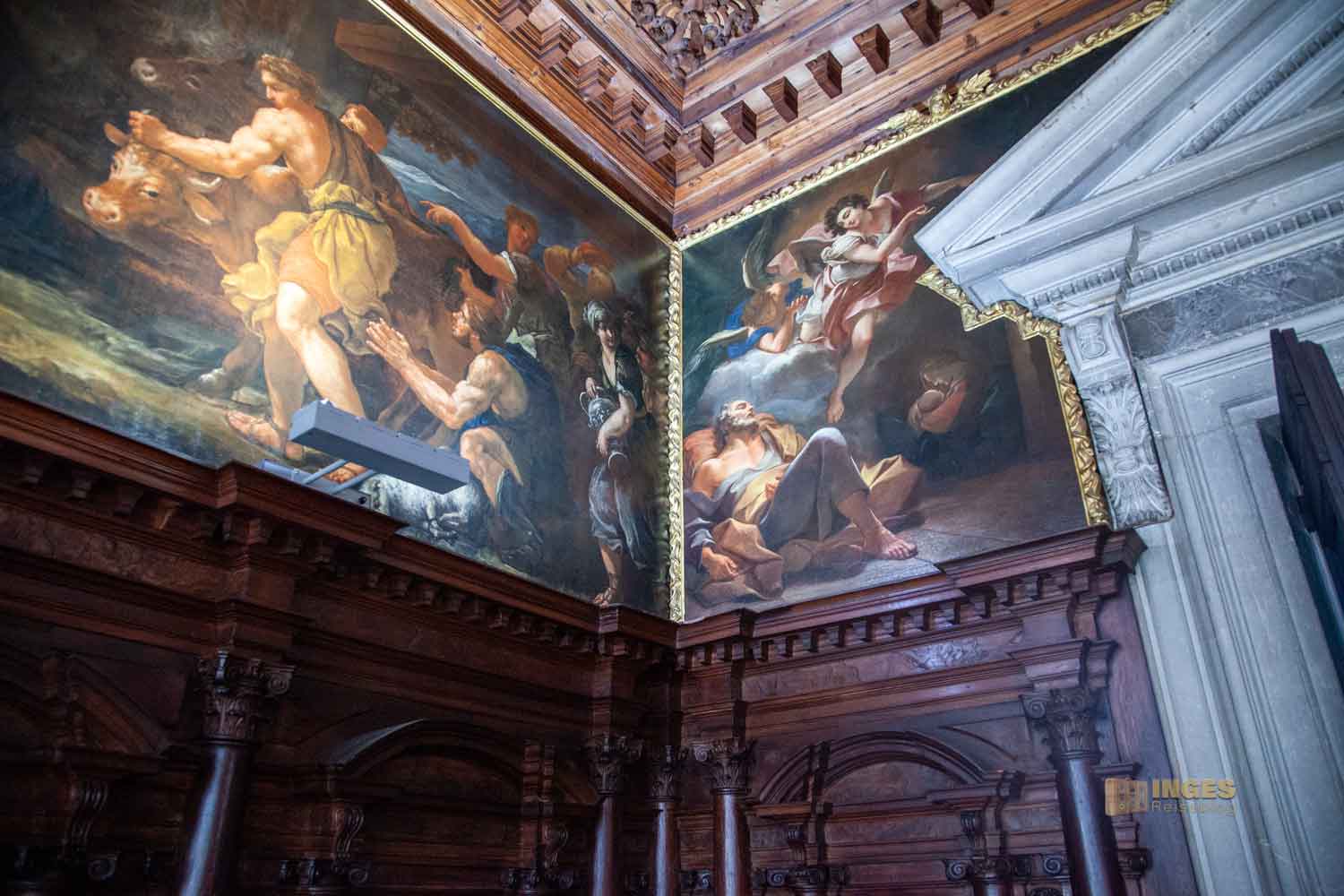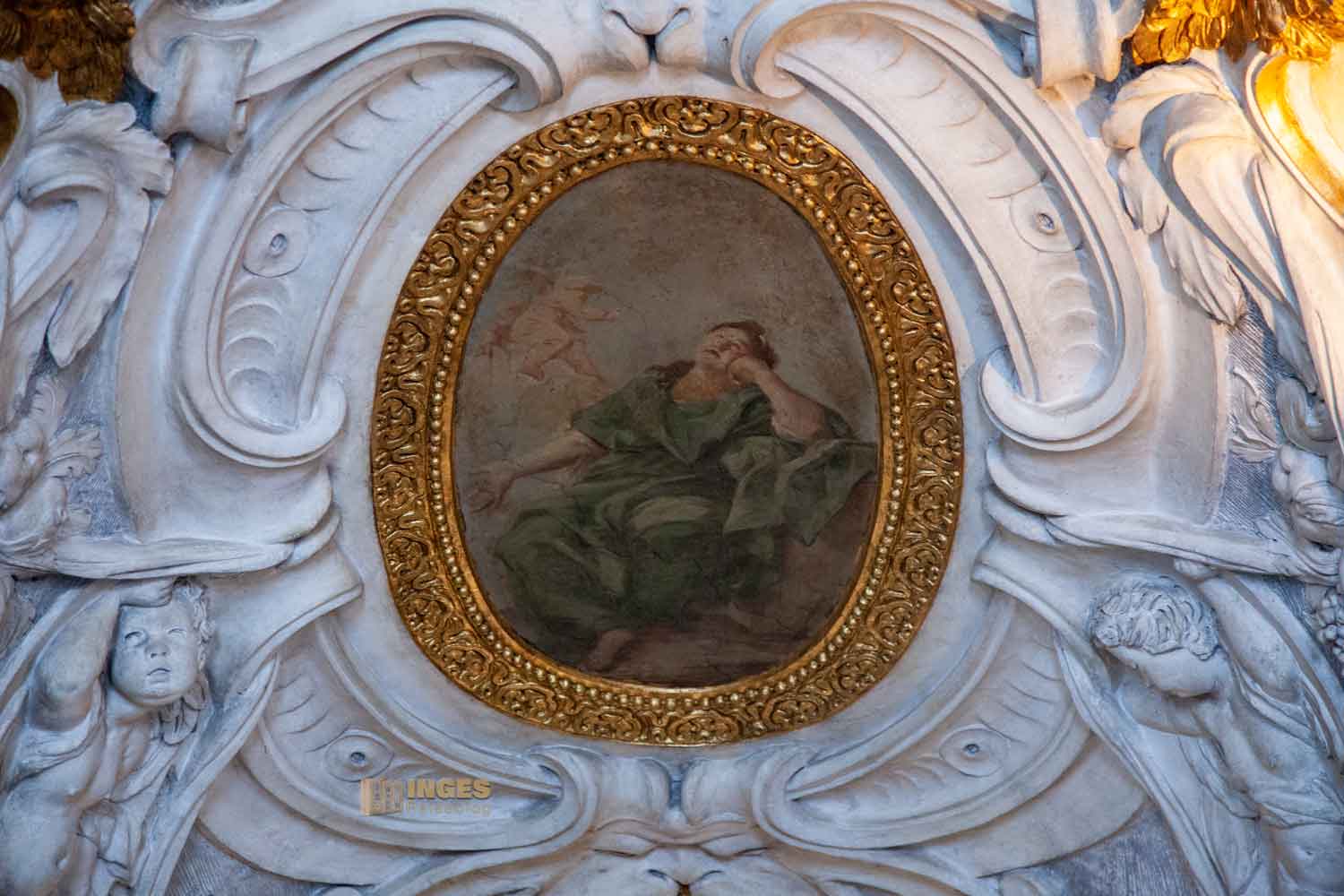 Im zentralen Deckengemälde zeigt er die Erscheinung der Hl. Jungfrau dem Propheten Elias, die Szene ereignet sich auf dem Berg Karmel. In zehn kleinen Gemälden um das Hauptbild stellt er 10 Sibyllen dar. Dem Mythos nach sind das Prophetinnen, die unaufgefordert die Zukunft weissagen, meist doppeldeutig und oft auch in Form eines Rätels.