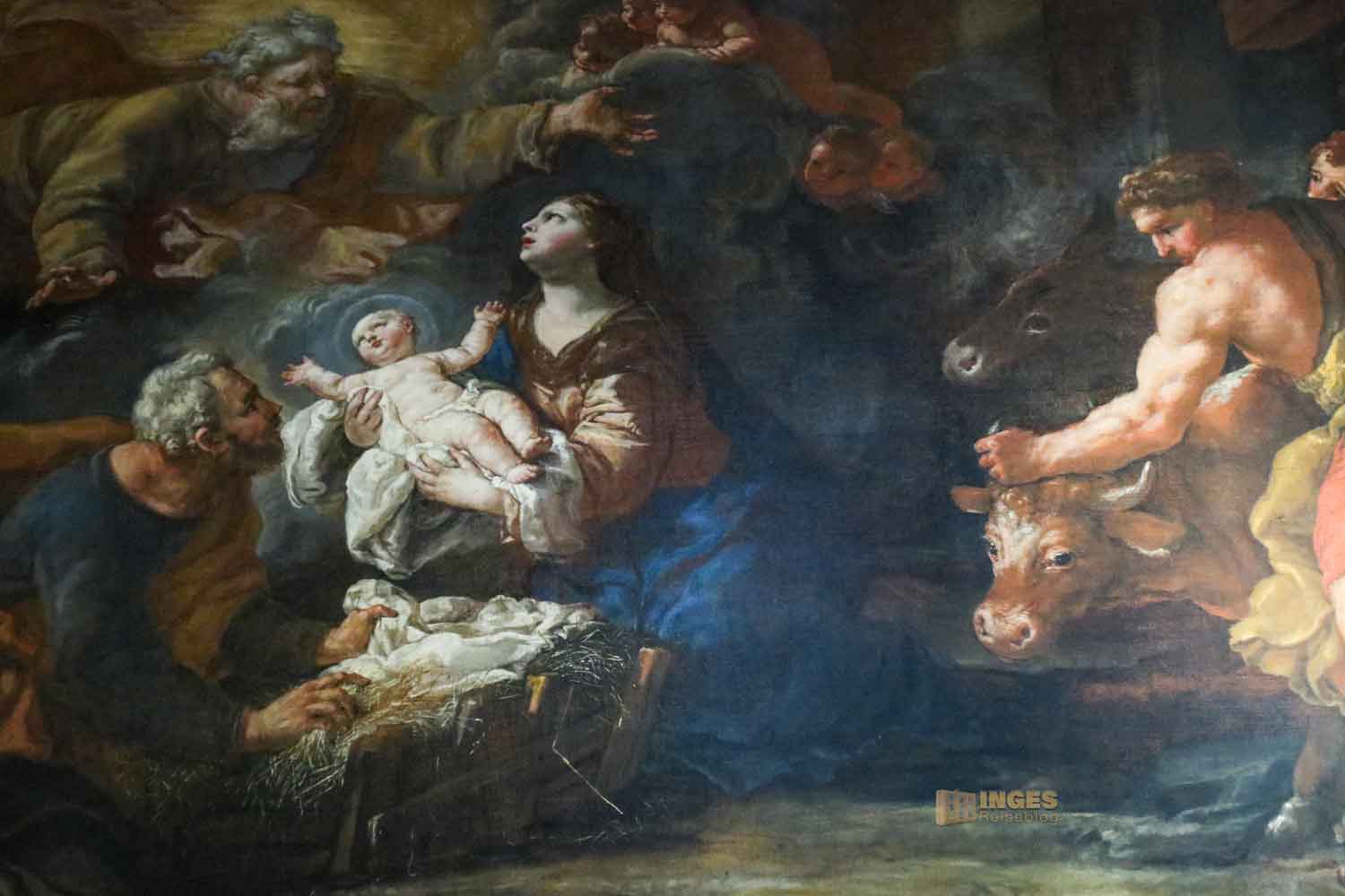 zieren Gemälde von verschiedenen Künstlern. U.a. zeigt ein großes Gemälde die Anbetung des Jesuskindes durch die Hirten.
