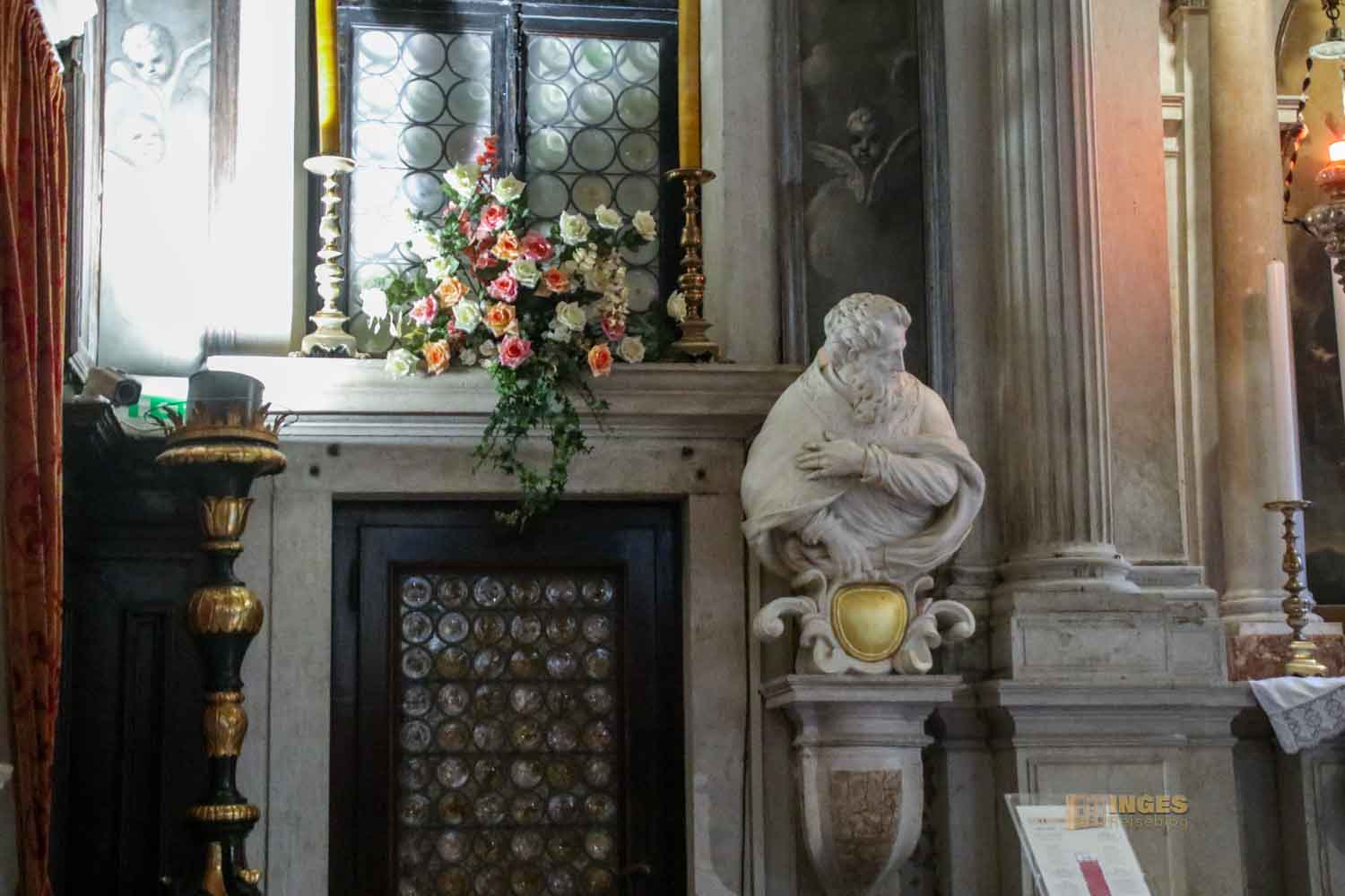 erinnern mich an den Kapitelsaal der Scuola Grande di San Rocco, die aber früher, viel aufwändiger und von einem anderen Künstler gefertigt wurden. Aber man darf sich ja inspirieren lassen? Vielleicht dachte sich das der Künstler der Scuola Grande dei Carmini bei der Erschaffung seiner Holzfiguren auch, die rings im Saal an der Wandvertäfelung stehen. Man schreibt dem Künstler auch die Figuren im Chorraum der gegenüberliegenden Kirche Santa Maria dei Carmini zu.