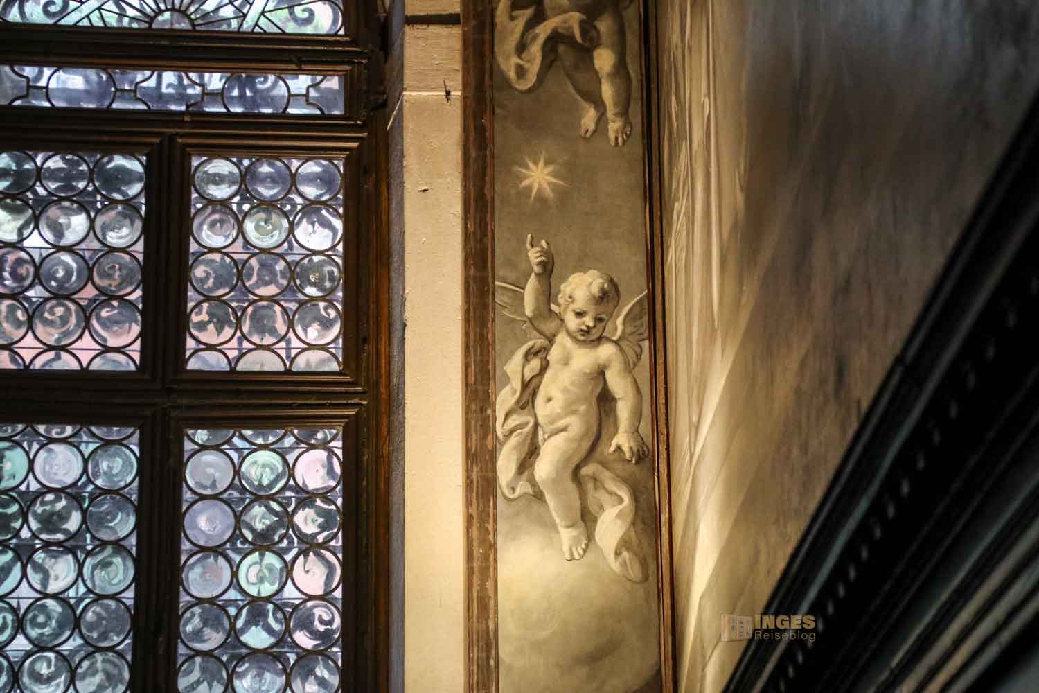 muss ich erstmal sortieren. Wenn man bedenkt, dass die antike Originalausstattung der Innenräume der Scuola vollständig erhalten geblieben ist, dann war das schon eine Meisterleistung der Ausstattung. Als erstes geht mein Blick nach oben, zur