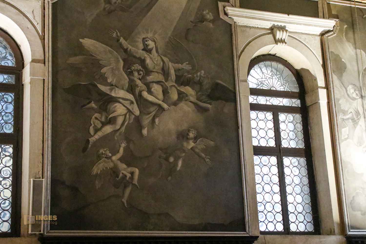 Nicolò und Sohn Giovanni Bambini haben die Wände mit 19 Gemälden ausgestattet - eine Maltechnik, die ich in unseren ganzen Besichtigungen so nicht in Häufe gesehen habe. Sie sind in schwarz/weiß/grau gestaltet und spiegeln damit die Schlichtheit des Karmiterordens wider.