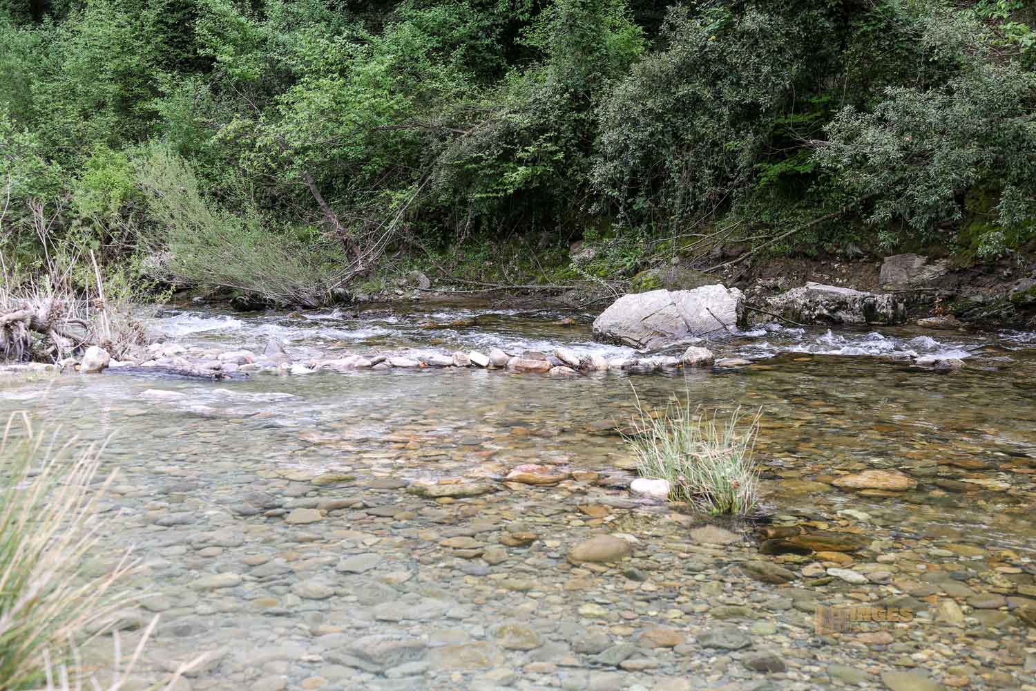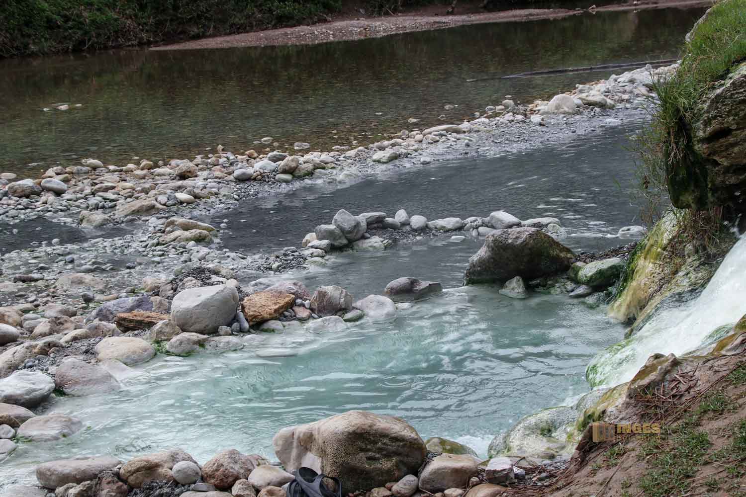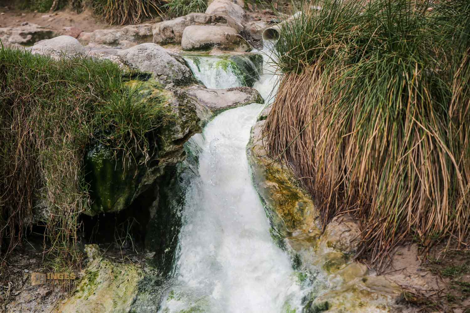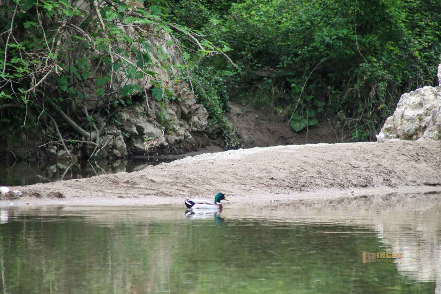 Denn das schwefelhaltige Wasser hinterlässt sein Düftchen. Über kleine Trampelwege und über Steine geht es zu den kleinen Steinbecken. Und mitten hinein in die Natur und zum Bachbett der Farma.