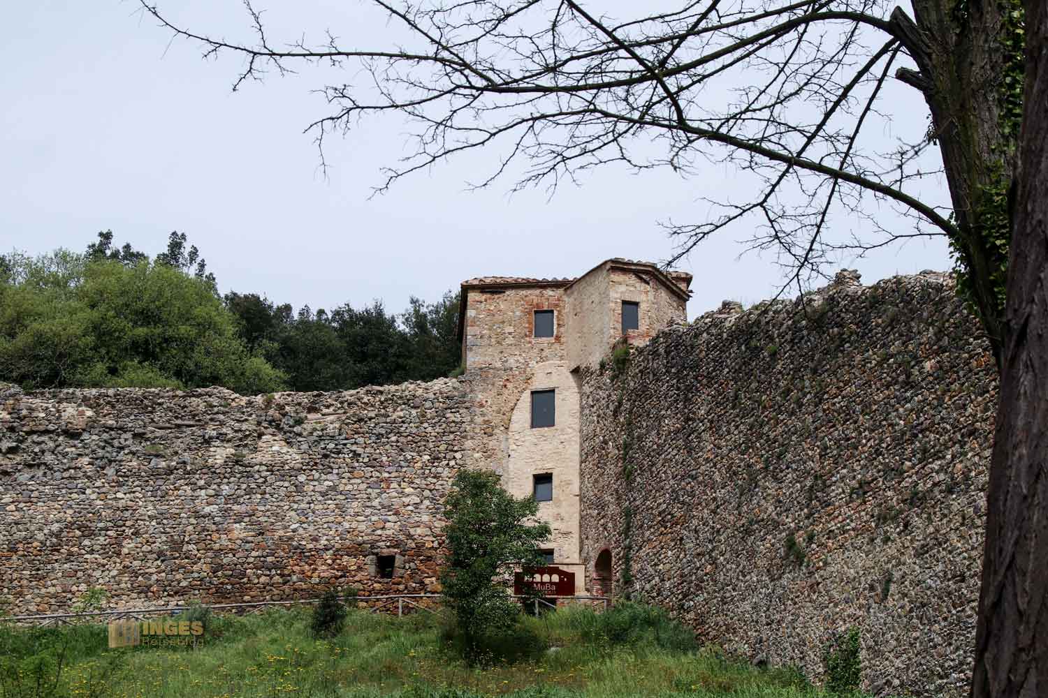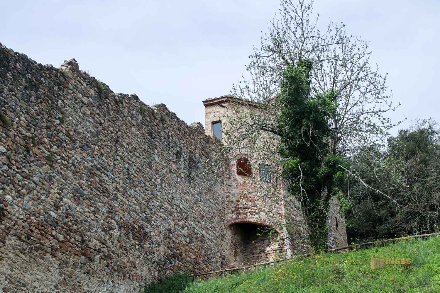 Sechs Meter wurde die Stadtmauer hochgezogen, die man jetzt noch rechts von der kleinen Provinzstraße sehen kann und hier auf meinen Fotos. Das alles geschah im 15. Jahrhundert. Drei Wachtürme integrierte man in die Mauer, einer durfte außerhalb stehen. Petriolo gehört zu Provinz Siena, und die Republik ließ natürlich keinen Besucher in die Therme innerhalb der Mauern, ohne Eintrittsgeld zu kassieren.