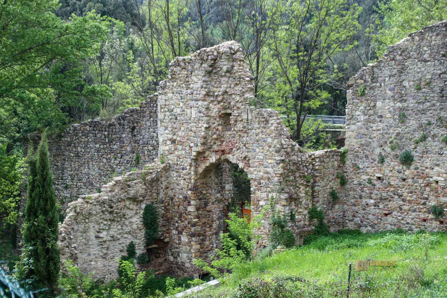 Auf der anderen Seite der kleinen Provinzstraße setzen sich die Mauerreste fort. Ja, wenn diese alte Mauern reden könnten, dann könnten die bestimmt so manche Story über ihre Besitzer erzählen, und wie die mit ihnen umgegangen sind. Nach 1700 wurden die Mauern nämlich teilweise abgerissen um Material für den Bau einer Fabrik zu haben. Auf dem ganzen Gelände machte sich Gestrüpp breit.