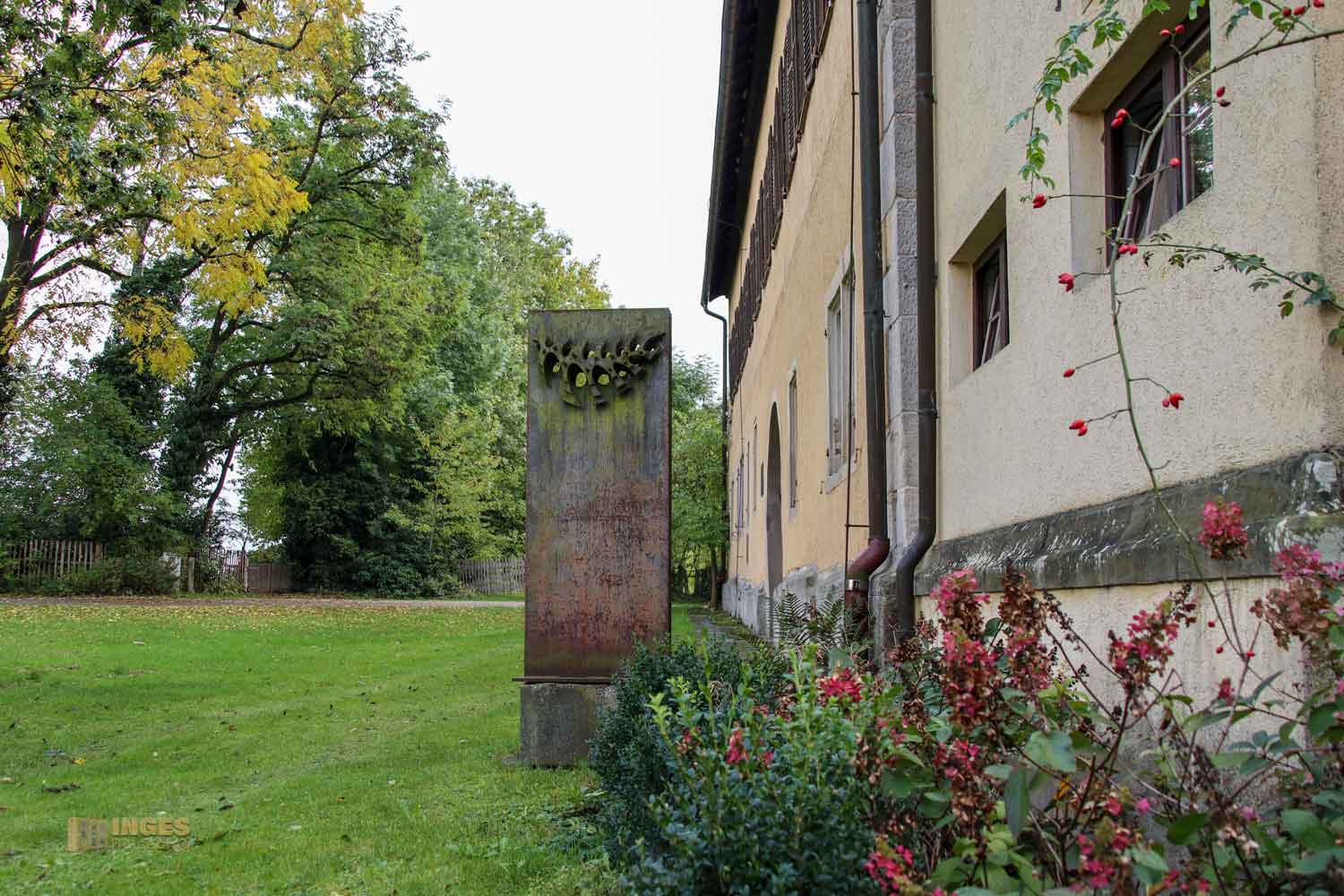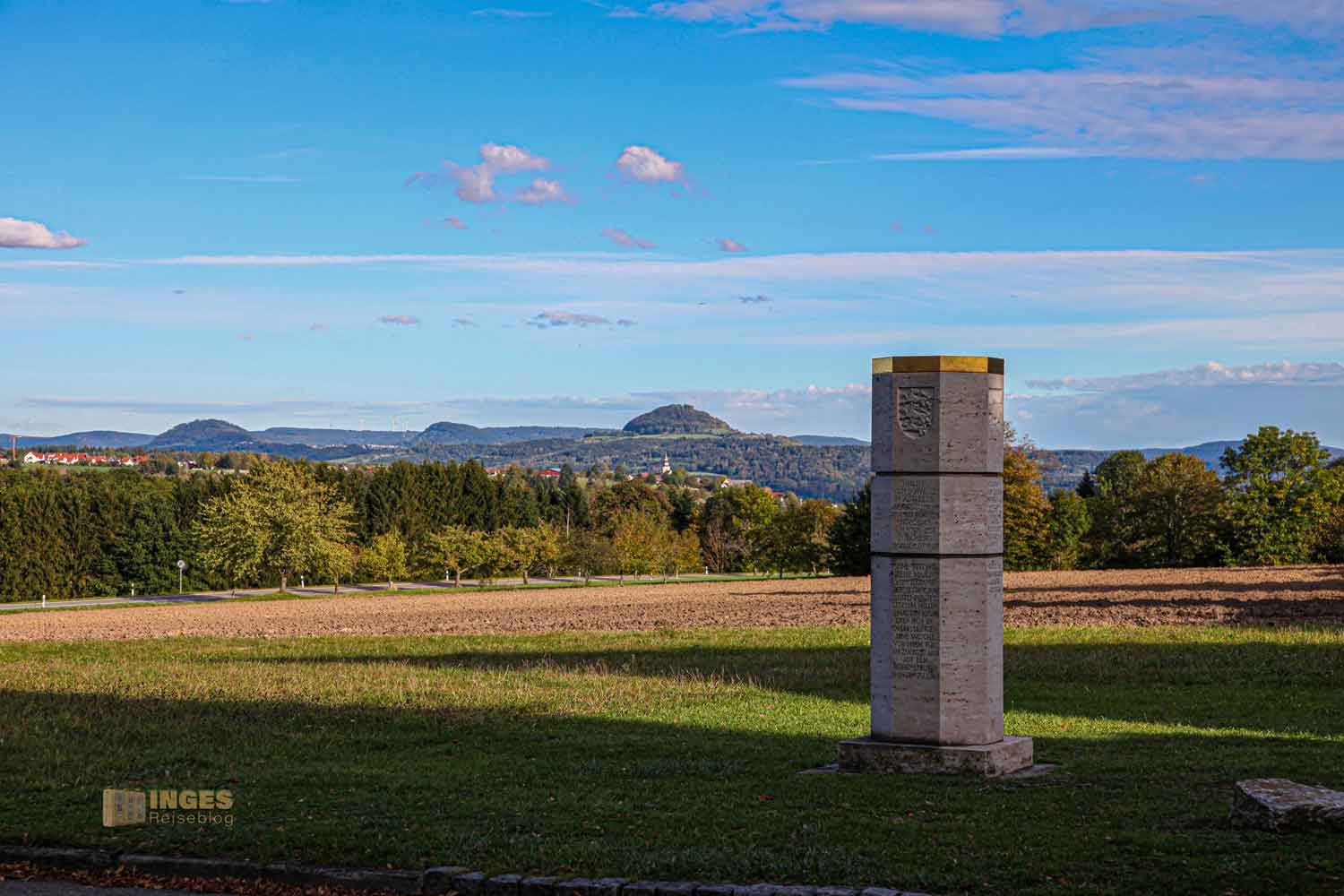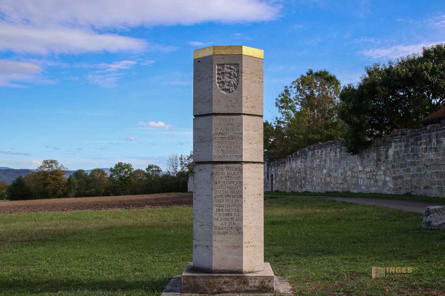 Wir haben den Besuch an diesem herrlichen Oktobertag mit einem Ausflug an den Herrenbachstausee, der gleich unterhalb des Klosterbereiches liegt, verbunden. Die Fahrt von meinem Heimatort Waldstetten führt an den Drei Kaiser Bergen entlang. Start unterhalb unseres Hausberges Stuifen, weiter an der Ruine Hohenrechberg vorbei, und auch dem Hohenstaufen haben wir einen Blick von unten geschenkt. Wir sind quasi auf den Spuren der Staufer unterwegs, die mit dem Hohenstaufen hier ja ihre Stammburg hatten. Es überrascht somit nicht, wenn diese Spuren sich weiter ins Kloster Adelberg ziehen. Wer sich nicht so in die Geschichte der Staufer eingelesen hat, wie ich, dem wird es vor Betreten des Klosterareals mit der Stauferstele aufgezeigt.