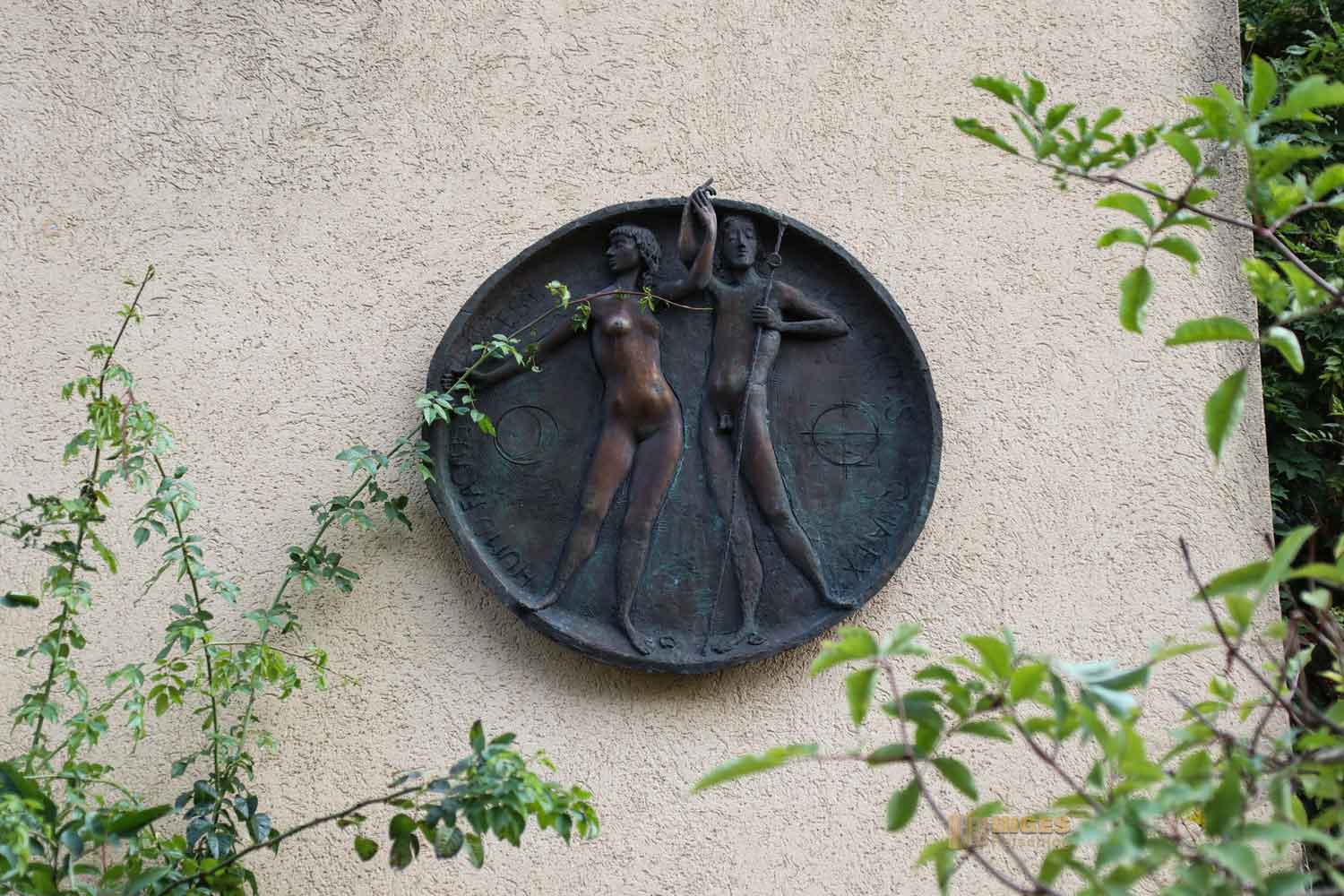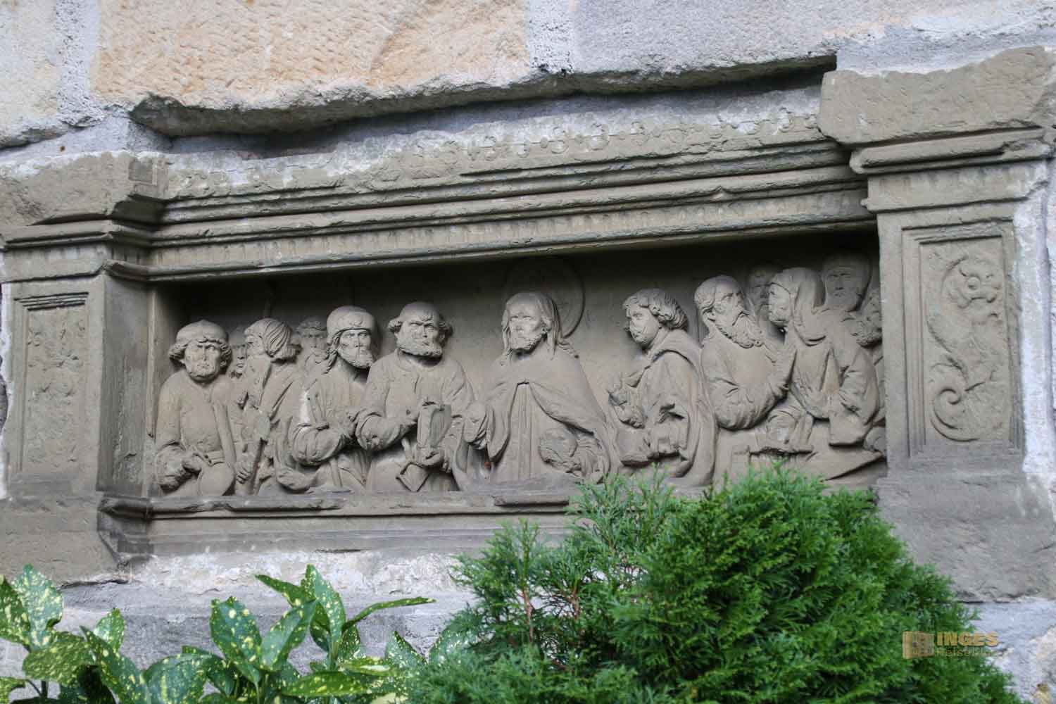 Es gibt auch im Friedhof viele kleine Details - Epitaphe oder das Wandrelief mit dem Abendmahl. Gütig schauen die beiden Namenspatrone der Kirche in einem großen Relief. Unübersehbar ist aber