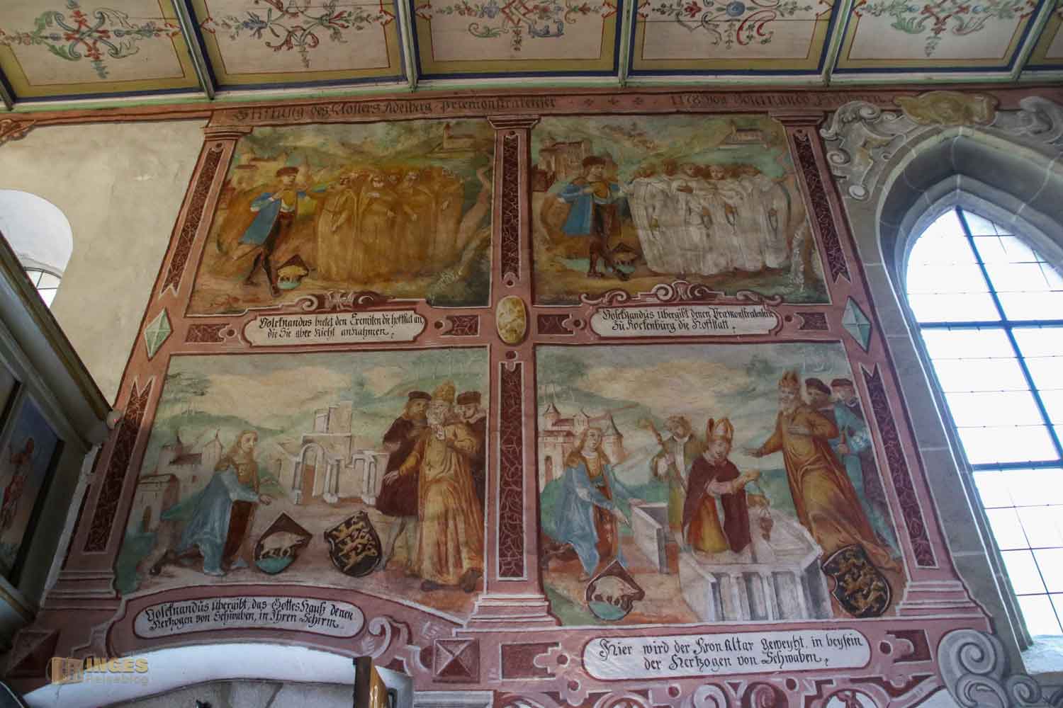 "Eine Kapelle erzählt ihre Geschichte in Bildern" - so würde ich dieses Kleinod auf dem Klostergelände beschreiben. Denn der Bilderzyklus, der euch im Inneren der Kapelle erwartet, erzählt nichts anderes als die eigene Gründungsgeschichte. Über die Probleme Volknands weil niemand in seinen Konvent auf der Höhe ziehen wollte und es sich dann doch noch jemand fand, der seine Idee in die Tat umsetzen ließ. Wie der Stauferkaiser Friedrich zur Weihe des Hochaltars kommt ... und, und, und ....