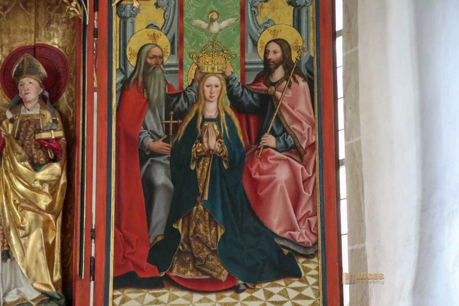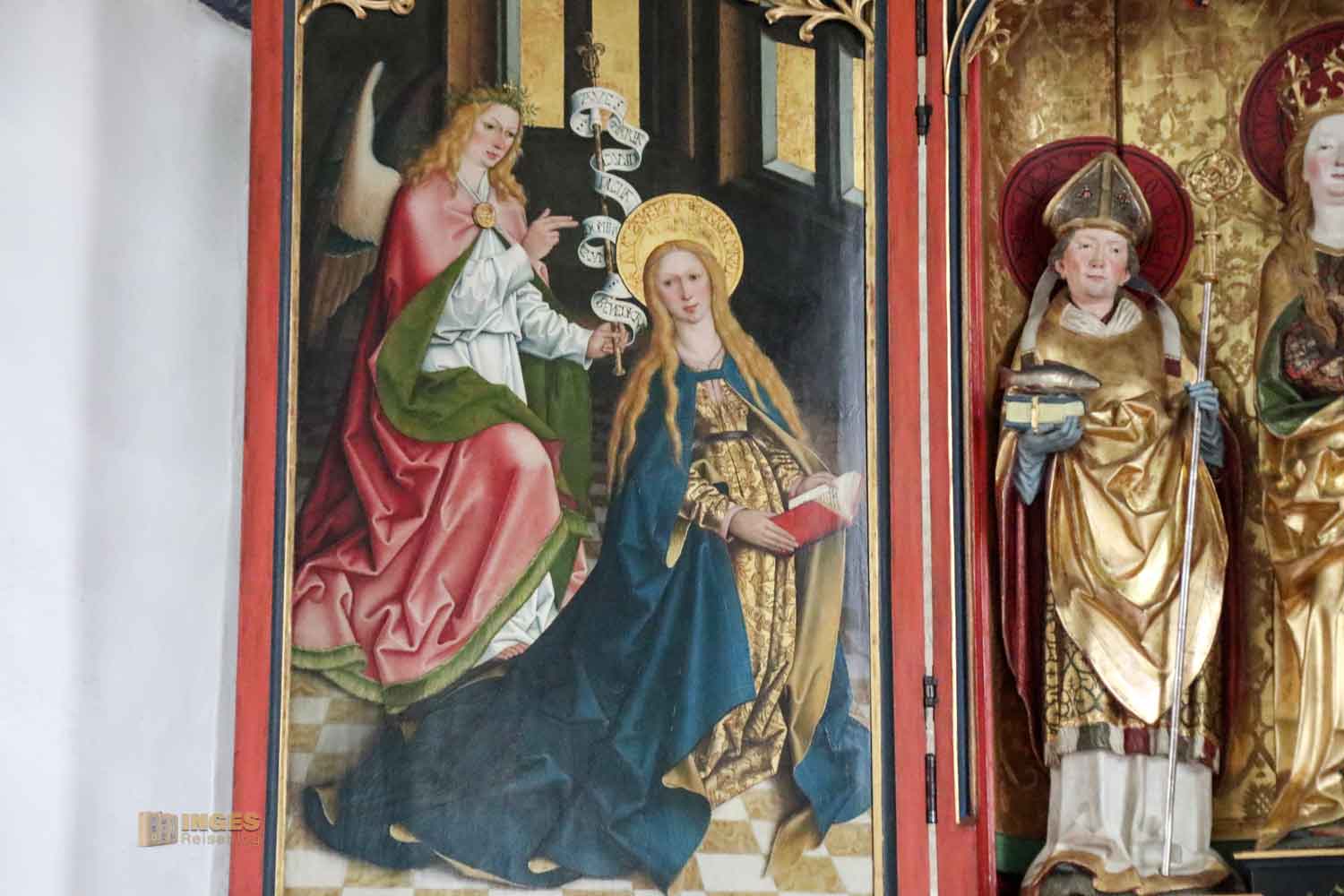 Der Altar hat sich so gut wie im Originalzustand erhalten. Etwa um 1500 gab der damalige Abt den Auftrag für den Flügelaltar an eine Ulmer Schule. Und wie es bei Flügelaltären so üblich ist, gibt es eine Festtagsseite, die heute bei der Hochzeit zu sehen war, und eine geschlossene Alltagsseite. Ohne großes Drumherum zeigt es die Geburt Christi. Schlicht gemalt, aber wunderschön.