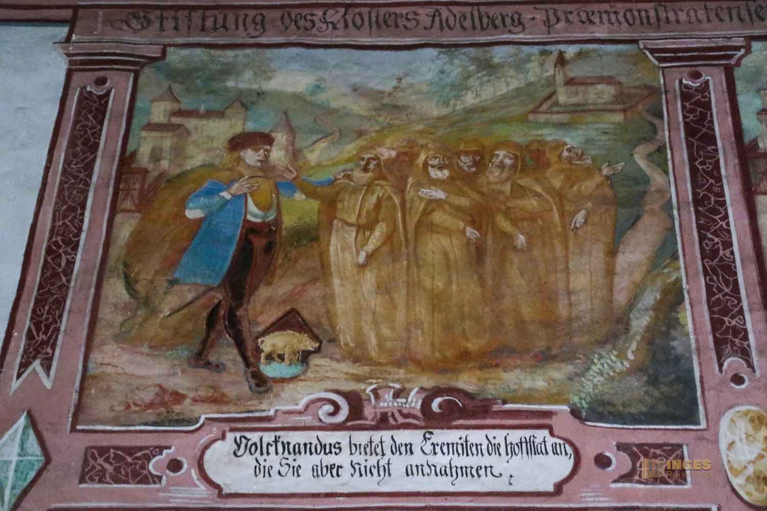 Immer wieder berührend sind die Geschichten wie Städte oder Objekte vor Zerstörung gerettet werden. War es ein kleines Mädchen, das Dinkelsbühl vor einem Angriff der Schweden gerettet hat - oder in Nördlingen war es ein Schwein, das durch seine Entdeckung die Angreifer in die Flucht geschlagen hatte, so soll es im Kloster Adelberg ein Bauer gewesen sein, der die Kirche vor Zerstörung in den Bauernaufständen im 16. Jahrhundert gerettet haben soll. War die Kirche ursprünglich mal als Friedhofskapelle gedacht gewesen, wurde sie zu dieser Zeit immer mehr zur 'Kirche der Leute'. Der Bauer soll die Angreifer um Verschonung gefleht haben, 'denn sonst habe er ja keinen Platz zum Beten mehr'. Die Kapelle wurde verschont, das Kloster teilweise zerstört.