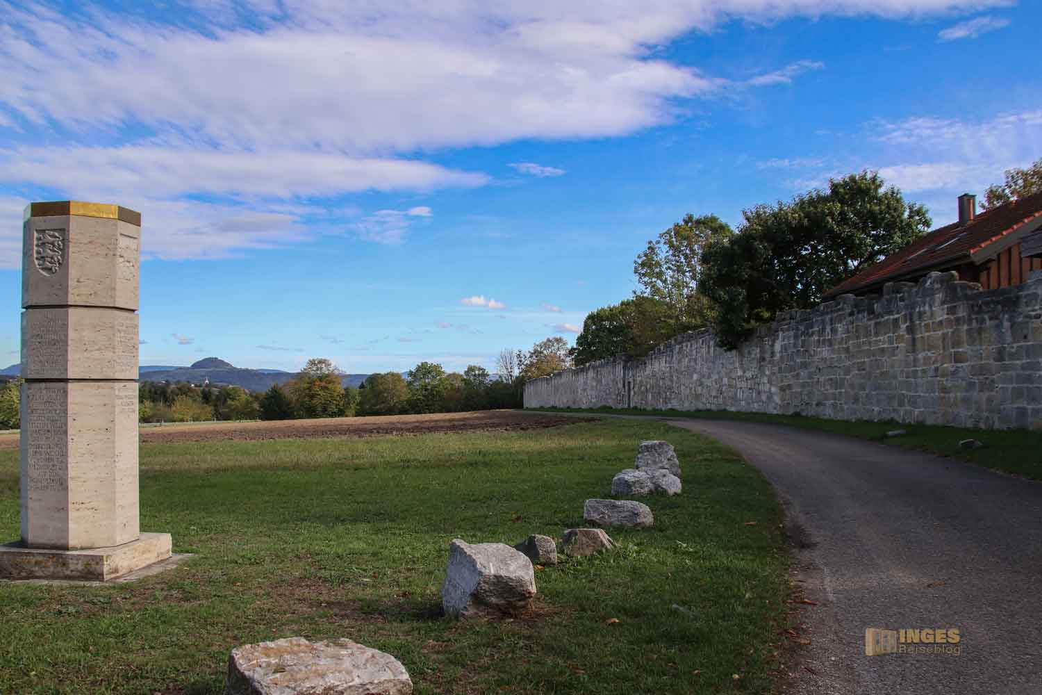 beginnen, genießt die Blicke auf meine Heimatberge. Von rechts nach links fädeln sich der Hohenstaufen, der Hohenrechberg und der Stuifen in einer Reihe auf. Herrlich, gell? Und einen Eindruck von der langen Klostermauer bekommt ihr auch gleich.